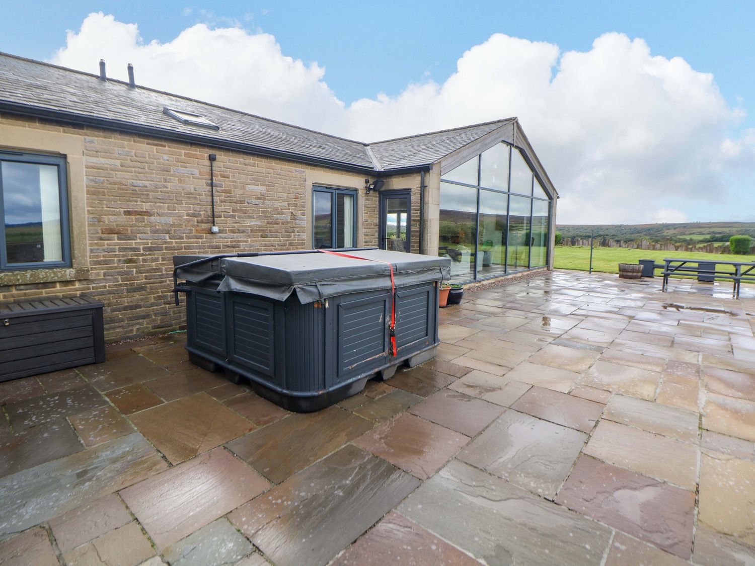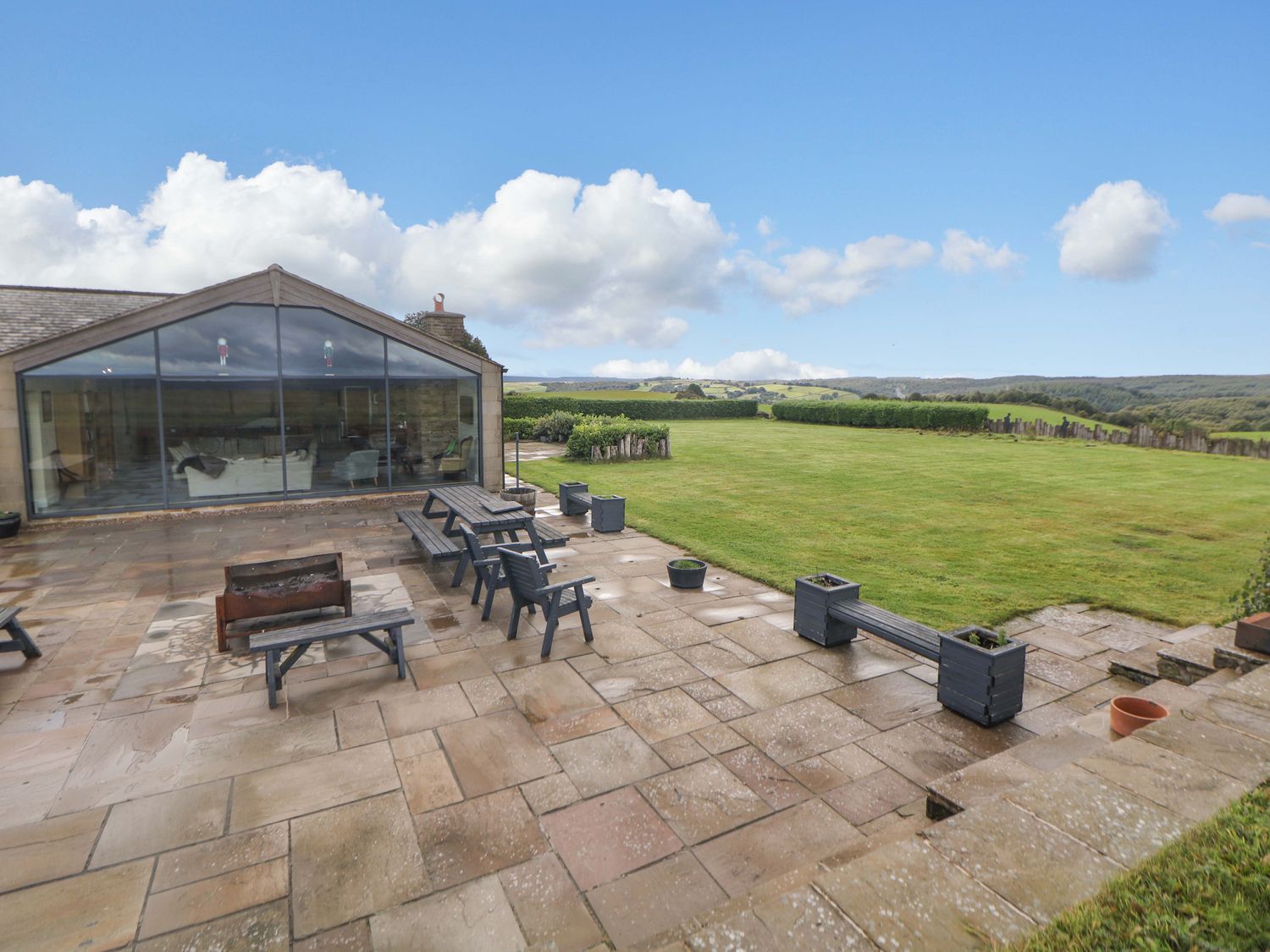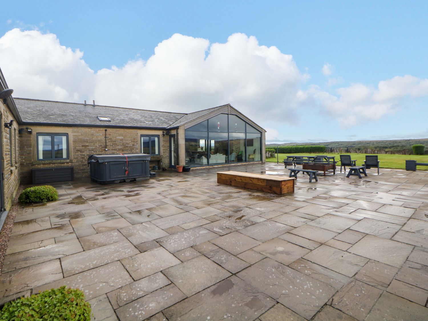 "Highgate House consists of an open-plan living space with kitchen, dining and sitting area with woodburning stove, a cloakroom with basin and WC, a Jack-and-Jill cloakroom with basin and WC, and a bathroom with freestanding bath, walk-in shower, basin and WC. 1 x king-size, 1 x single sofa bed, TV with jack and Jill basin and wc, 1 x double with Jack and Jill WC, 1 x double bed, 1 x double sofa bed with en-suite walk-in shower, basin and WC, 1 x family room with 1 x double, 2 x single with additional single sofa bed. Central heating. Rangemaster oven and hob, microwave, fridge/freezer, dishwasher, washing machine. TV, WiFi, pool table, piano. Fuel, power, bed linen and towels are all included in the price. Off-road parking. Front patio with furniture. Enclosed rear garden with lawn, patio, furniture and hot tub. Sorry, no pets and no smoking. Shop 2.2 miles, pub 1.1 miles. Note: There is a 200 GBP Good Housekeeping bond to be paid directly to the owner."
