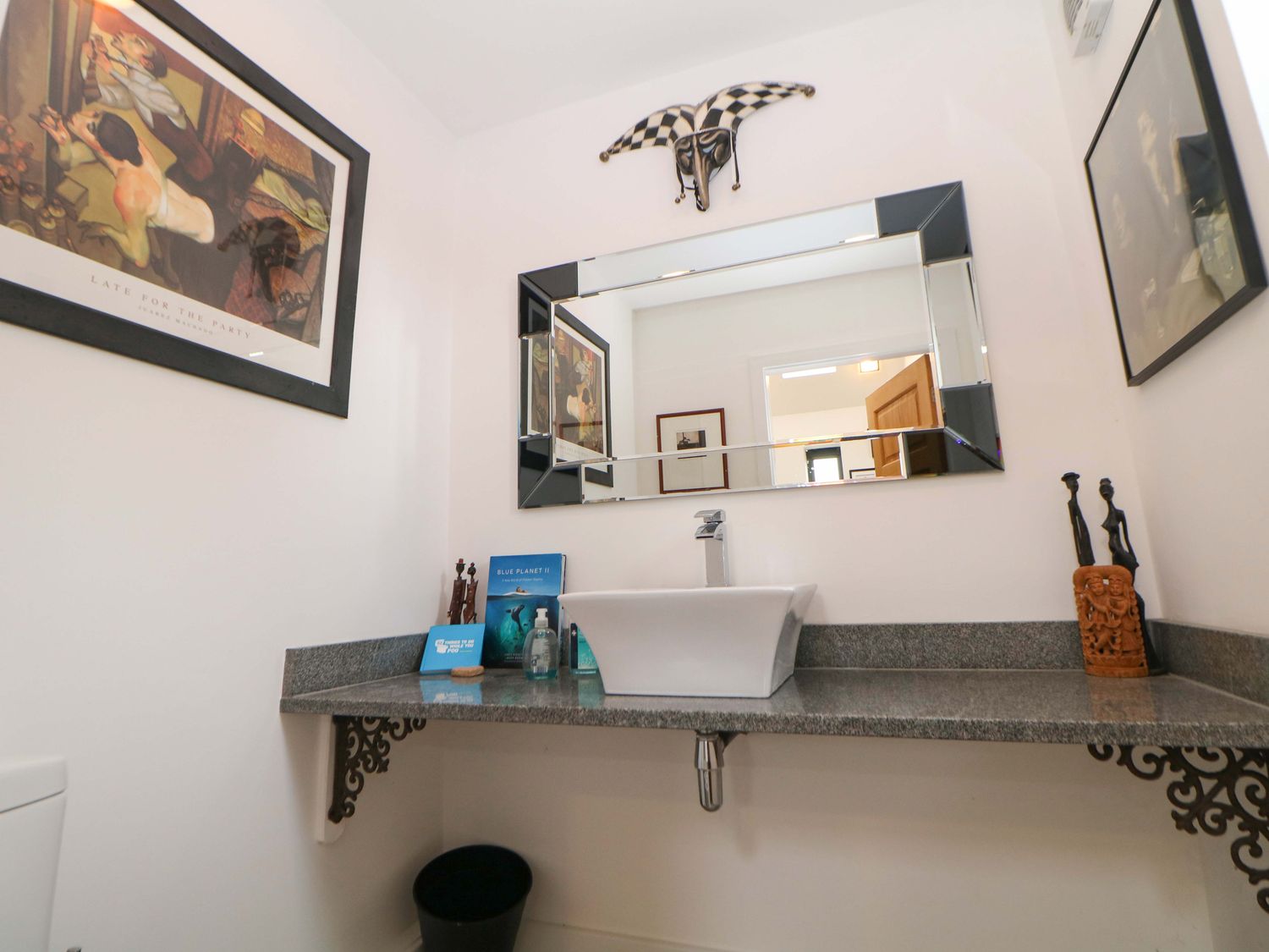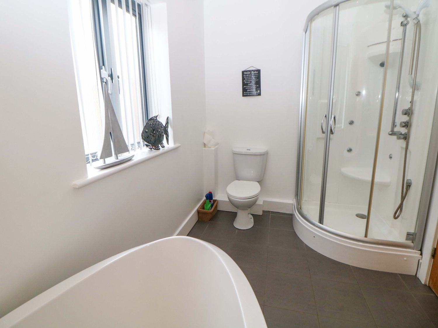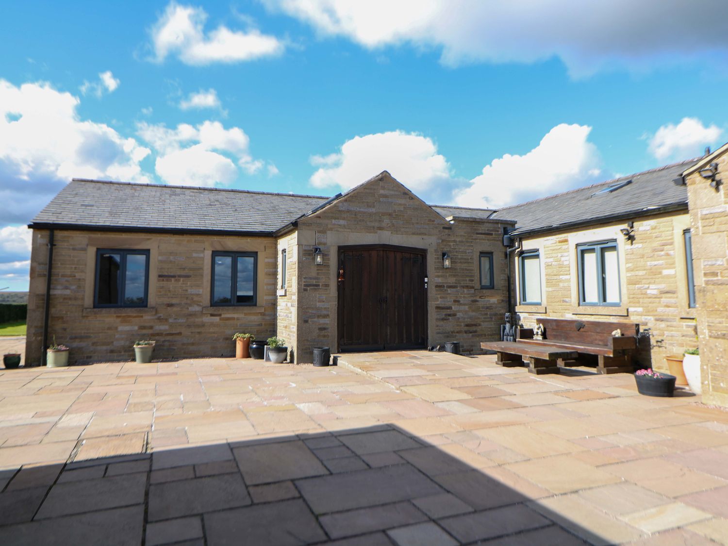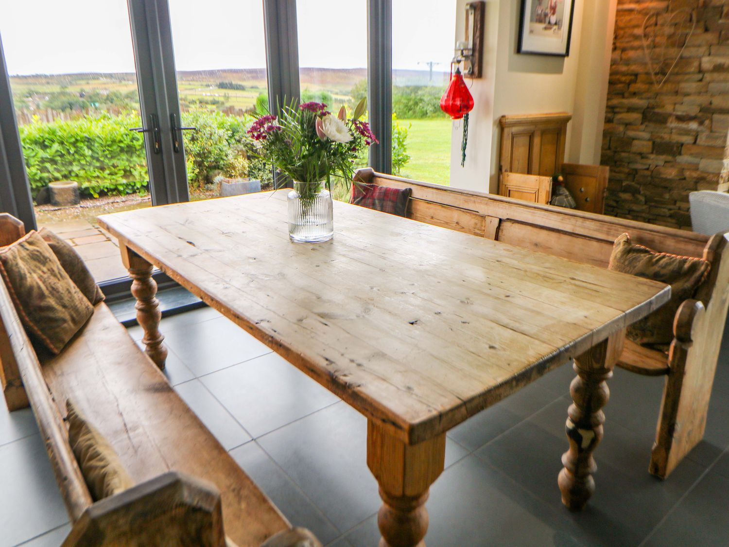 "Highgate House consists of an open-plan living space with kitchen, dining and sitting area with woodburning stove, a cloakroom with basin and WC, a Jack-and-Jill cloakroom with basin and WC, and a bathroom with freestanding bath, walk-in shower, basin and WC. 1 x king-size, 1 x single sofa bed, TV with jack and Jill basin and wc, 1 x double with Jack and Jill WC, 1 x double bed, 1 x double sofa bed with en-suite walk-in shower, basin and WC, 1 x family room with 1 x double, 2 x single with additional single sofa bed. Central heating. Rangemaster oven and hob, microwave, fridge/freezer, dishwasher, washing machine. TV, WiFi, pool table, piano. Fuel, power, bed linen and towels are all included in the price. Off-road parking. Front patio with furniture. Enclosed rear garden with lawn, patio, furniture and hot tub. Sorry, no pets and no smoking. Shop 2.2 miles, pub 1.1 miles. Note: There is a 200 GBP Good Housekeeping bond to be paid directly to the owner."