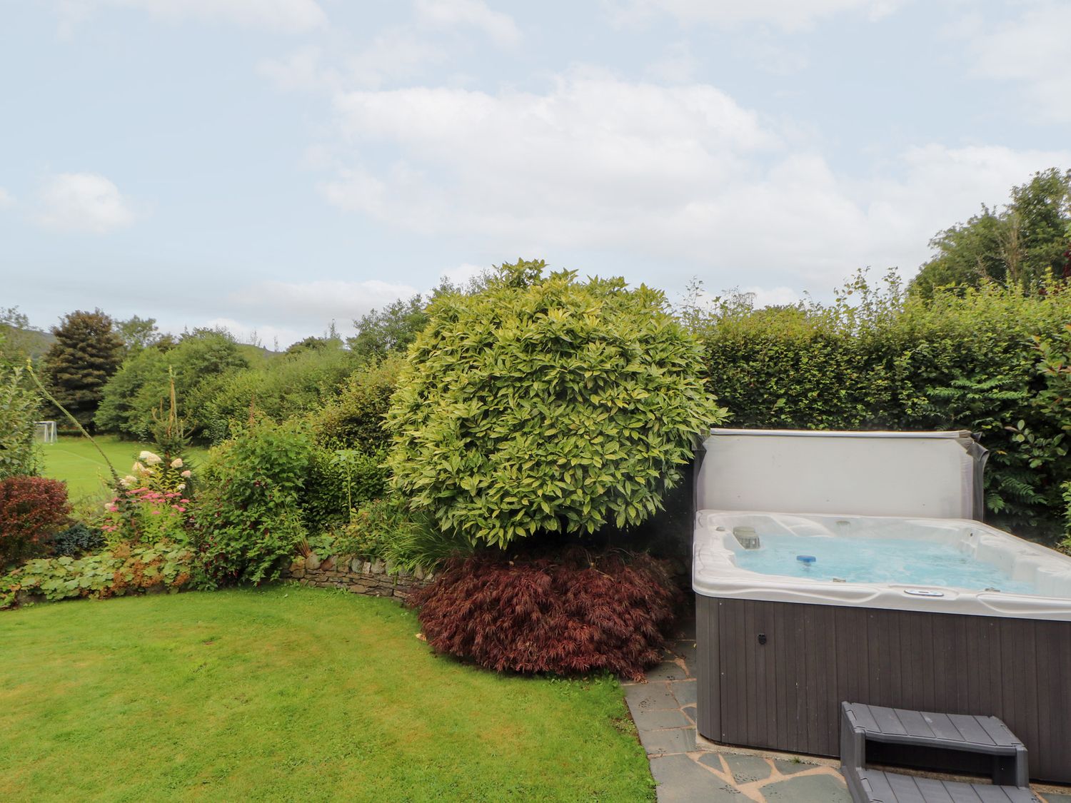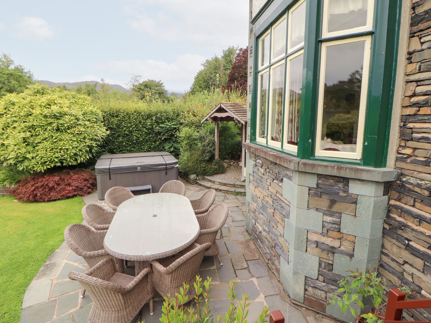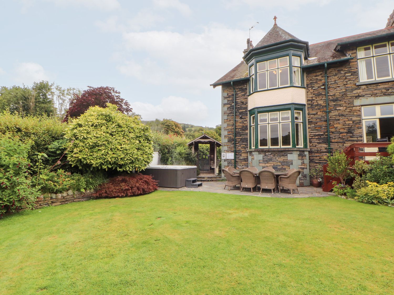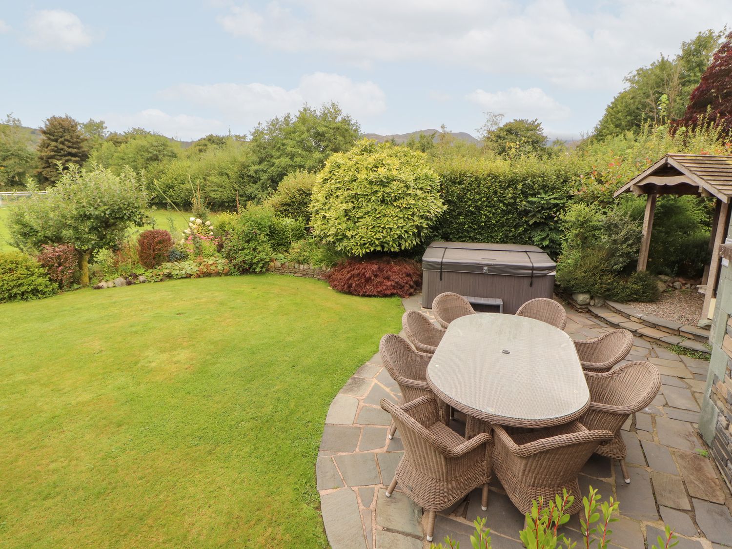 "Bracken Howe consists of a kitchen with range cooker with double electric oven and gas hob, microwave, fridge, freezer, coffee maker, kettle, toaster, dining room with seating for ten people, sitting room with Smart TV and open fire, utility with washing machine and tumble dryer. The bedrooms consist of two four poster king-size beds with Smart TV, Blu Ray players, and en-suites, one king-size zip/link with Smart TV, Blue Ray player, and en-suite, one double with Smart TV and Blu Ray player, and a twin with Smart TV and Blu Ray player, along with two bathrooms and a cloakroom. Outside, there is an enclosed garden with lawn, patio, raised decking, furniture, hot tub, and barbecue, with private driveway parking for five cars. Travel cot and highchair available on request. Sorry, no pets. Sorry, no smoking. WiFi, fuel, power, bed linen, and towels are all inc. in rent. Bracken Howe is an excellent base for a Cumbria escape. Note: Property has underfloor heating"