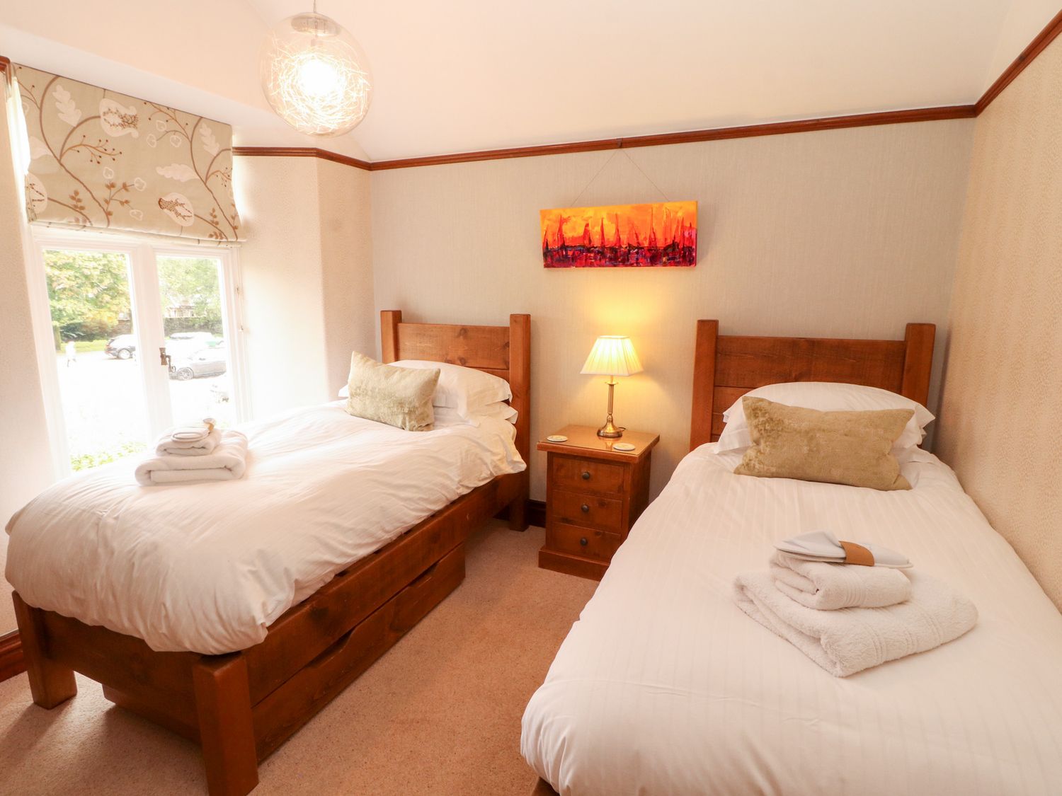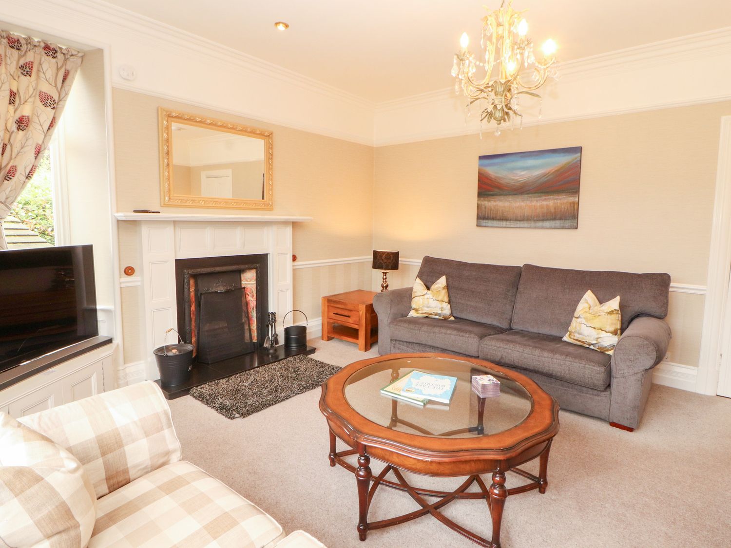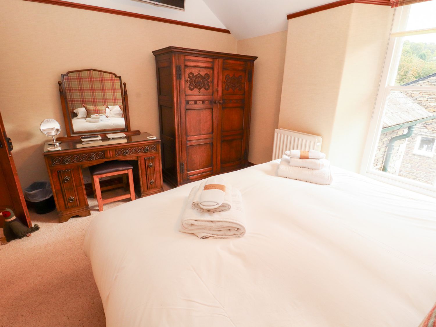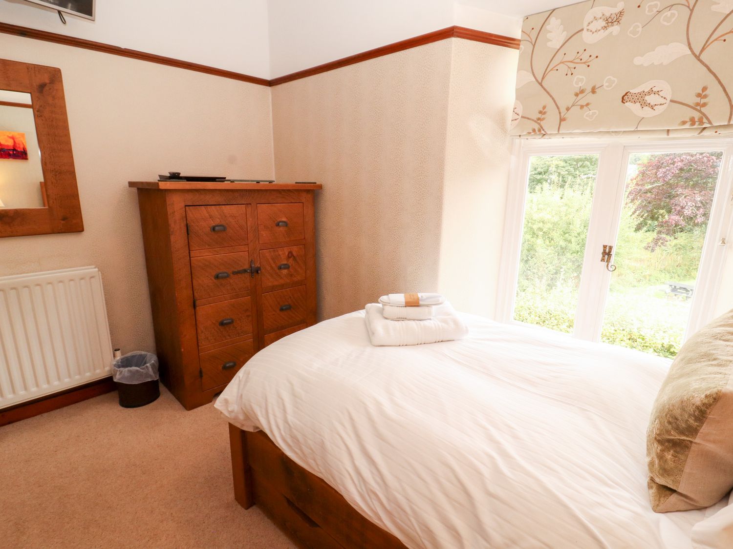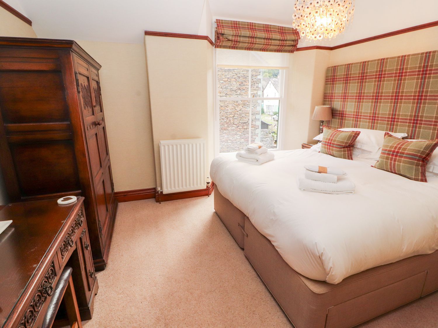 "Bracken Howe consists of a kitchen with range cooker with double electric oven and gas hob, microwave, fridge, freezer, coffee maker, kettle, toaster, dining room with seating for ten people, sitting room with Smart TV and open fire, utility with washing machine and tumble dryer. The bedrooms consist of two four poster king-size beds with Smart TV, Blu Ray players, and en-suites, one king-size zip/link with Smart TV, Blue Ray player, and en-suite, one double with Smart TV and Blu Ray player, and a twin with Smart TV and Blu Ray player, along with two bathrooms and a cloakroom. Outside, there is an enclosed garden with lawn, patio, raised decking, furniture, hot tub, and barbecue, with private driveway parking for five cars. Travel cot and highchair available on request. Sorry, no pets. Sorry, no smoking. WiFi, fuel, power, bed linen, and towels are all inc. in rent. Bracken Howe is an excellent base for a Cumbria escape. Note: Property has underfloor heating"