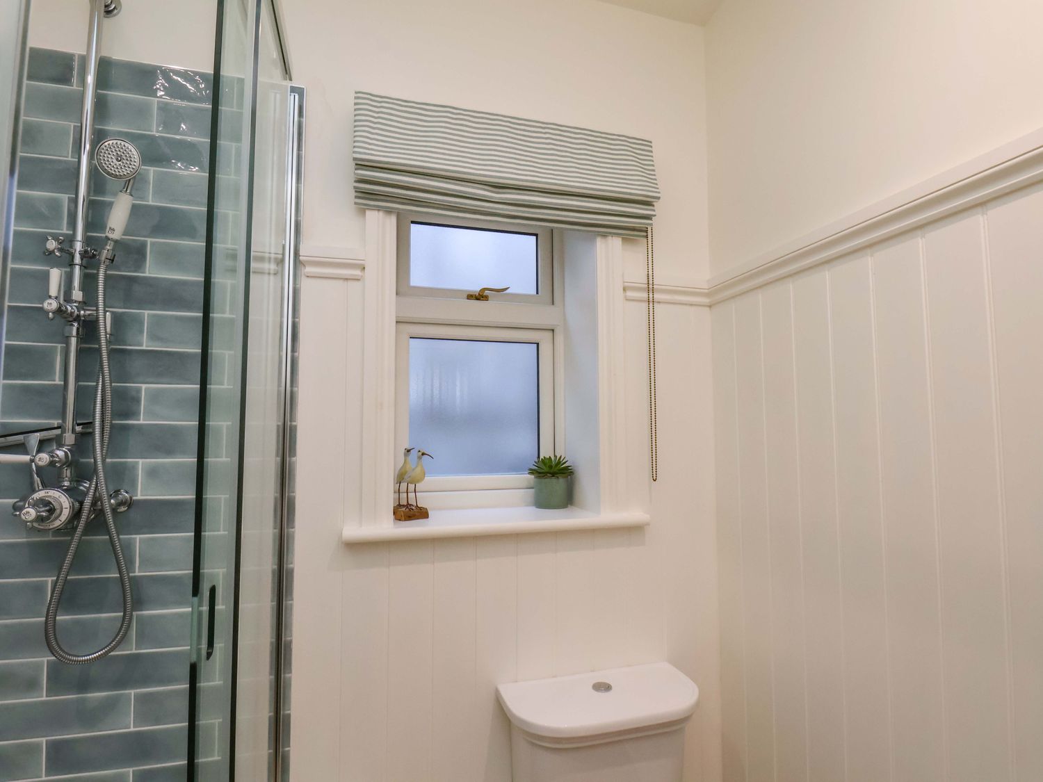 "Single-storey. Two bedrooms: 1 x double, 1 x twin. Bathroom with bath, handheld shower, basin, heated towel rail, and WC. Shower room with walk-in shower, basin, and WC. Boot room with washing machine. Open-plan living space with log burner, kitchen, dining area, and sitting area"