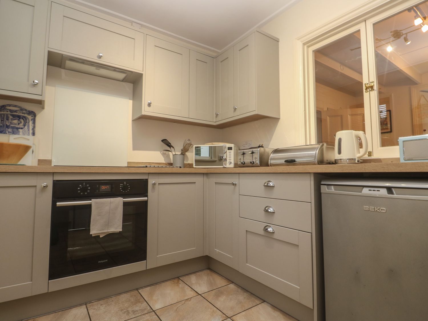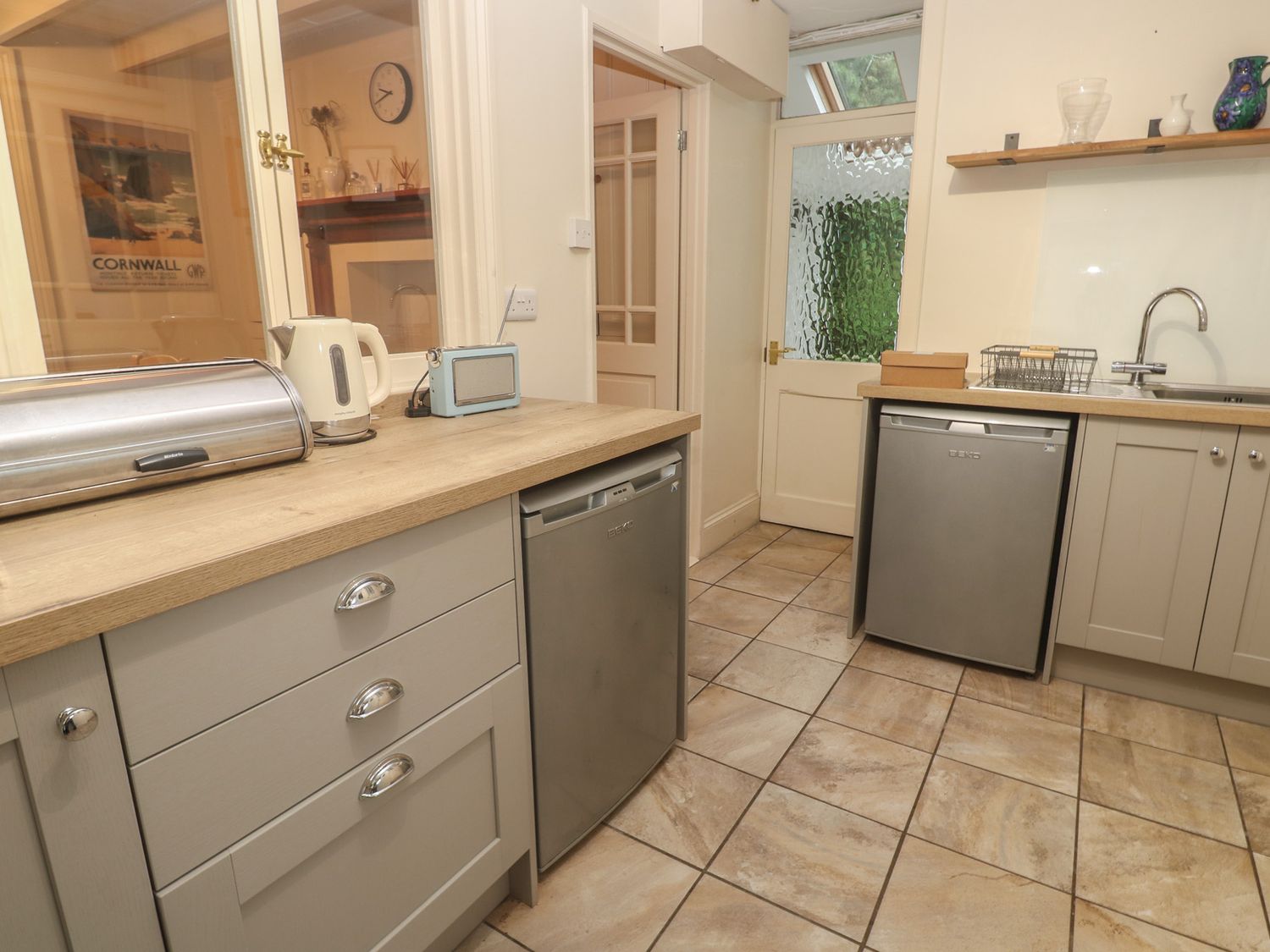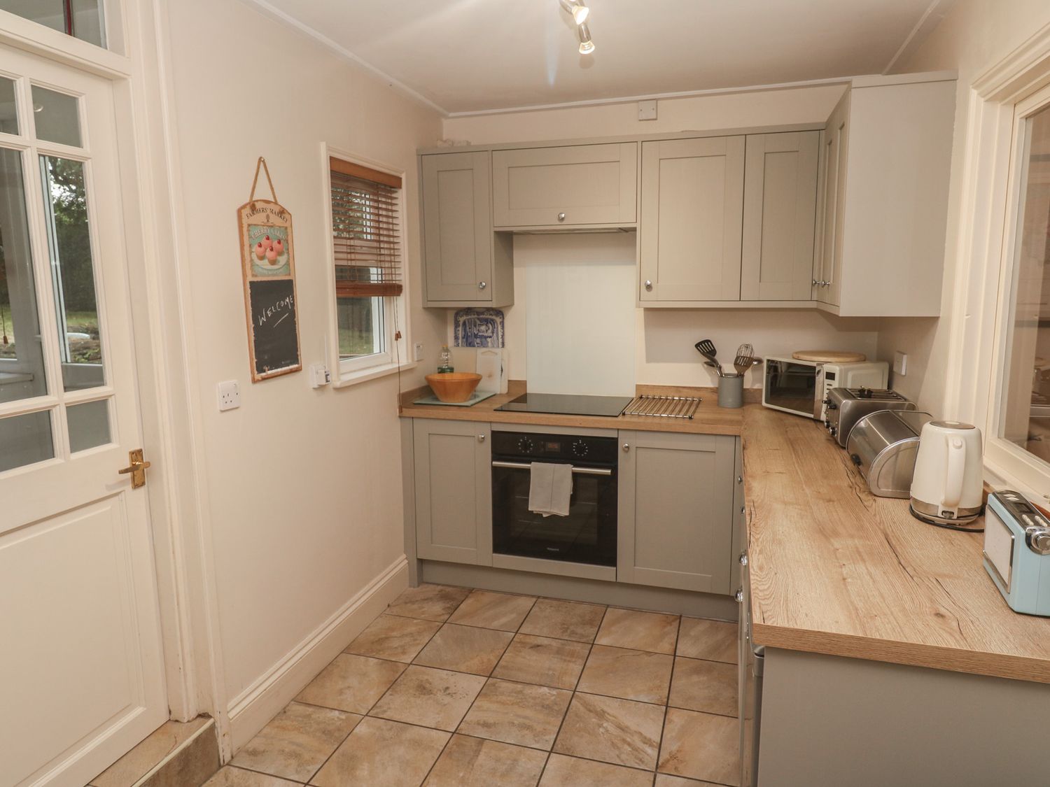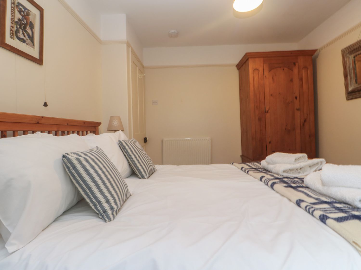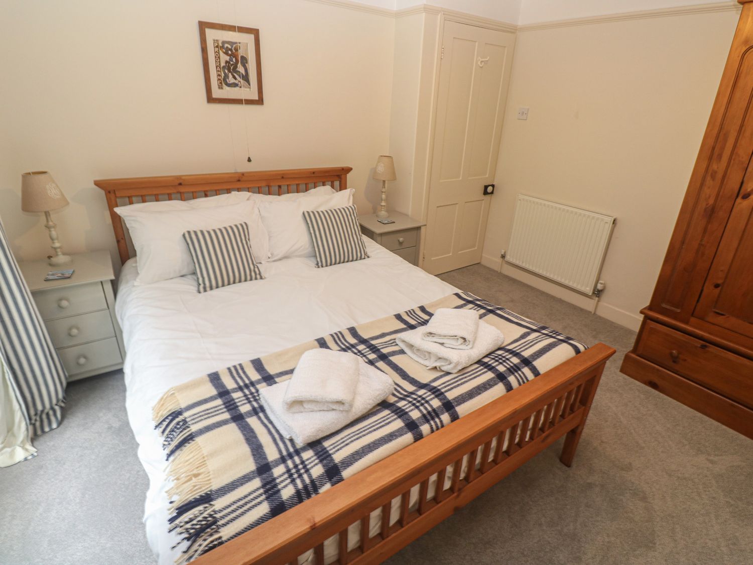 "Over two levels. Four bedrooms: 1 x king-size double with TV and en-suite bathroom with bath, shower over, basin and WC, 1 x king-size double, 2 x single. Bathroom with bath, shower over, basin and WC. Kitchen, utility room, dining room, sitting room with open fire, WC."