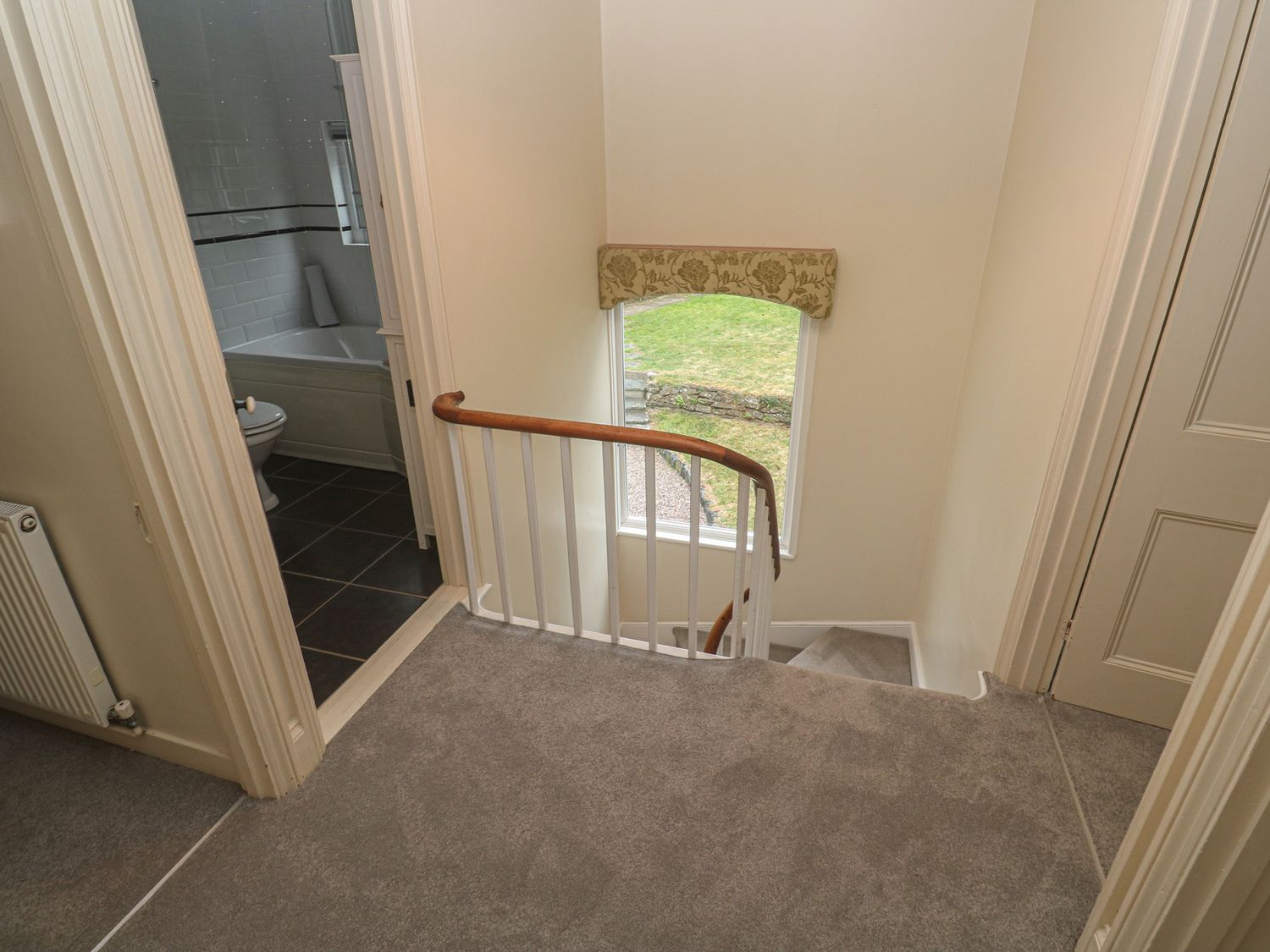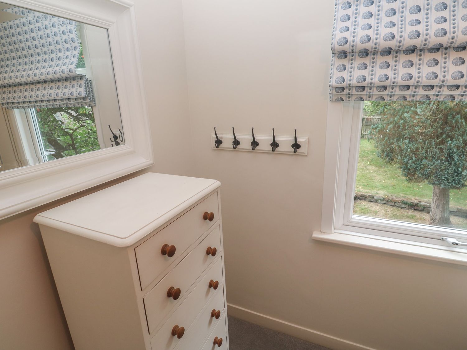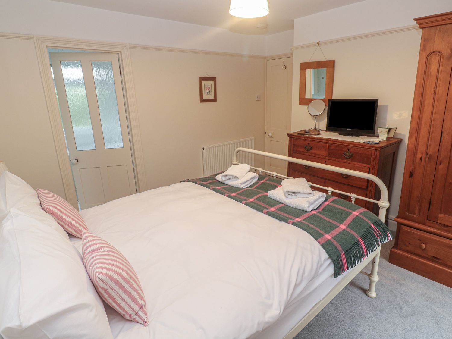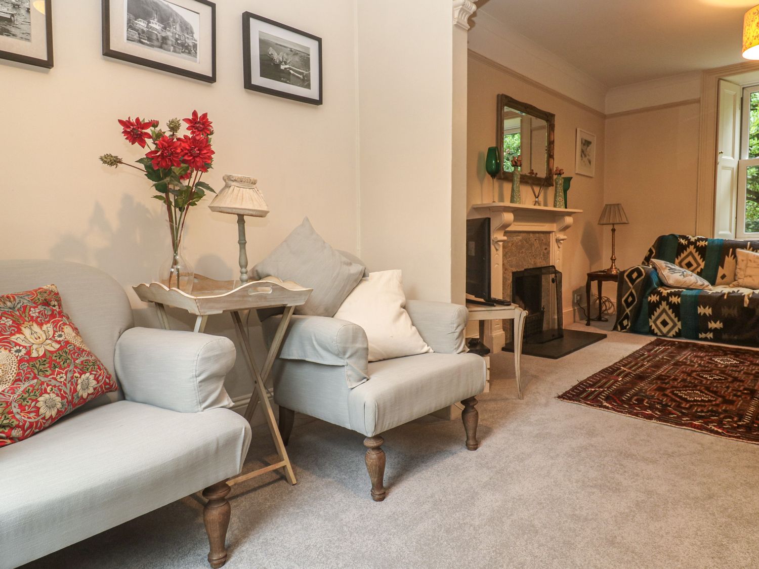 "Over two levels. Four bedrooms: 1 x king-size double with TV and en-suite bathroom with bath, shower over, basin and WC, 1 x king-size double, 2 x single. Bathroom with bath, shower over, basin and WC. Kitchen, utility room, dining room, sitting room with open fire, WC."