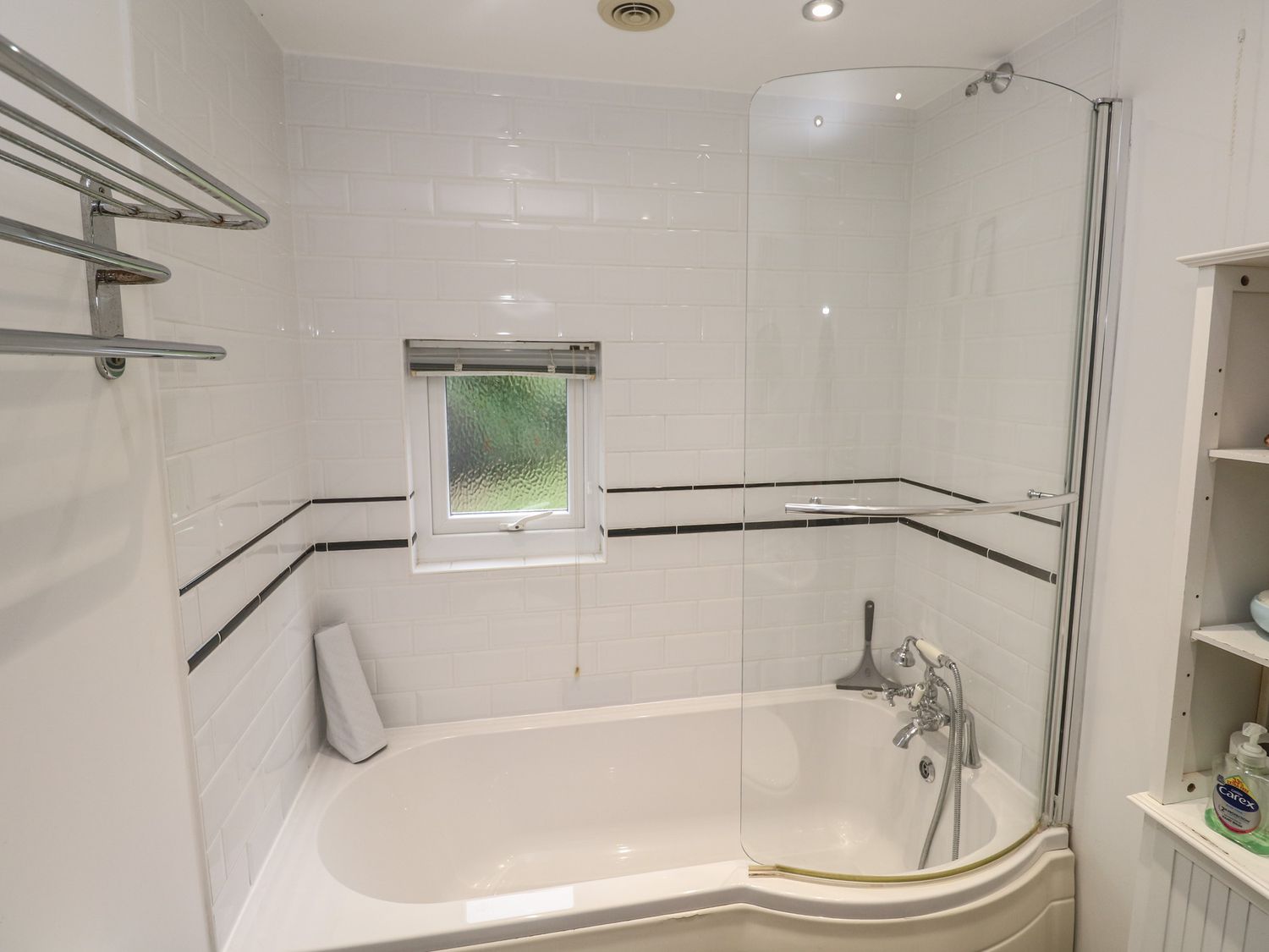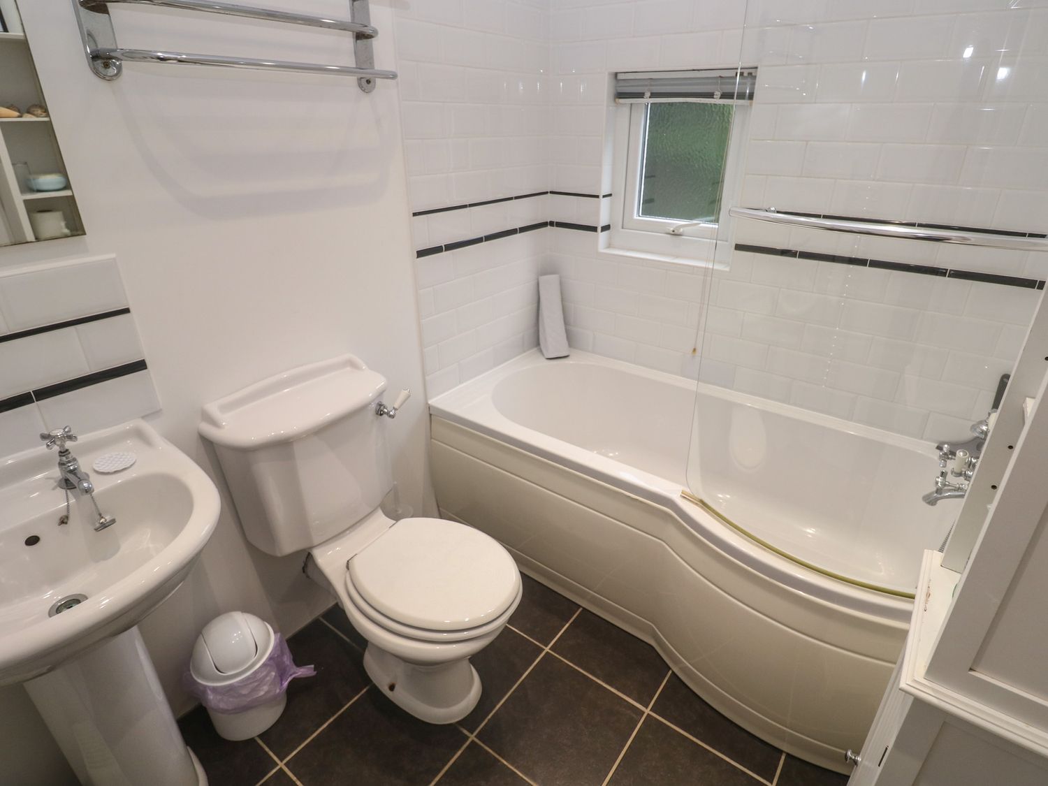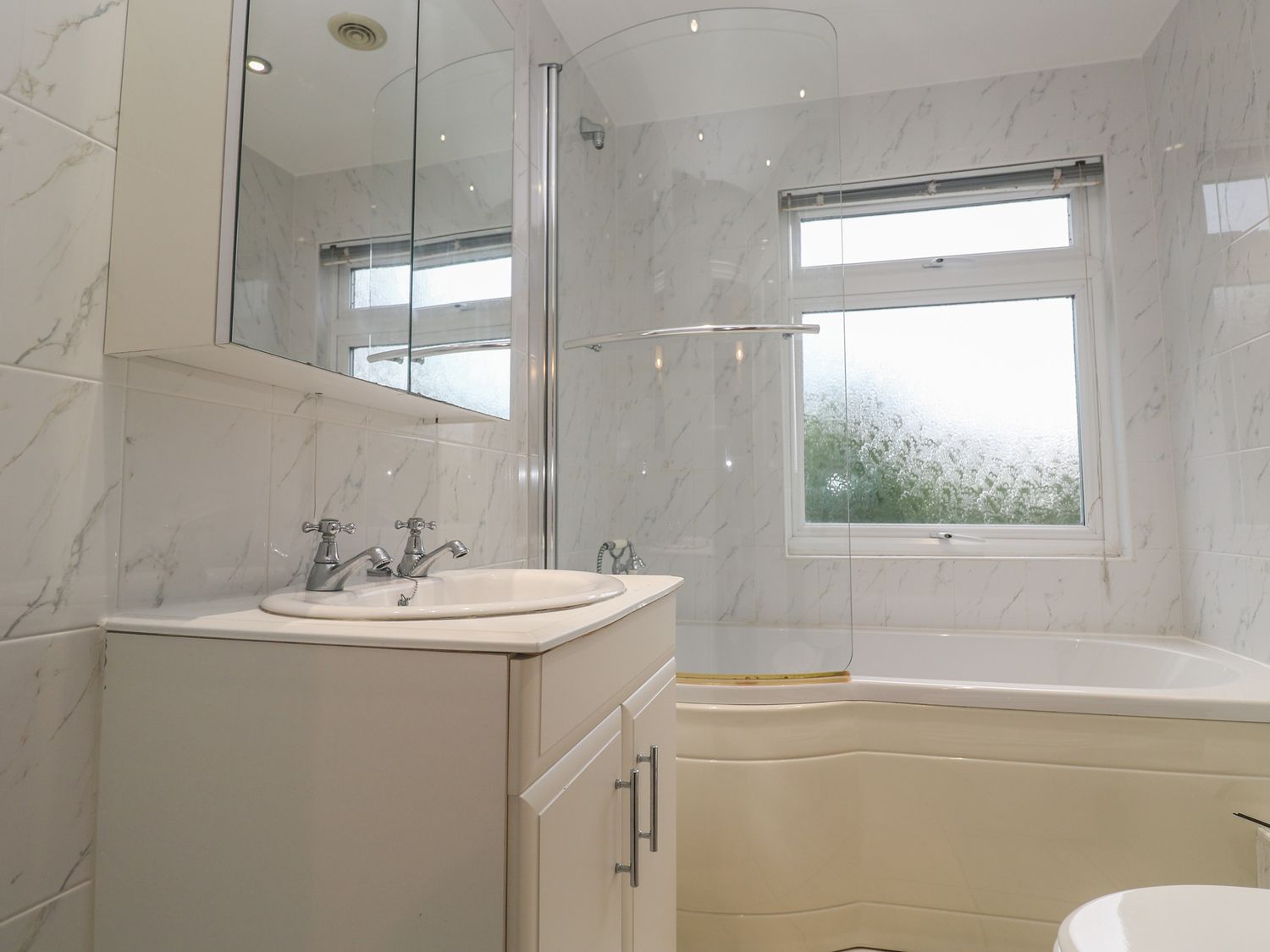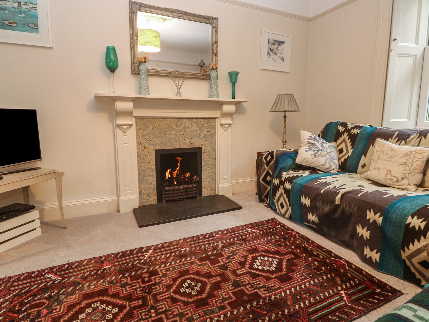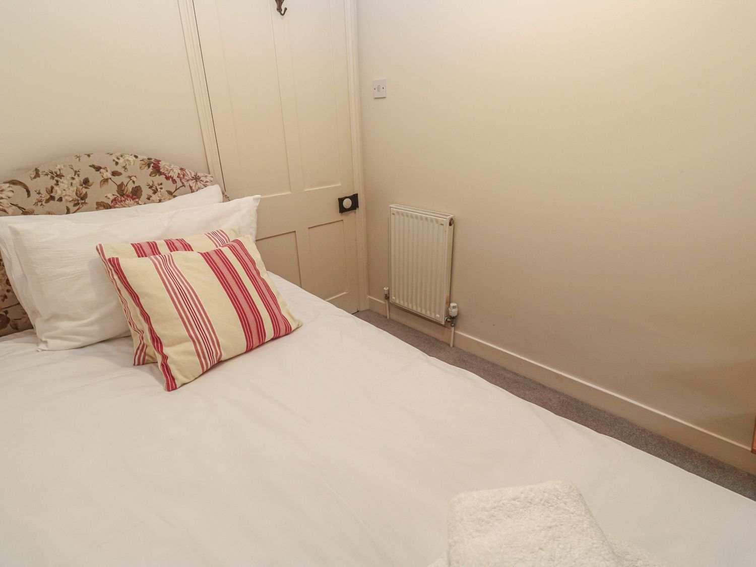 "Over two levels. Four bedrooms: 1 x king-size double with TV and en-suite bathroom with bath, shower over, basin and WC, 1 x king-size double, 2 x single. Bathroom with bath, shower over, basin and WC. Kitchen, utility room, dining room, sitting room with open fire, WC."
