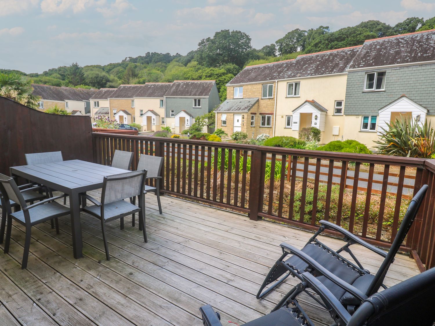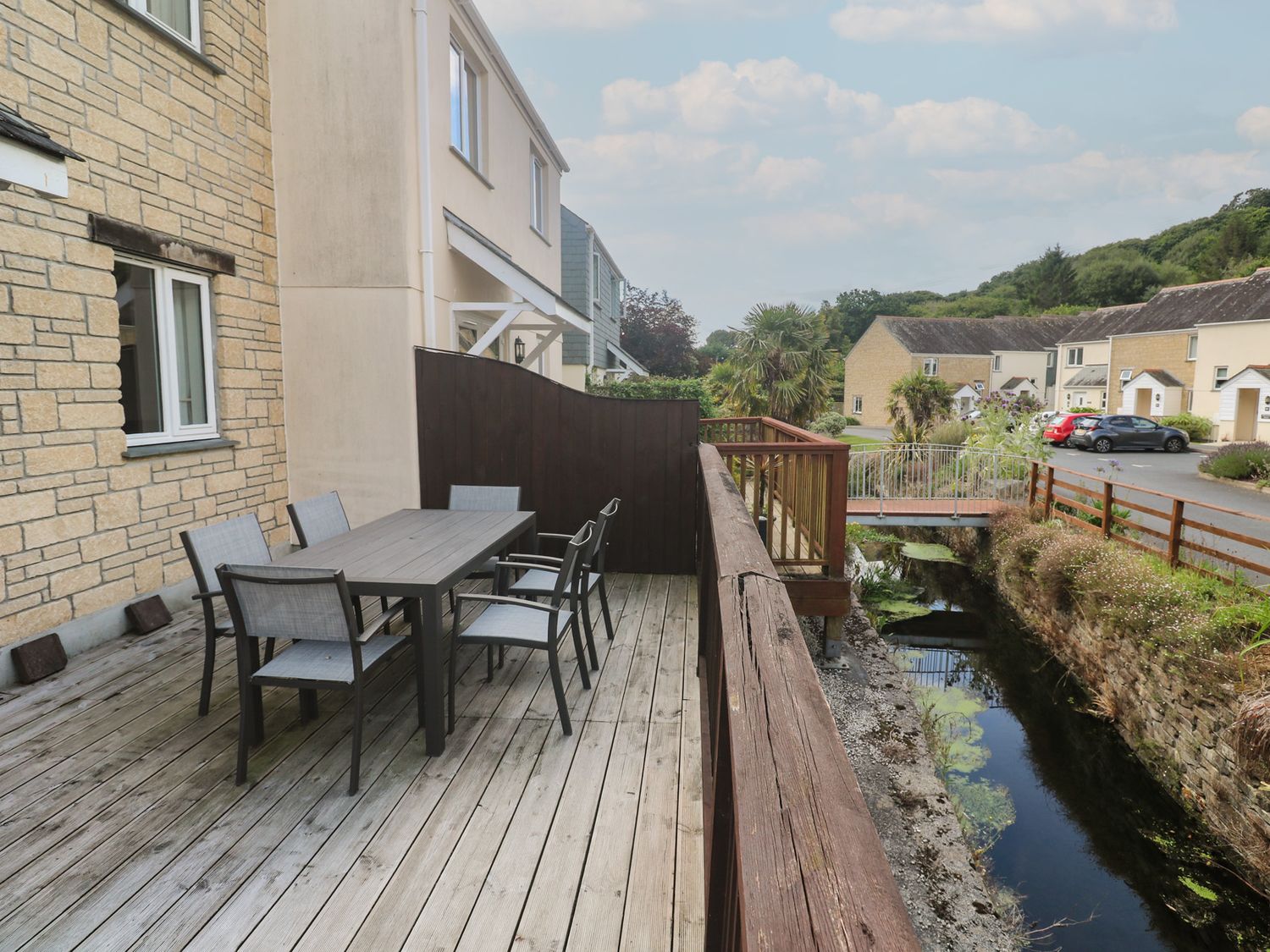 "Rosemary Cottage is a modern mid terrace house, part of the holiday Village of Gardens resort at Pendra Loweth. Onsite facilities include an indoor plunge pool (not available until Easter 2021), tennis courts and children-Æs outdoor play area. The cottage sleeps six people in two double bedrooms and one twin bedroom. The open plan living area with dining, kitchen and sitting area leads to a sunny decked terrace alongside a stream. There is off road allocated parking for one car. Located one mile from the closest beach at Swanpool, and a short drive of Falmouth resort attractions, Rosemary Cottage makes an ideal choice for a family holiday.