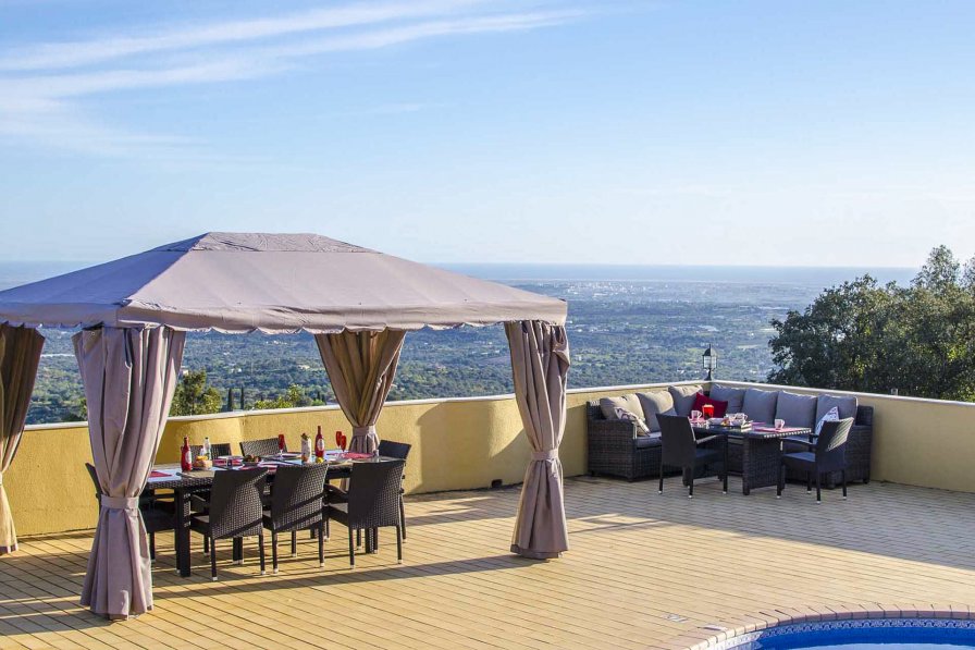 The Villa is situated in one of the more quiet areas of Quinta do Lago, ensuring you and your guests will have a peaceful stay. A glorious view overlooks the hills and coastline, which is quite a spectacle during dusk. The outdoor space is incredibly accommodating to a large party of guests and includes ten deck chairs surrounding a kidney fashioned swimming pool and two seating areas. After making good use of the barbecue, which is built onto the exterior of the kitchen, you can plate-up on a dining table that is shielded by a pergola. If you are trying to catch the remainder of the days sunshine, take a seat on the outdoor corner sofa and enjoy the inspiring view with a refreshing drink. To top this all off, an ample games room can be discovered under the pool area. This modern villa has an open floor plan. The kitchen is stocked with all the crucial appliances and is fitted with a sleek black marbled counter. It leads into the living and dining spaces, which are well lit during the day by the sliding doors that accommodate the spectacular sunrise. The ground floor has an en-suite double bedroom and an en-suite bedroom with two double beds, leading to the poolside. As you come up the stairs, the bedroom on the left side has a double bed, and the bedroom on the right has two double beds. Both bedrooms share a bathroom, as well as access to a terrace with pool and ocean views. The master bedroom concludes the layout of the first floor. It is ample space with a king bed and a plush Chaise Longue, from which you can enjoy the scenic view through sliding doors that lead onto a balcony. Although Villa Milreu has five bedrooms, it is capable of sleeping up to fourteen. #### Features The Villa Villa Milreu is a charming villa with a magnificent view over the sea and islands. Located in a tranquil area and with all the ingredients for an unforgettable holiday. There are 5 bedrooms and 4 bathrooms, and it can accommodate up to 10 people Lower Level - Games room Ground Floor - Double bedroom with en-suite bathroom - Twin bedroom with en-suite bathroom - Dining & living area - Fully equipped kitchen - Access to the patio & pool area First Floor - Double bedroom with en-suite bathroom - Double bedroom - Twin bedroom - Bathroom - Terrace Exterior - Swimming pool (10x5m) - Sun loungers & parasols - Outdoor lounge & dining area - Large patio & garden area - Covered terrace - Jacuzzi - BBQ area - Private parking #### Location Quinta Do Lago is considered to be one of the more impressive resorts along the Algarve. The estate is noted for its golf courses, tennis facilities and the well renowned Quinta shopping scene. This suitable family destination is conveniently positioned by many lakes and is a short drive from the beach, where seasonal water sports are offered. While on the sea-front, there is a selection of dining experiences to be enjoyed. With Albufeira, Olhao and Vilamoura being easily reachable by car, there is an abundance of activities for a group of holidaymakers. The numerous freshwater lakes and lagoons draw a considerable amount of migrant and inhabitant birds. This makes this destination ideal for bird watchers or those who admire an array of beautiful birds, including Flamingos. Additionally, the Ria Formosa Natural Park is a few miles west of Faro and a half an hour drive from Quinta do Lago.