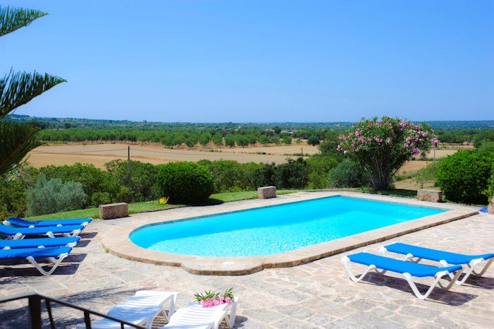 Situation: This lovely farmhouse is situated on the outskirts of Cas Concos, on a elevated position, with views over the countryside and the hills. Cas Concos is on the south-eastern part of Mallorca, around 60 km from Palma. You can find some small groceries and a few restaurants. For bigger supermarkets you can either go to Felanitx (8 km.) or Santanyí (9 km.). In the last one, there is a weekly Market on Saturdays where you can buy fresh vegetables and fruit. The small harbour town of Cala Figuera is only 15 km. away. You can easily reach the beautiful beaches of Cala Mondagró (15km.) or Cala sa Nau (13 km.) The villa The two storey farmhouse "Era des Pou" is surrounded by a property of 5500 m², from which 1000 are garden, with bougavilles, palm trees, hibiscus and oleanders. Large wooden doors open from the, partly covered and with build-in barbecue, main terrace to a spacious lounge with satellite TV and DVD and safe, dining room, furnished for 8 person.The fitted kitchen is fully equipped with ceramic hob, fridge/freezer, electric kettle, coffee machine, oven and microwave. There is 1 twin and 1 double bedroom with showerroom en-suite plus a full bathroom on the ground floor. Upstairs are 2 further twins and a bathroom, plus a large balcony with views over the pool and countryside. Outdoor Partly covered terrace, with build-in barbecue. Pool (9x4,5m.) surrounded by a large terrace and outside shower, as well as sunbeds and outside toilet. Nice and large garden.