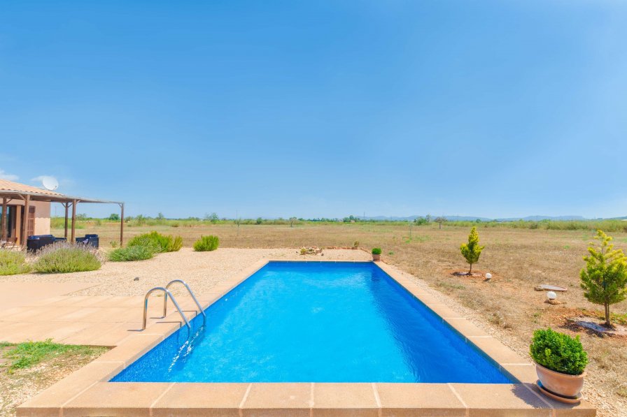 Our guests will have access to a private, 8.5 m x 4 m chlorine pool with a depth of 1.3 m. Surrounded by a well-kept garden with four sun loungers and an outdoor shower, it's a lovely corner to relax and bask in the sun. The shady terrace, ideal for a romantic get-together, has idyllic views over the countryside. If you like cooking outside, you'll enjoy making a BBQ underneath the starry sky. This lovely house is independent and the plot is fenced. A bright sitting-dining room with satellite-TV and DVD-player receives our guests. During the colder months, you can spend time with your loved ones by the fireplace. The fully-equipped kitchen has everything to cook up a feast, including a vitro hob, washing machine, iron and ironing board. The kitchen has direct access to the garden. Perfect for six guests, this well-equipped, one-storey villa offers two double bedrooms and another bedroom with a trundle bed, all fitted with ceiling fans and wardrobes. One double bedroom counts with a bathroom en-suite with bath tub. Additionally, there's a shower bathroom. Two electric radiators warm up the house during the colder months and we can supply more on request. The owner has paid great attention to the environment and has installed solar cells. Located between the urbanisations Son Mesquida and Son Valls, this amazing house rests in the countryside near Felanitx. In the centre you'll find all necessary amenities for an independent stay. At the end of August, Felanitx celebrates the Fiestas of Santa Magdalena, where you can see the famous Cavallets, a traditional dance. The Sant Salvador Sanctuary, located on the top of a hill, has amazing panoramic views over the island's centre and the south-east. A short drive takes you to the east coast and to many dreamlike beaches like Cala Marcal, Cala Ferrera and Cala Mondragó. At the same time, the latter is a natural park and nice for long strolls. The fishing village of Portocolom surprises with colourful houses, which almost seem to dip in the Mediterranean. The traditional fishing boats, called Llaüts, are still in use and every morning you can watch the fishermen going for work. While strolling through the cobbled streets, having a glass of wine in a small café, constantly accompanied by a salty breeze, you'll feel the real essence of Mallorca. If you want to take to the floor, go to Cala D'Or where you will find lots of pubs. Pets are not allowed. The holding of events is forbidden. Consult the advertiser for possible charges. Distances: Beach: 18 km - Portocolom Airport: 44.4 km - Son Sant Joan Golf course: 16.1 km - Vall d'Or, S'Horta Town: 3.3 km - Felanitx Train station: 17.7 km - Manacor Bus stop: 3.8 km - Felanitx Ferry: 52.3 km - Palma Hospital:18 km - Manacor Tourist license: /ET The Ecotasa (tourist tax) must be paid cash on site when checking in. The amount varies between 0.55€/night and guest during the low season and 2.2€/night and guest during the high season. The tax is reduced by half from the 9th day of your stay. All guests have to pay the Ecotasa, except people under 16 years.