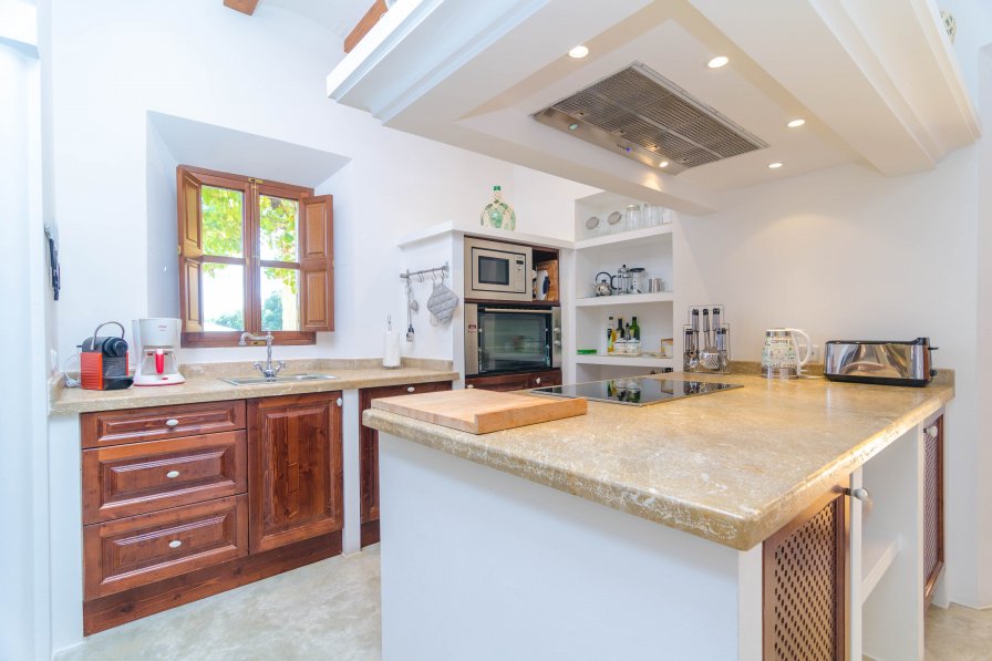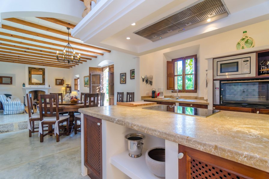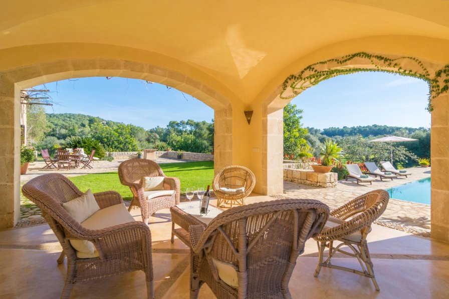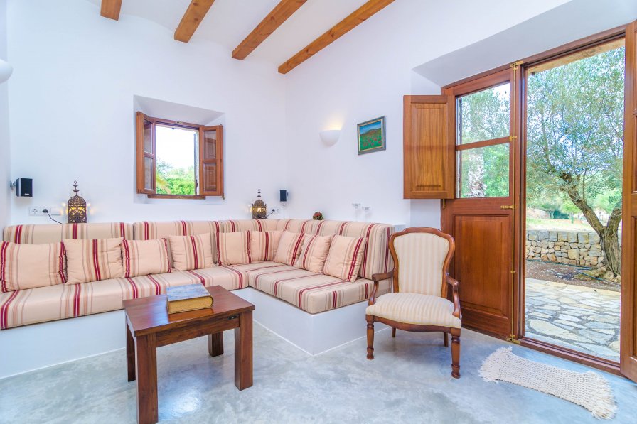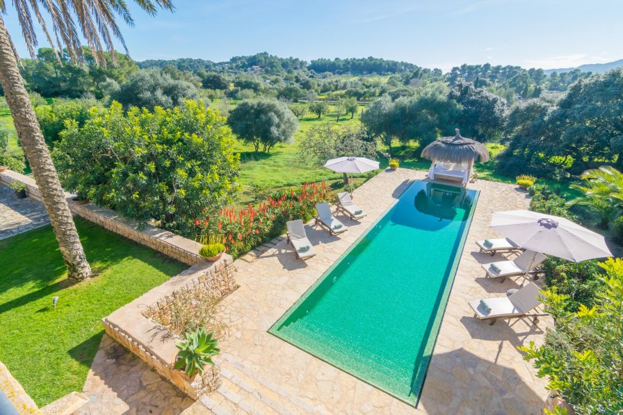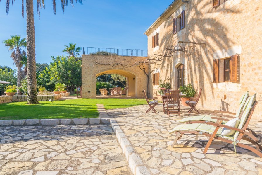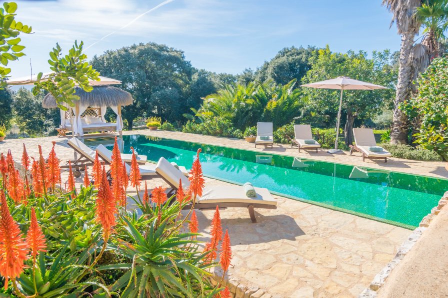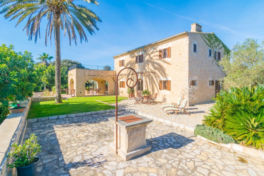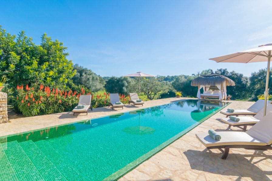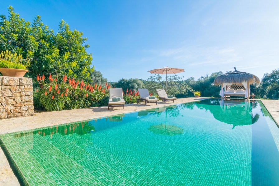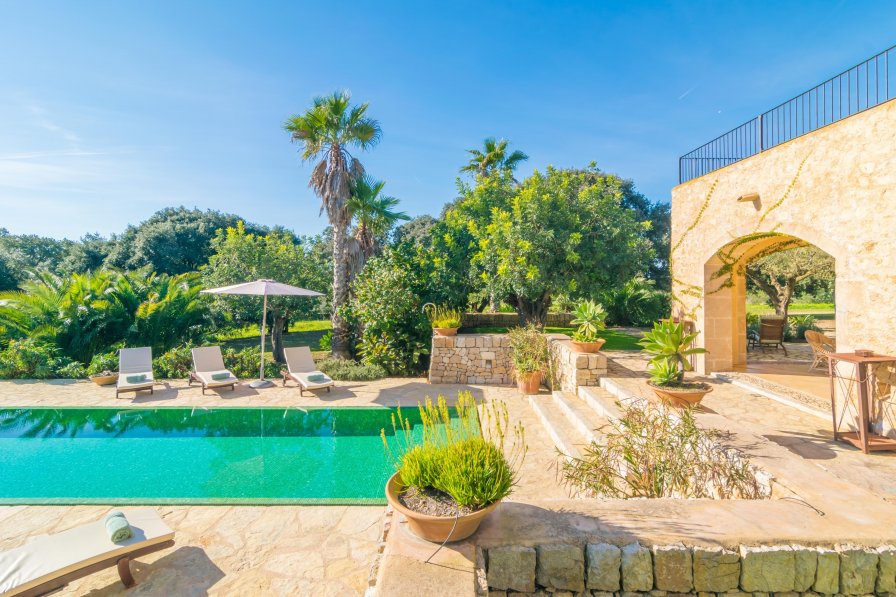 Welcome to this property with an amazing 15m x3.5m swimming pool and up to 1.80m depth. It disposes of some colourful lights for the night and eight hammocks where you can make the most of the good weather during the day. There is an external shower for a quick refresh. Is surrounded by a big grass and garden area, which makes outdoors so special, where having a nice walk is a pleasure. A gorgeous furnished terrace and a porch, are ideal to enjoy a tasty dinner prepared at the barbecue. This nice house has no direct neighbours. The property is decorated with a mix of both modern and rustic styles, and is divided in two floors. At the ground floor, there are two living-rooms: one with a fireplace and another one has a direct access outside and a satellite TV. The induction equipped kitchen, is a fantastic place to prepare your favourite dishes, you will love its details like the little stones fringe at the floor or the countertop as well made of stones. A gorgeous bedroom with a double bed and a bathroom en suite with a shower, and a shared toilet, complete this floor. Upstairs, you will find another three bedrooms. One disposes of two single beds, an studio space and a bathroom en suite with a shower and a hot tub. The second has a double bed, a bathroom en suite and direct access to a wonderful terrace. The last one has two single beds, a bathroom with a shower and a hot tub. If you travel with your baby, we will provide you up to two cots and two high chairs. The property disposes of central heating for the winter, and an independent washing area with a washing machine, a dryer, an iron and an ironing board. To be located at this rural environment is the better way to meet the real and authentic Mallorca. The property is near Felanitx village, about 5km distance, where you will find bars and restaurants with a delicious majorcan food offer. For golf lovers, Vall d'Or golf course is about 15 km distance. If what you fancy is to discover idyllic beaches, we highly recommend Portocolom, Calas de Mallorca or Cala Romántica. Don't miss San Salvador monastery and its views! Consult the advertiser for possible charges. Pets are not allowed. The holding of events is forbidden. There is an external parking for four cars. The swimming pool lights switch on automatically when its darker and switch off at 02am. Distances: Beach: 15.6km - Porto Colom Airport: 48.9km - Son Sant Joan Golf Course: 15.2km - Vall d'Or Village: 5km - Felanitx Train Station: 16 km - Manacor Bus Stop: 5km -Felanitx Ferry: 59.3km -Palma Hospital: 16.6km - Manacor Tourist license: VT/1782