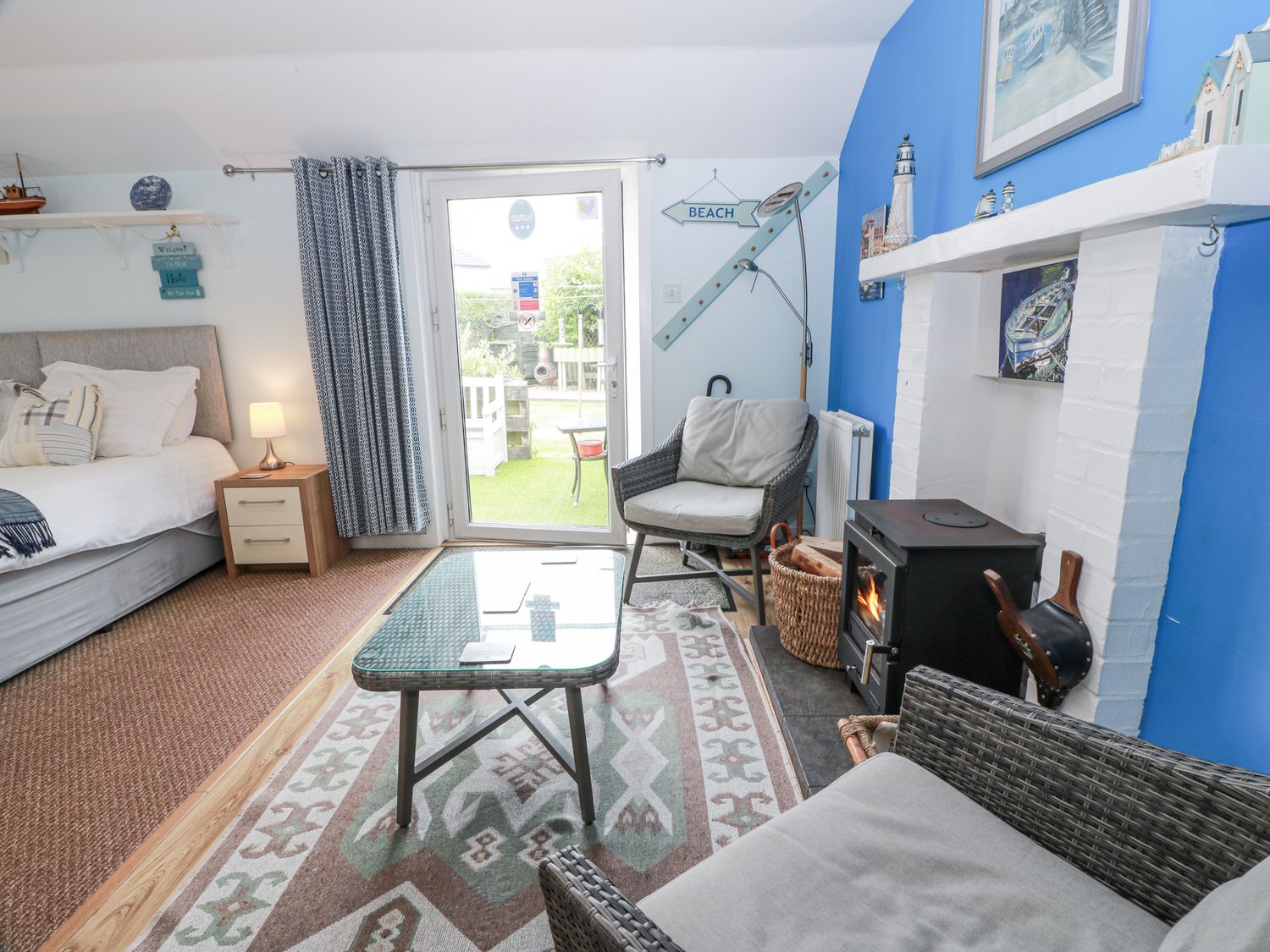 "Single-storey. Studio-style living space with a super-king-size (zip/link, can be twin on request), dining area and sitting area with a woodburning stove. Shower room with walk-in shower, basin, WC. Kitchen"