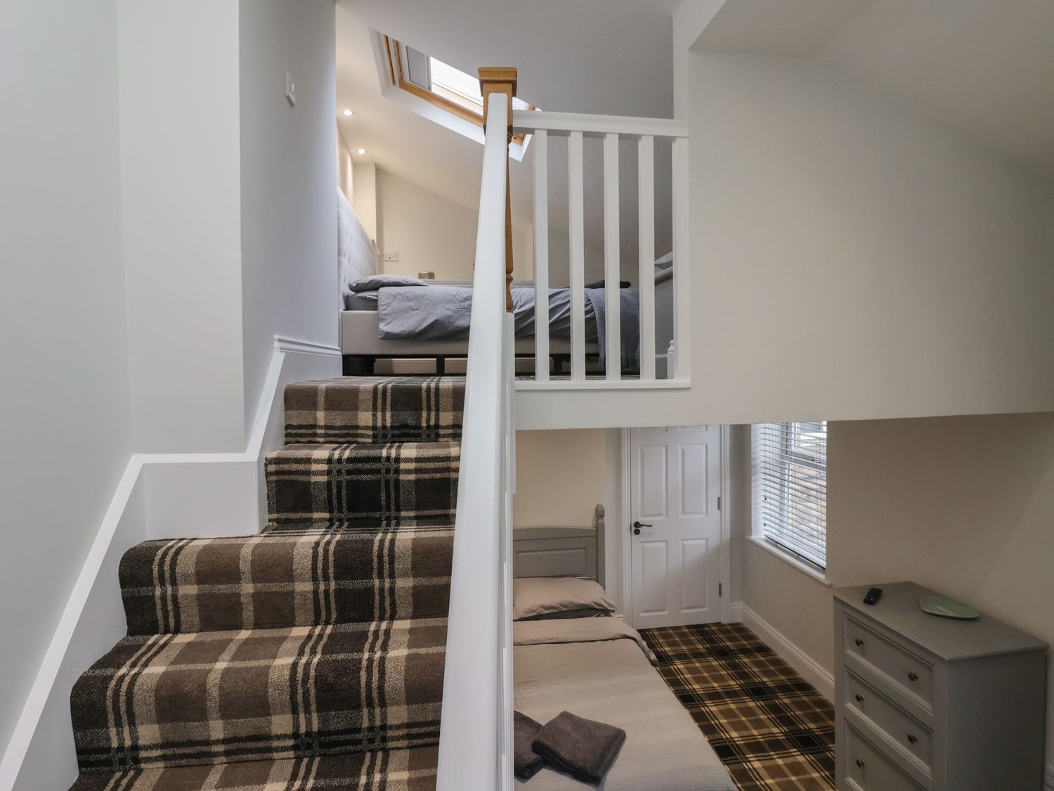 "First-floor apartment. Three bedrooms: 1 x double with Smart TV and en-suite walk-in shower, basin and WC, 1 x double with Smart TV with ensuite & 1 x mezzanine level double. Cloakroom. Kitchen/diner. Sitting room