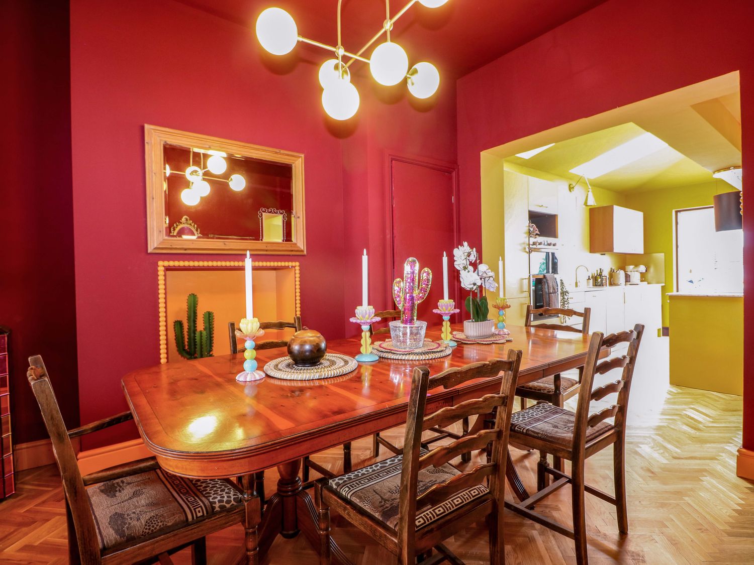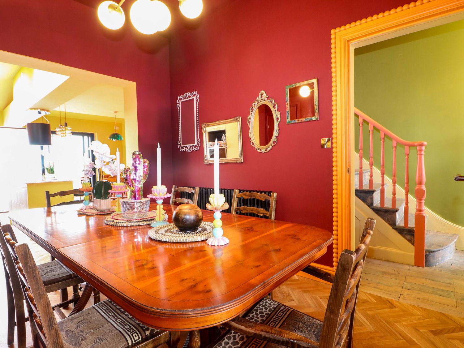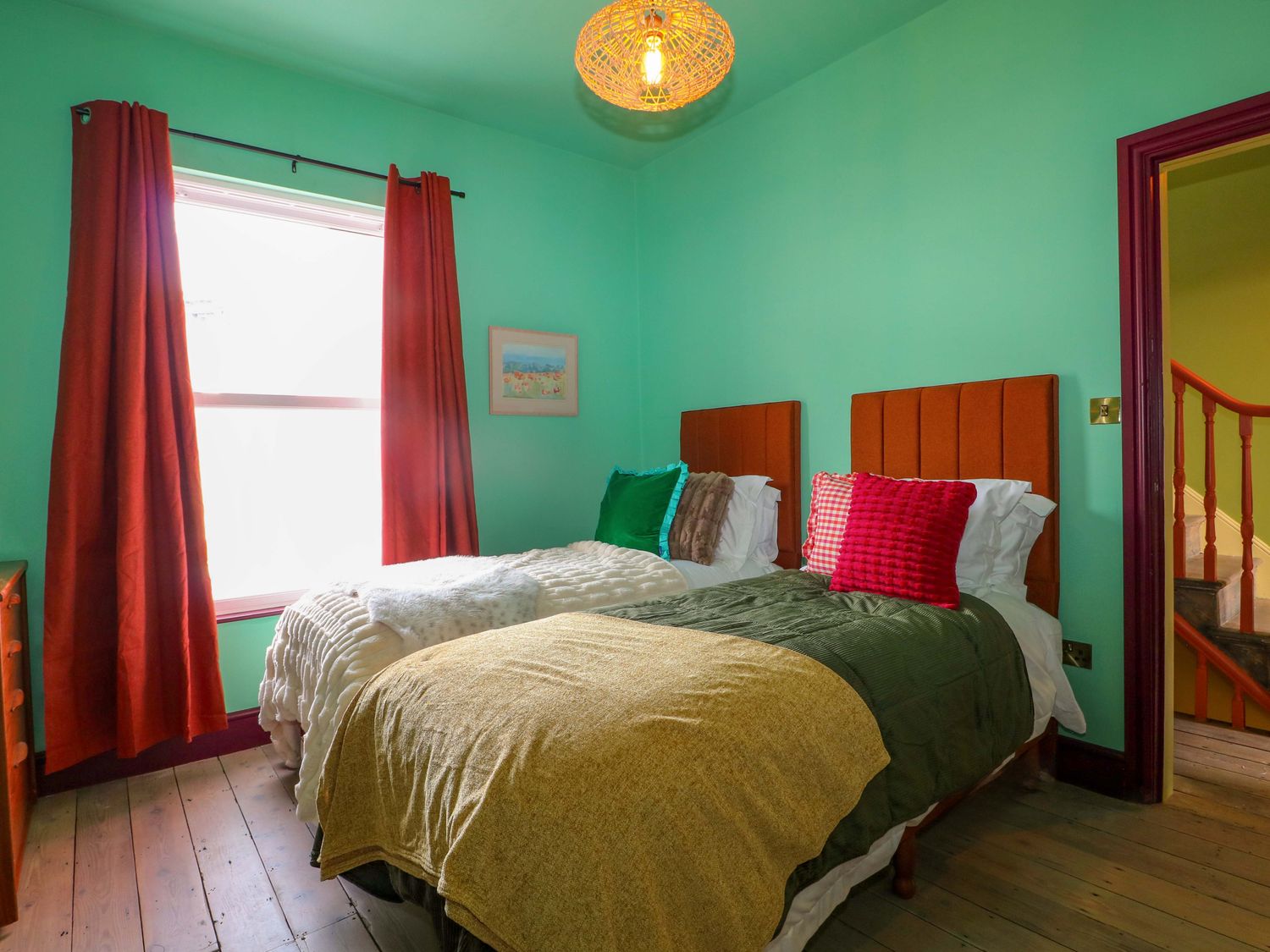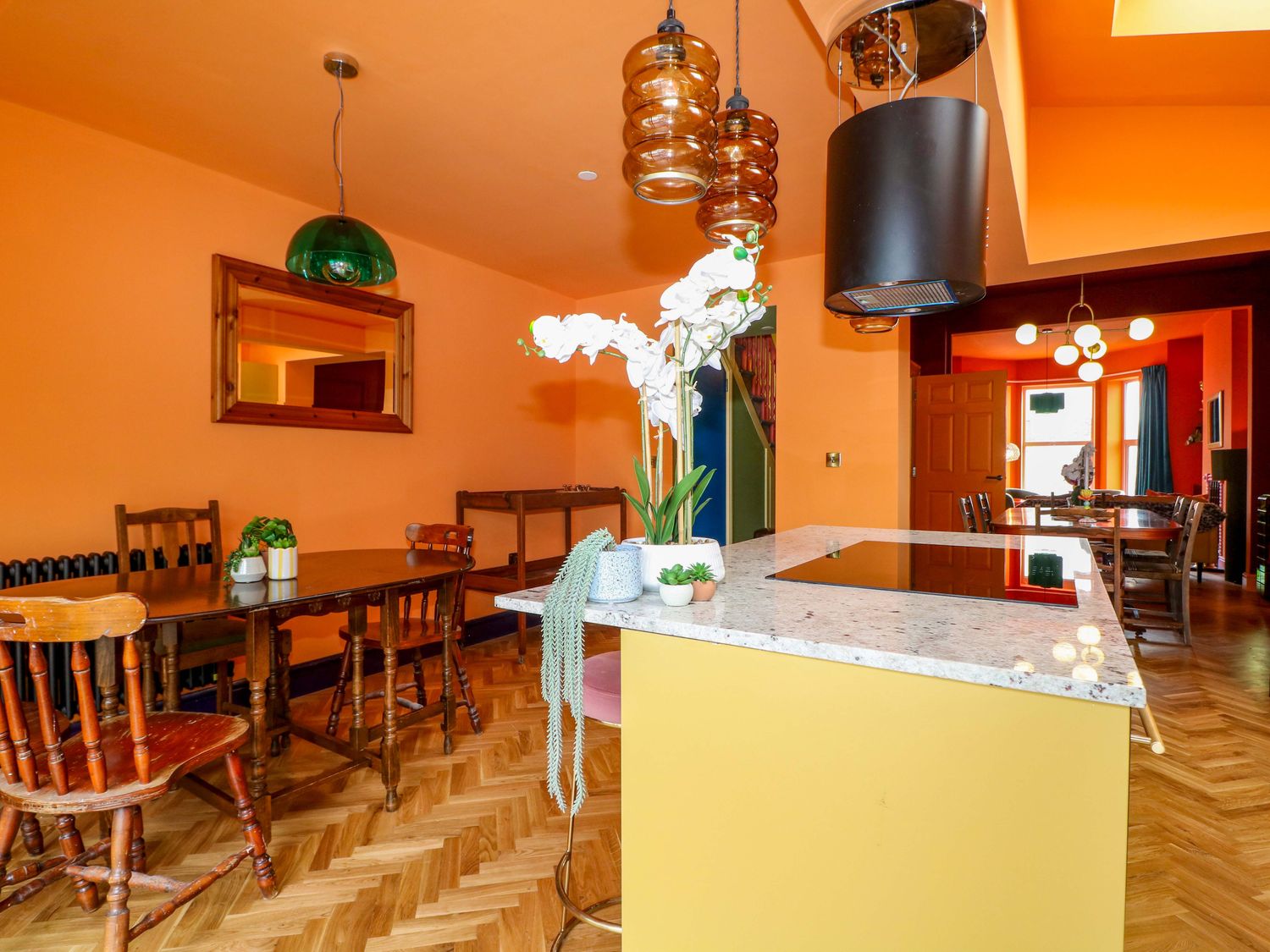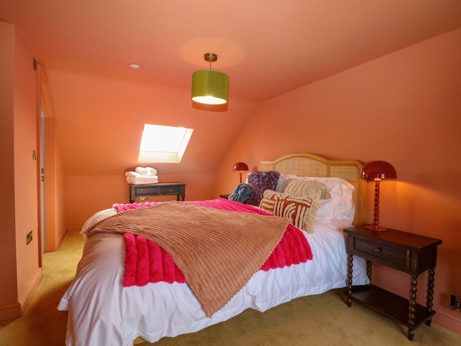 "Over four floors. Five bedrooms: 1 x third-floor king-size with en-suite with walk-in shower, basin and WC, 1 x king-size, 1 x second-floor king-size, 1 x second-floor double, 1 x twin, All beds are king size, twin is zip and link and can be a king, Only the very top attic bedroom has an en suite, with shower. Bathroom with freestanding bath, basin and WC. Second-floor shower room with walk-in shower, basin and WC. Cloakroom with basin and WC. Open-plan living space with kitchen, dining area and sitting area with woodburning stove"