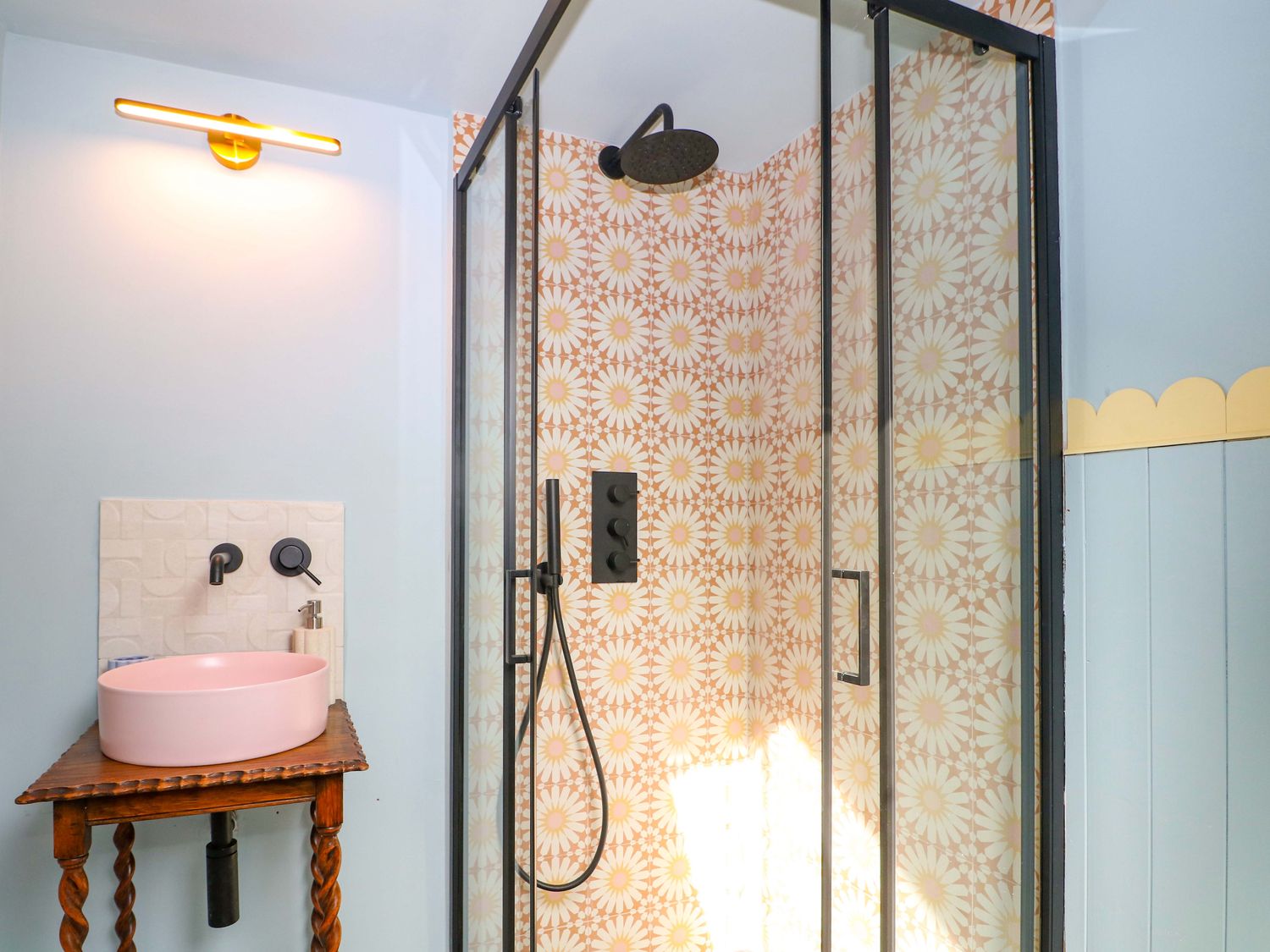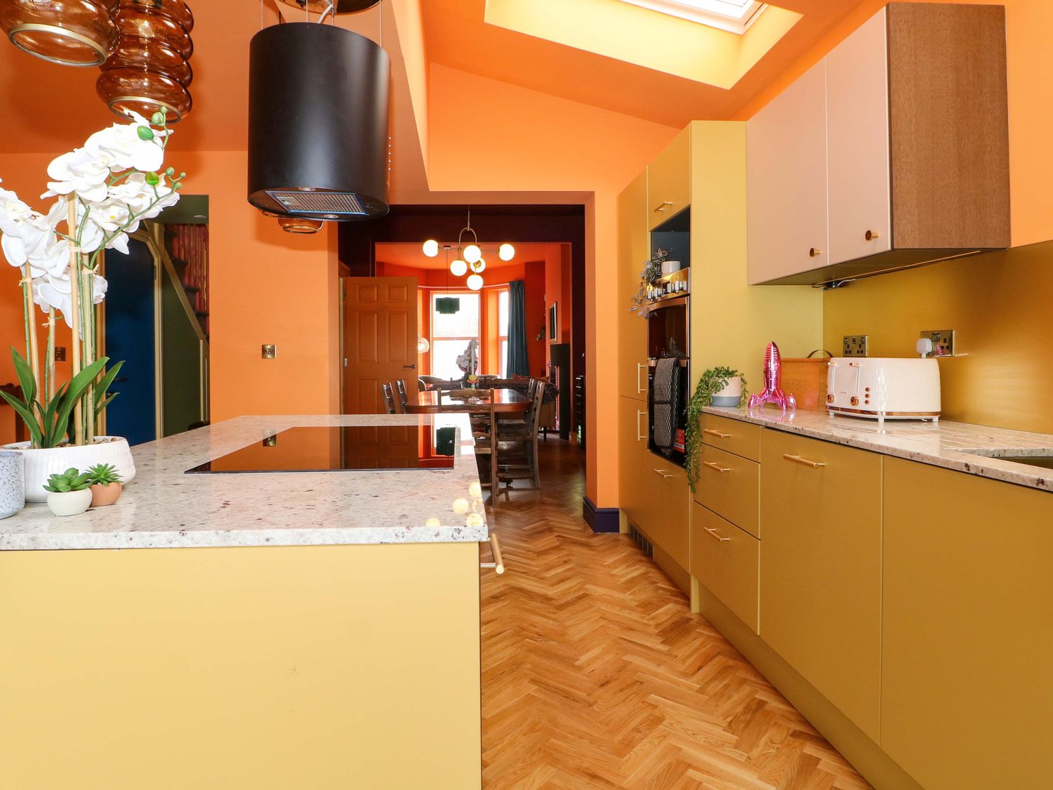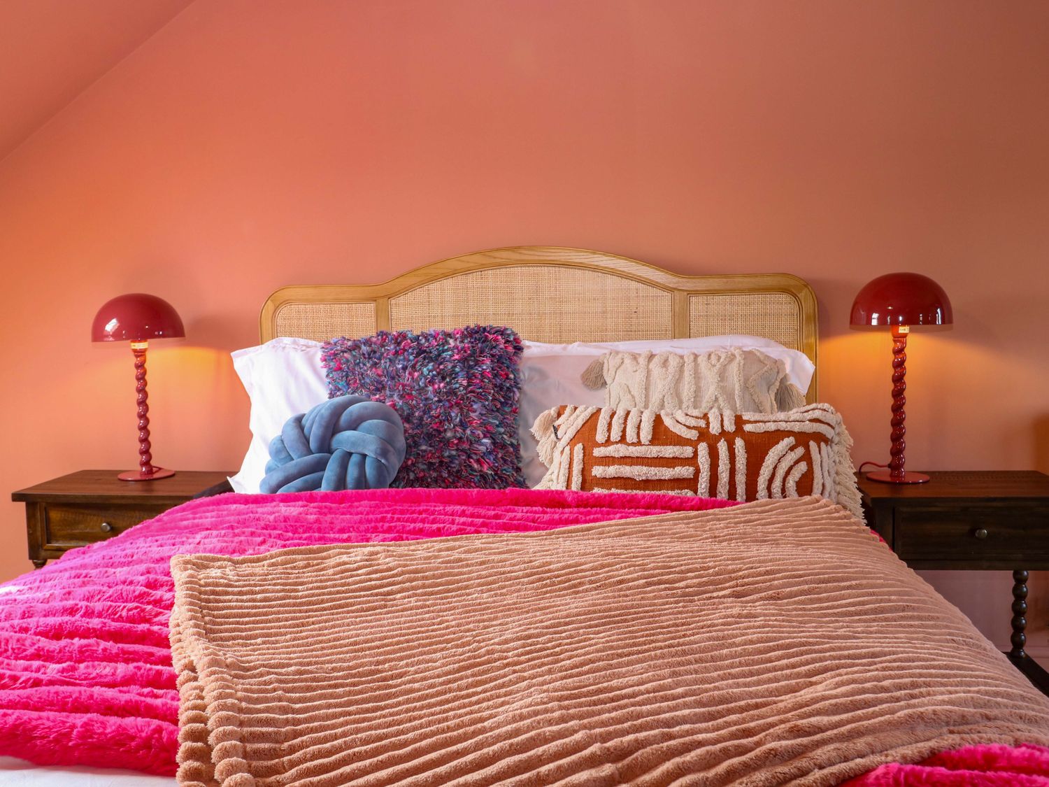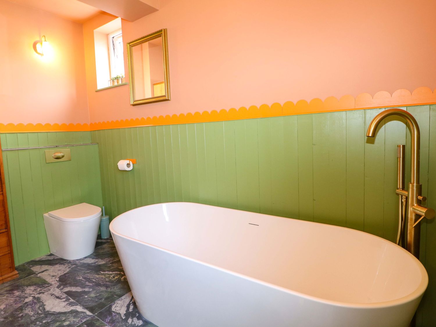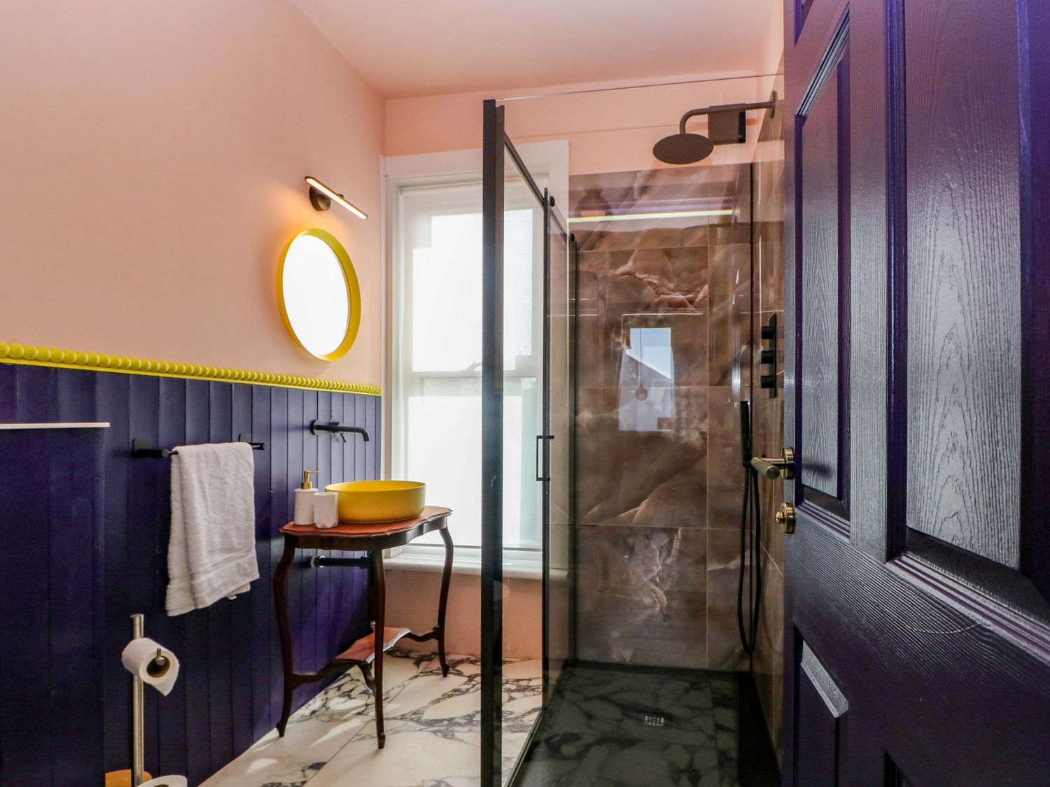 "Over four floors. Five bedrooms: 1 x third-floor king-size with en-suite with walk-in shower, basin and WC, 1 x king-size, 1 x second-floor king-size, 1 x second-floor double, 1 x twin, All beds are king size, twin is zip and link and can be a king, Only the very top attic bedroom has an en suite, with shower. Bathroom with freestanding bath, basin and WC. Second-floor shower room with walk-in shower, basin and WC. Cloakroom with basin and WC. Open-plan living space with kitchen, dining area and sitting area with woodburning stove"