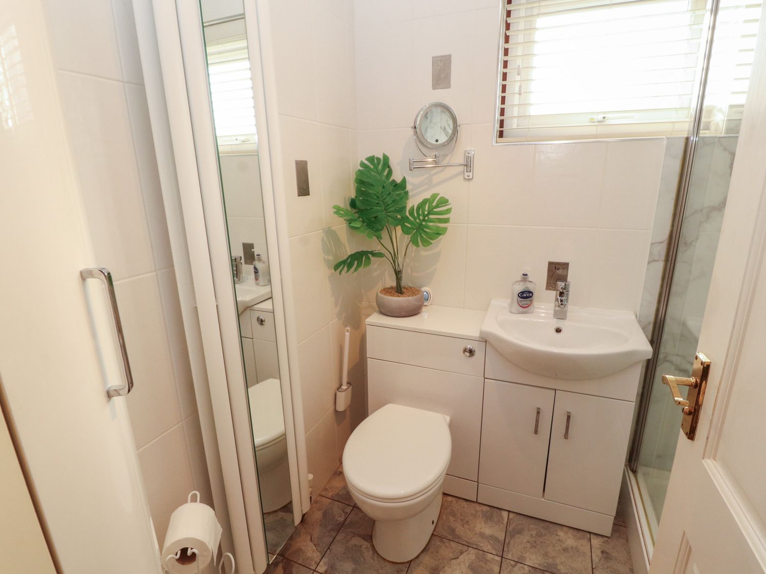 Family shower room with walk-in shower, basin and WC.