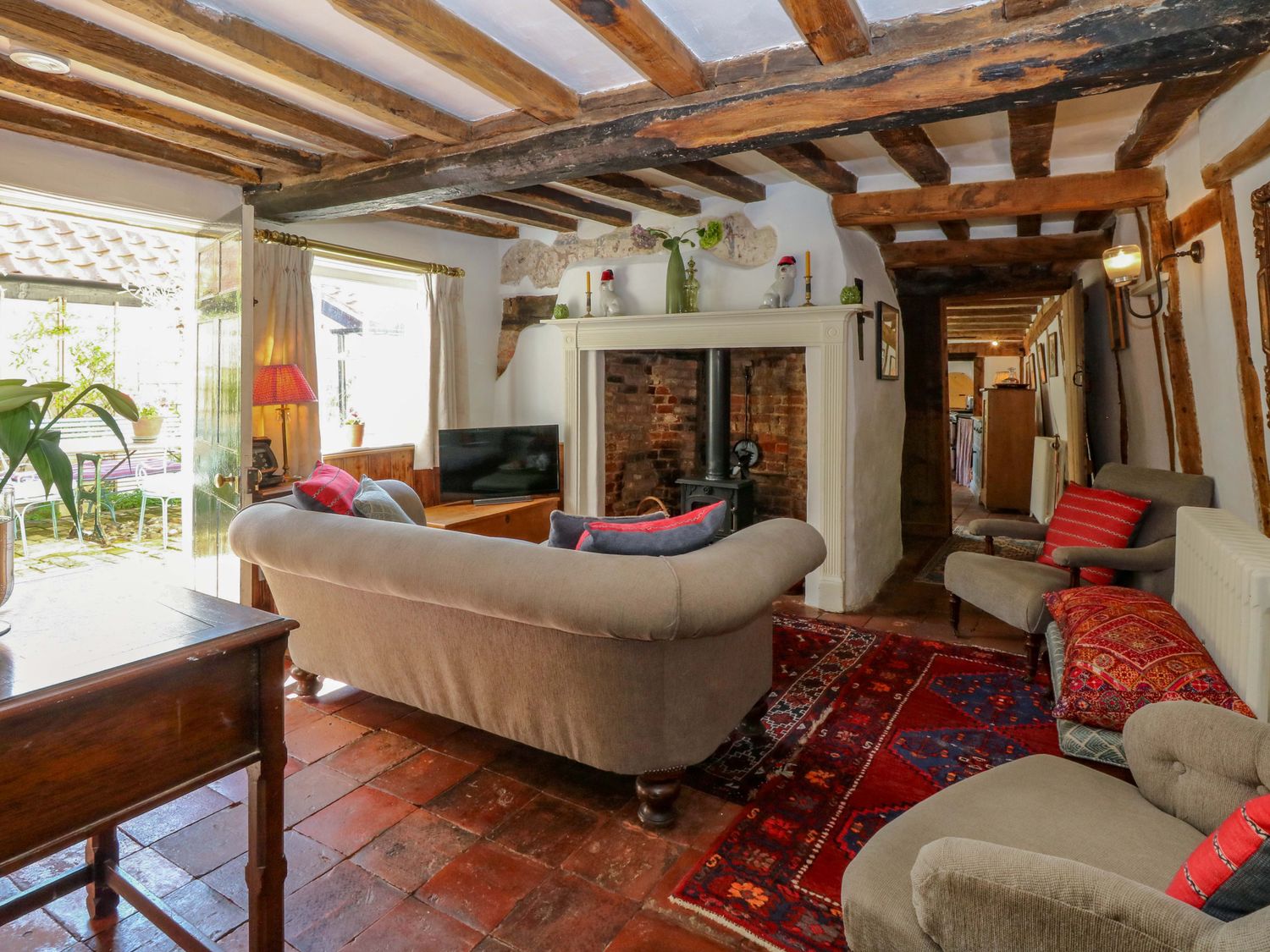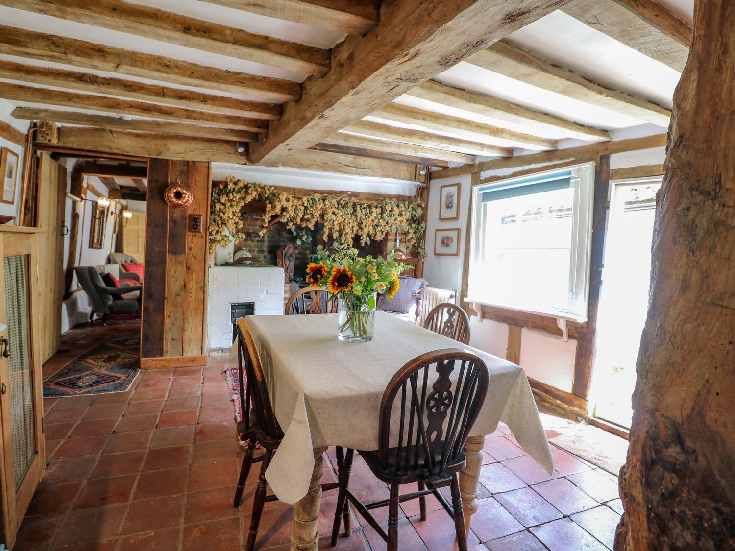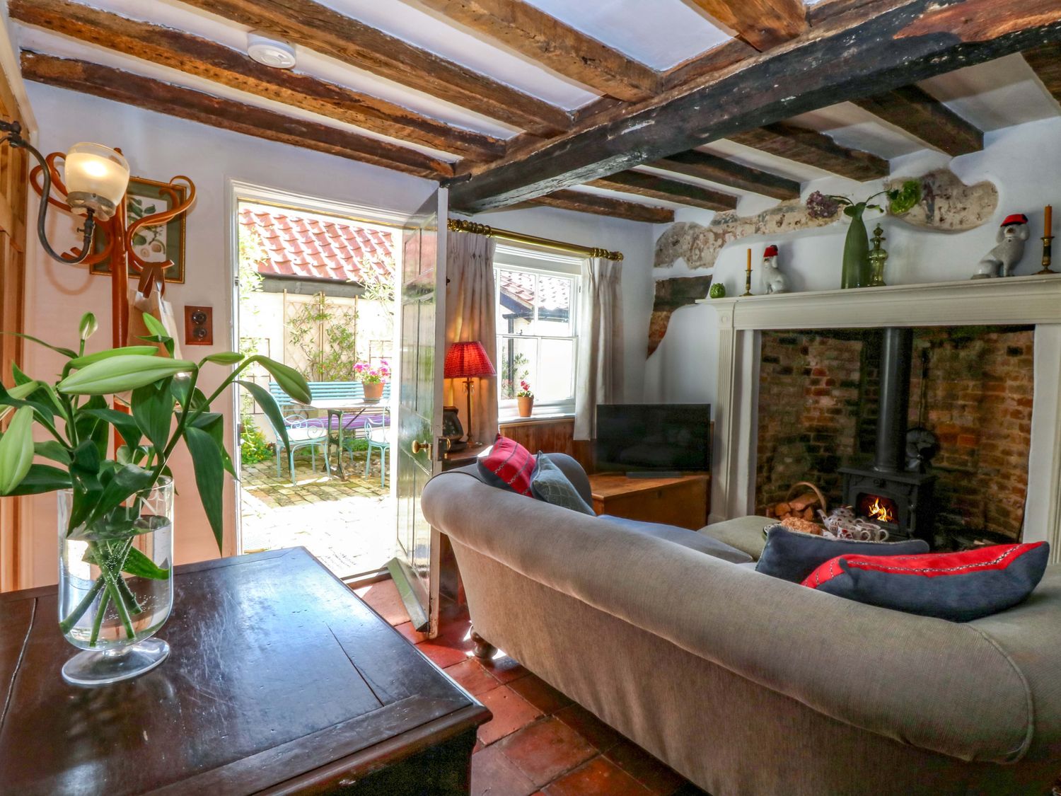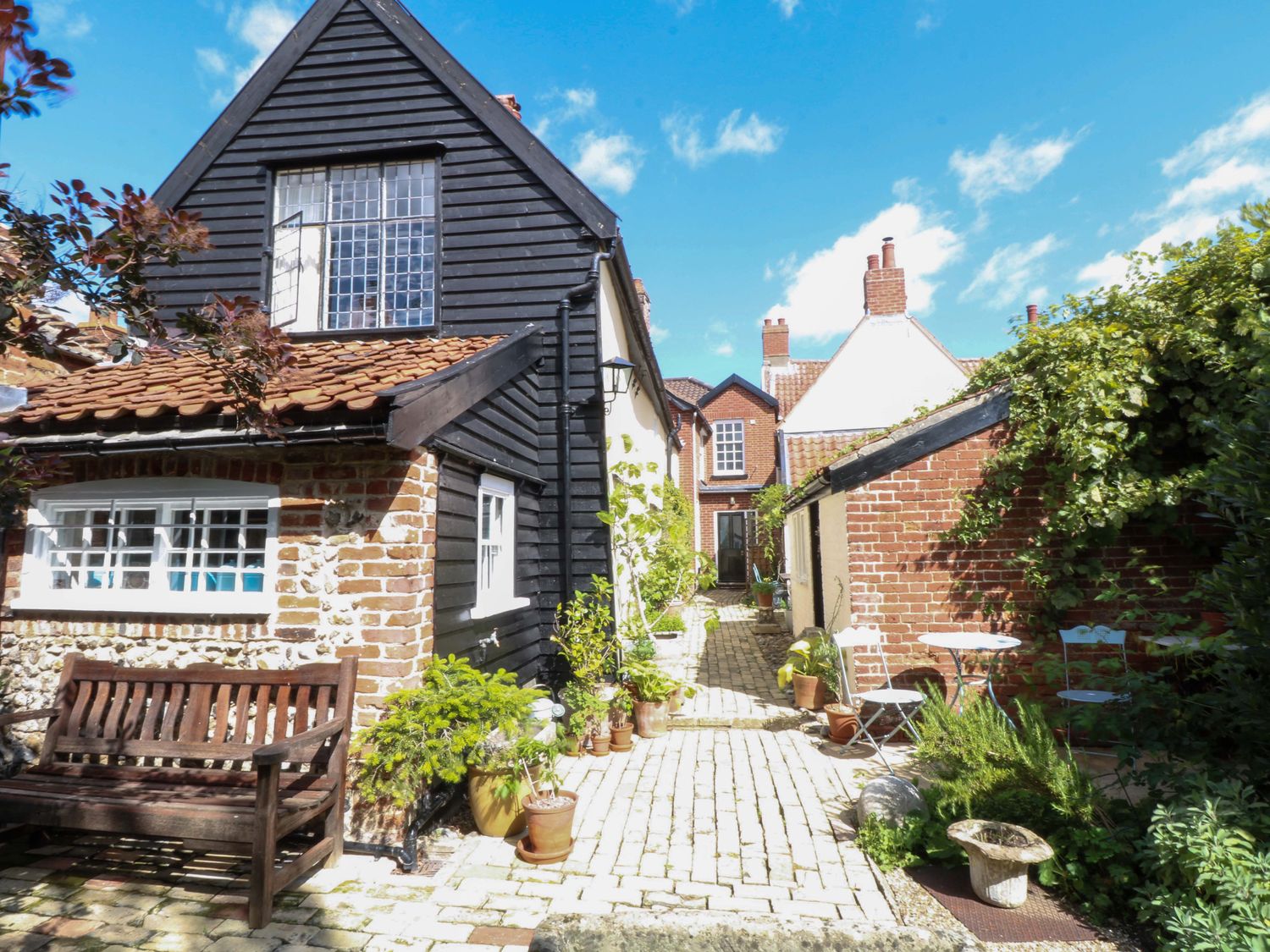 "Bank House, consists of a kitchen/diner with electric oven and grill, ceramic hob, fridge/freezer, microwave, washing machine, dishwasher and dining seating, a sitting room with woodburning stove and Smart TV and a bootroom. The bedrooms consists of a double, and a twin serviced by a bathroom with roll top bath, walk-in shower, basin and WC. Outside there is a enclosed garden with courtyard, patio, lawned area, furniture, table-top barbecue and parking available nearby. Within 0.1 miles, you will find a shop and pub, and within 0.8, a pub. Please note that this is a non-smoking property. Two well-behaved dogs welcome. WiFi, fuel, power, bed linen and towels are all included in the price. Bank House, a charming base in the heart of Hingham. Note: Please don't let dogs upstairs or on the furniture and please supervise at all times. Note: This property has low ceilings, beams and sloping flooring throughout, please take care. Note: there is a Good Housekeeping Bond of 250GBP"