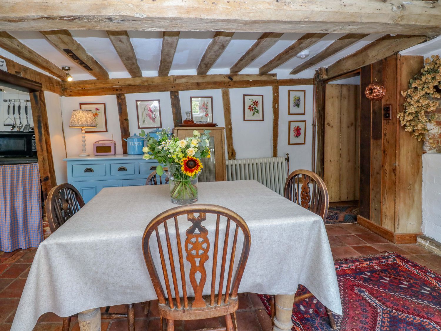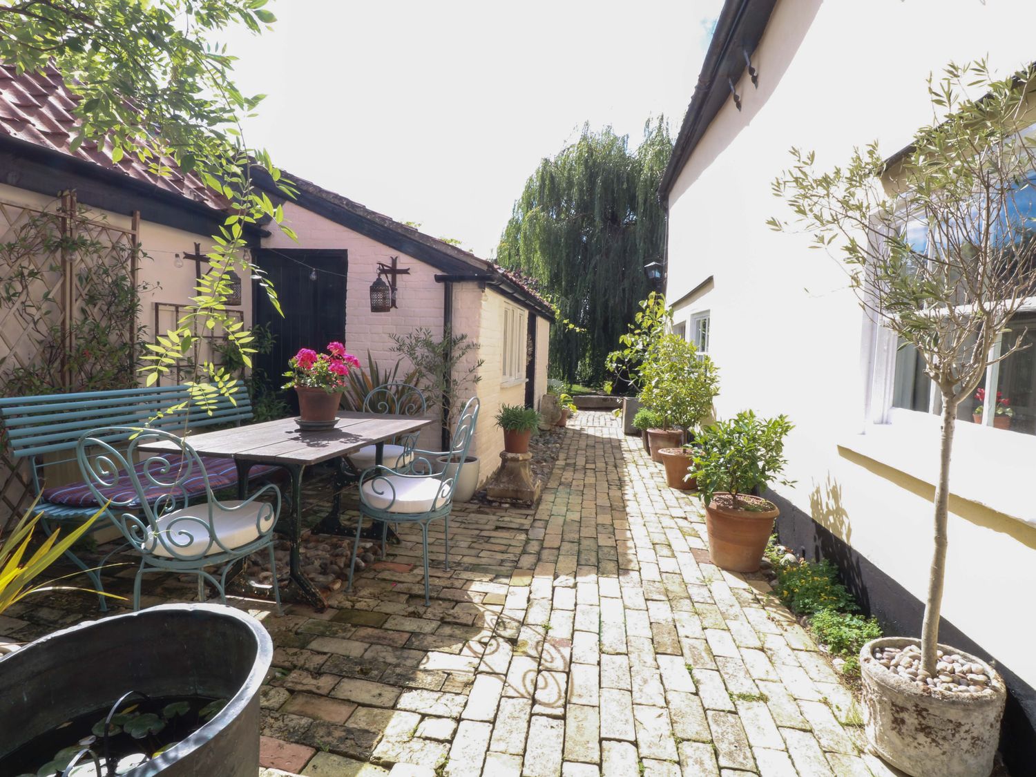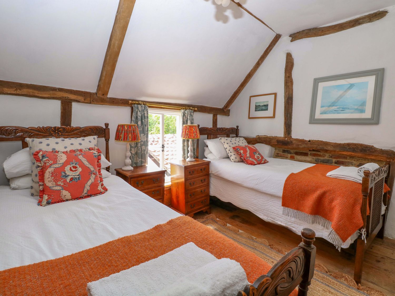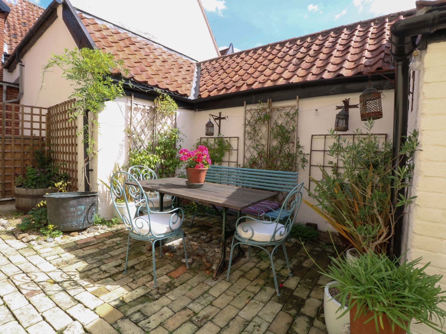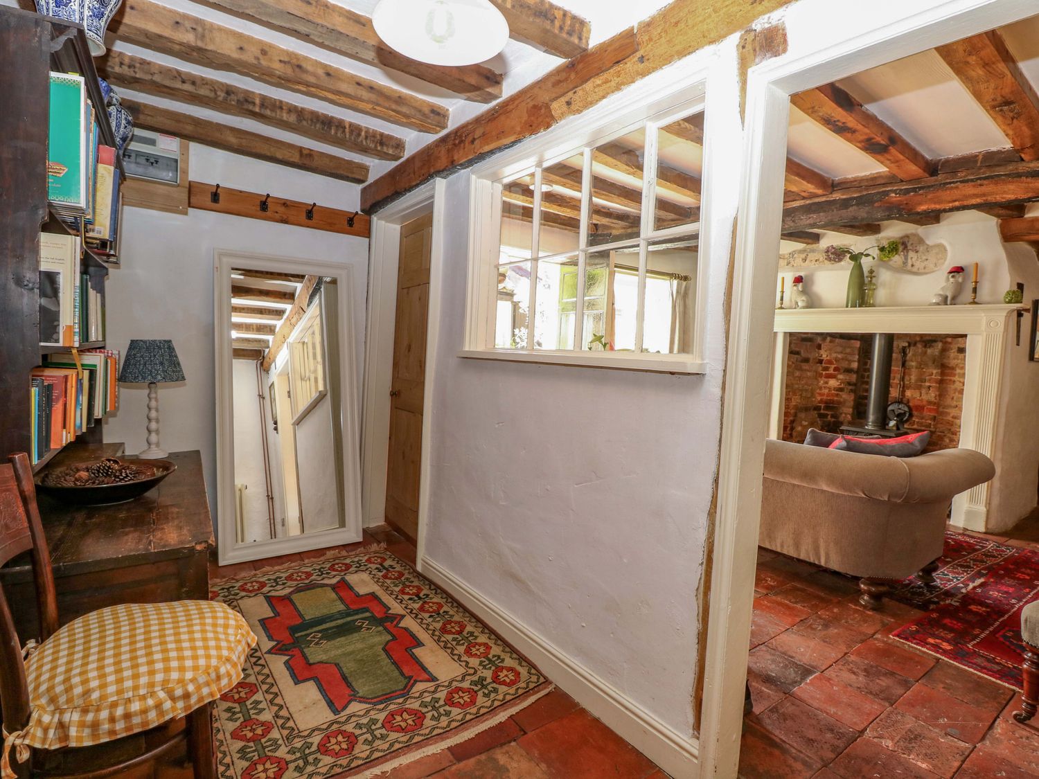 "Bank House, consists of a kitchen/diner with electric oven and grill, ceramic hob, fridge/freezer, microwave, washing machine, dishwasher and dining seating, a sitting room with woodburning stove and Smart TV and a bootroom. The bedrooms consists of a double, and a twin serviced by a bathroom with roll top bath, walk-in shower, basin and WC. Outside there is a enclosed garden with courtyard, patio, lawned area, furniture, table-top barbecue and parking available nearby. Within 0.1 miles, you will find a shop and pub, and within 0.8, a pub. Please note that this is a non-smoking property. Two well-behaved dogs welcome. WiFi, fuel, power, bed linen and towels are all included in the price. Bank House, a charming base in the heart of Hingham. Note: Please don't let dogs upstairs or on the furniture and please supervise at all times. Note: This property has low ceilings, beams and sloping flooring throughout, please take care. Note: there is a Good Housekeeping Bond of 250GBP"