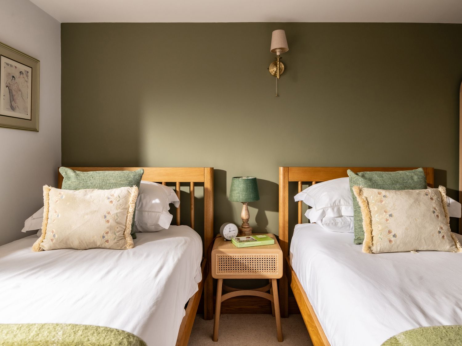 "Reverse-level. Three bedrooms: 1 x ground-floor king-size with TV, en-suite shower, basin, and WC, 1 x ground-floor twin (zip/link can be super-king-size on request) with TV, 1 x ground-floor twin with TV. Ground-floor bathroom with bath, shower over, basin and WC. First-floor open-plan living space with kitchen, dining area, and sitting area with woodburning stove. Mezzanine snug area within living space "