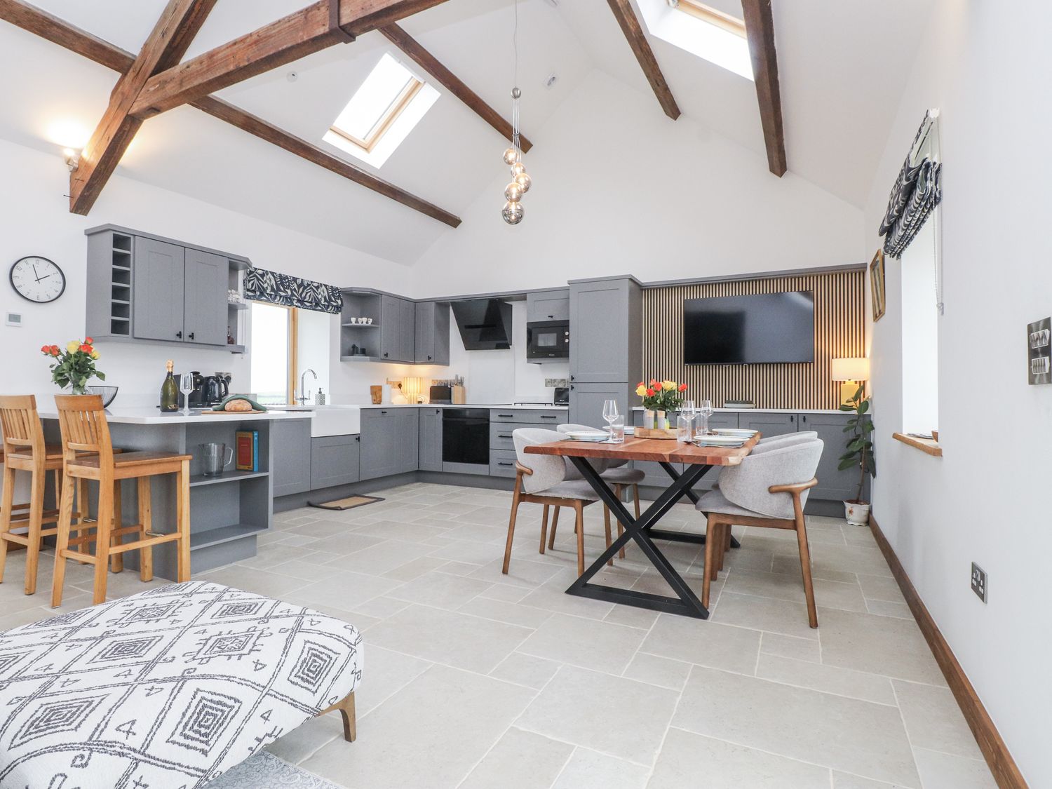 "2 Trem Y Mor consists of an open-plan living space with a kitchen featuring an electric oven and hob, microwave, fridge/freezer, dishwasher, coffee maker, kettle and toaster, a dining area, and a sitting area with a Smart TV, along with a sun room. The bedrooms consist of a king-size (zip/link, can be twin on request) and a king-size, along with a bathroom hosting a bath, walk-in shower, basin and WC. Outside, there is a shared ample off-road parking courtyard with EV charging available, and an enclosed rear garden with a patio, lawn, furniture and hot tub. Within 1.9 miles, you will find a shop, within 1.9 miles, a pub, and within 1 mile, a beach, and please note that this is a non-smoking property. WiFi, fuel, power, bed linen and towels are all included in the price. Have a wonderful trip at 2 Trem Y Mor. Note: There is an 80 GBP supplement for use of the hot tub. Note: 80 GBP Supplement for use of Sauna (payment to be made directly to the owner). Note: SUP boards are available to hire on-site."