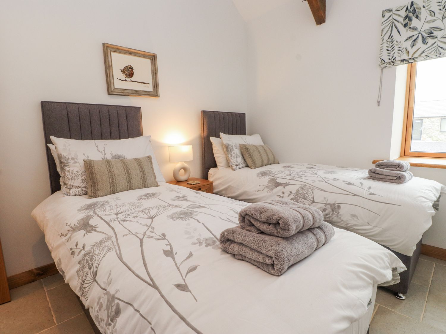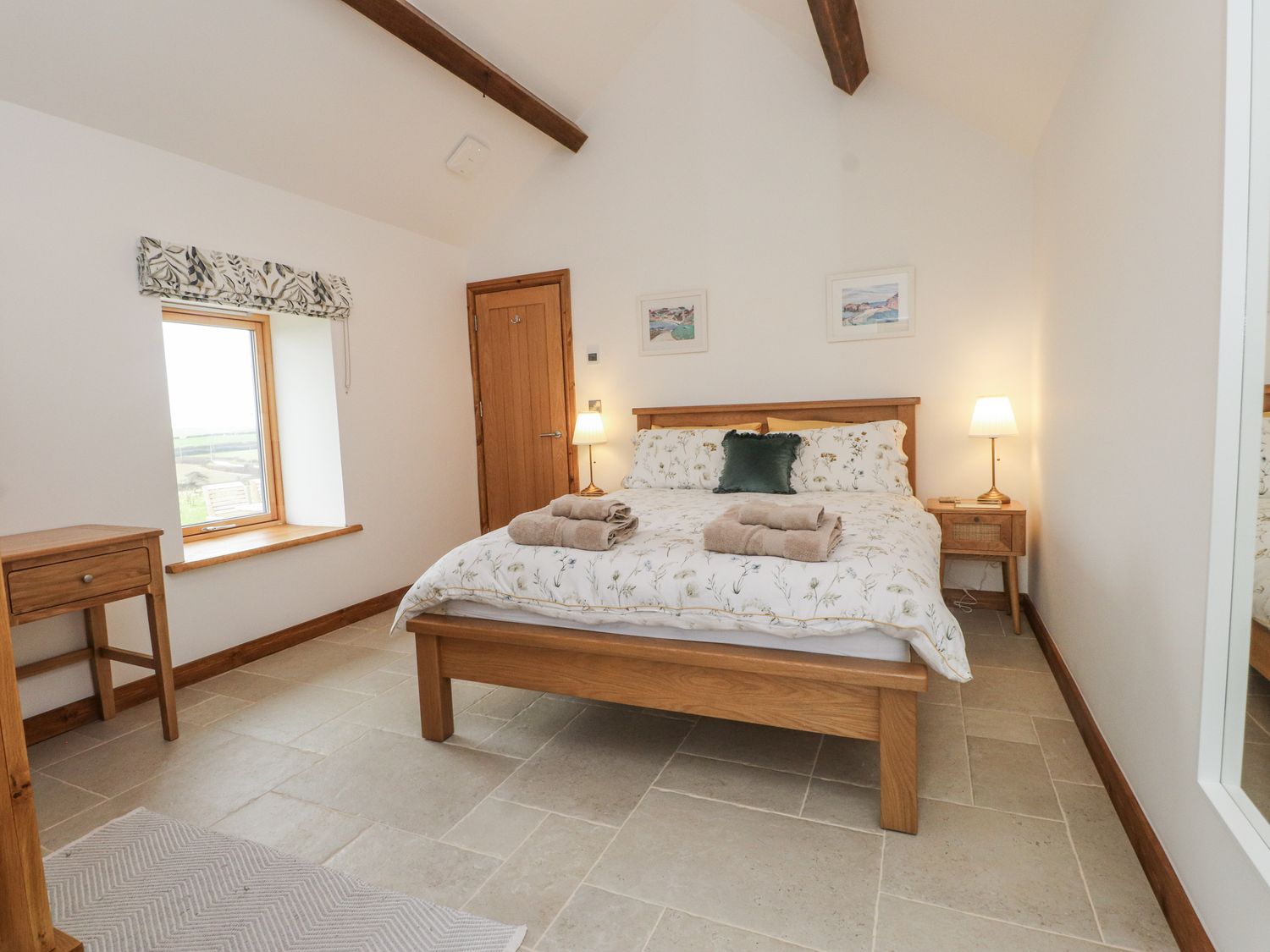 "Single-storey. Two bedrooms: 1 x king-size (zip/link, can be twin on request), 1 x king-size. Bathroom with bath, walk-in shower, basin and WC. Open-plan living space with kitchen, dining area, and sitting area. Sun room"
