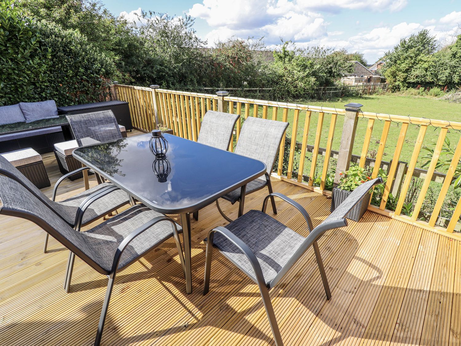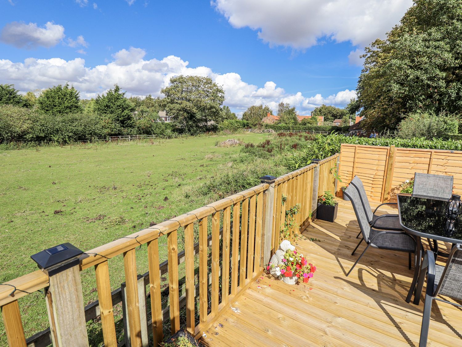 "Single-storey. Three bedrooms: 1 x double with TV and en-suite walk-in shower, basin, and WC, 2 x double. Bathroom with bath, walk-in shower, basin, and WC. Kitchen/diner. Living/dining room with woodburning stove."