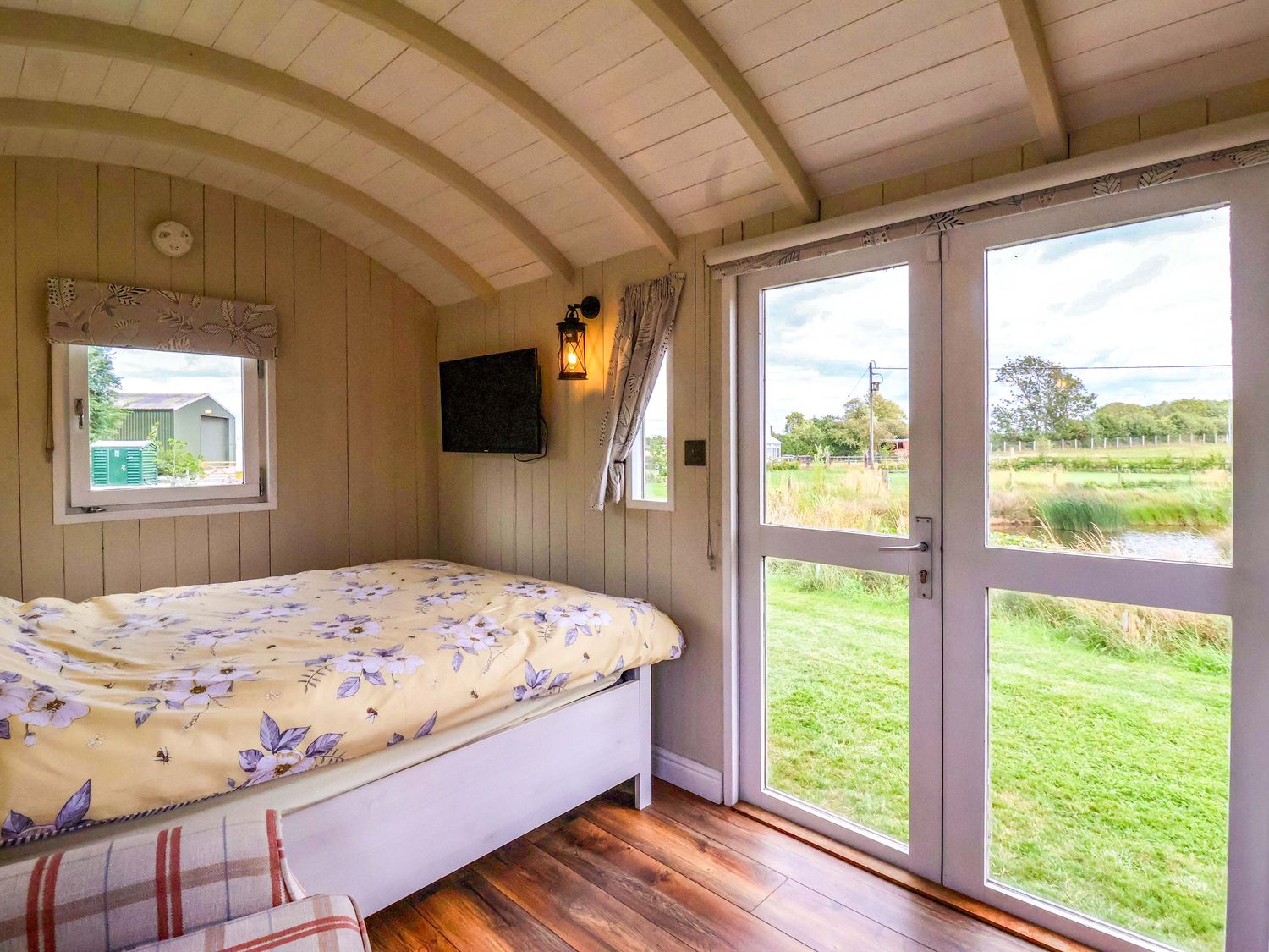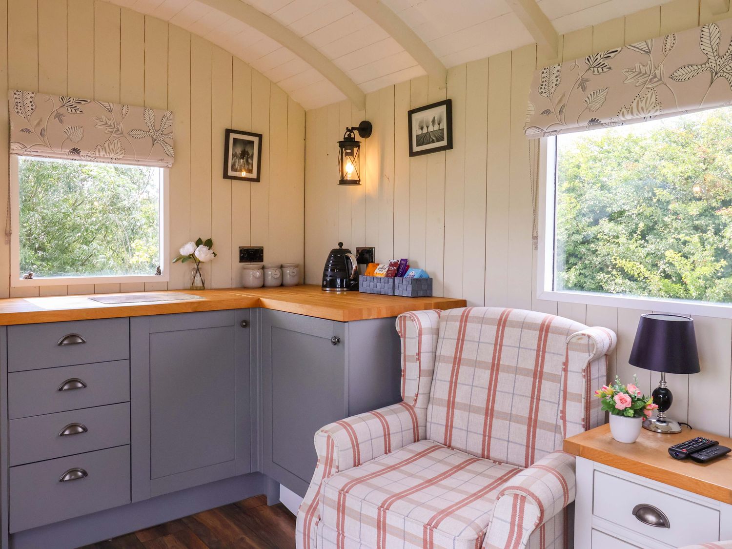 "Single-storey. Studio-style living space with king-size bed, kitchenette, sitting area and TV. External shower room with walk-in shower, basin, WC"