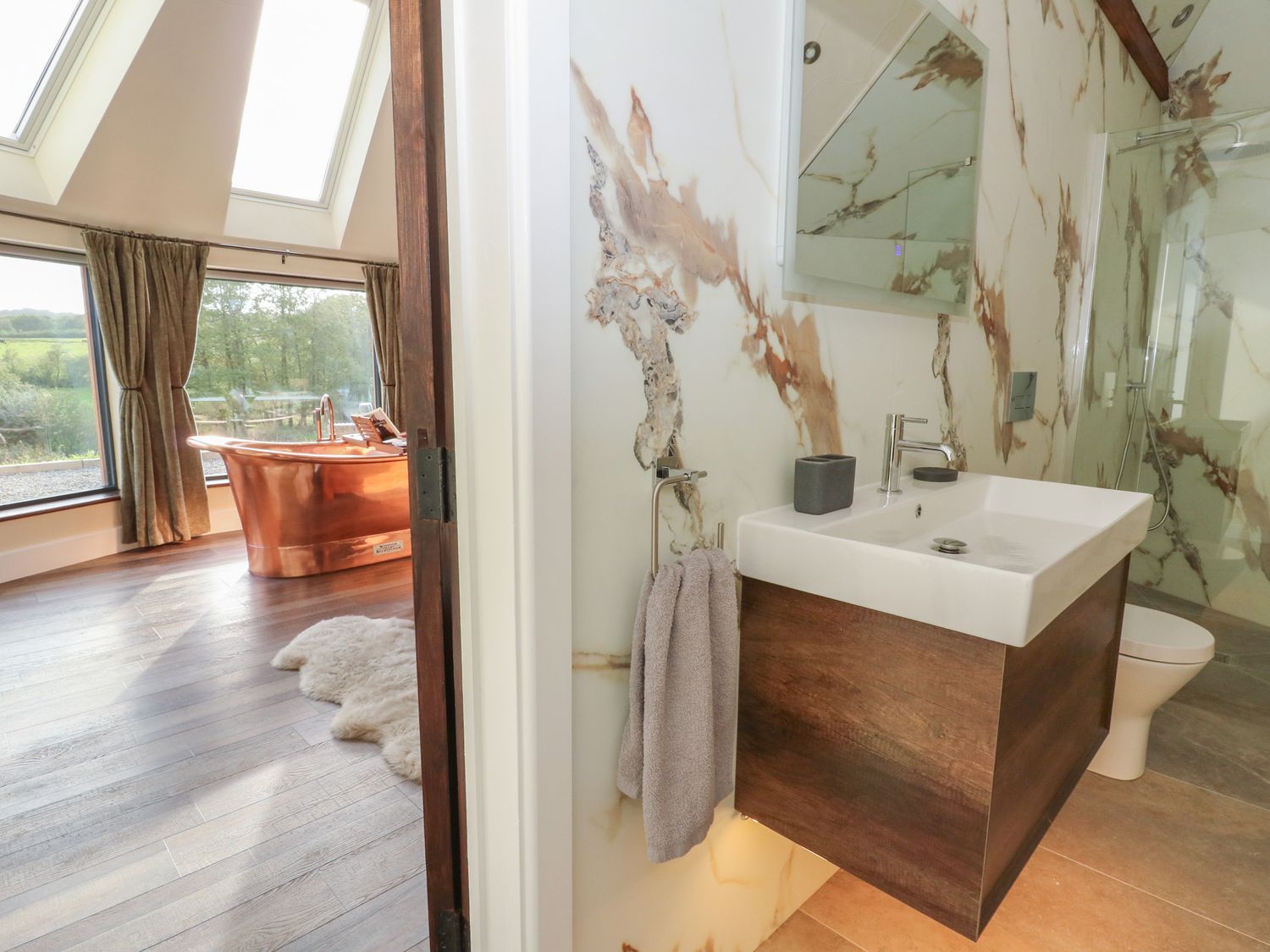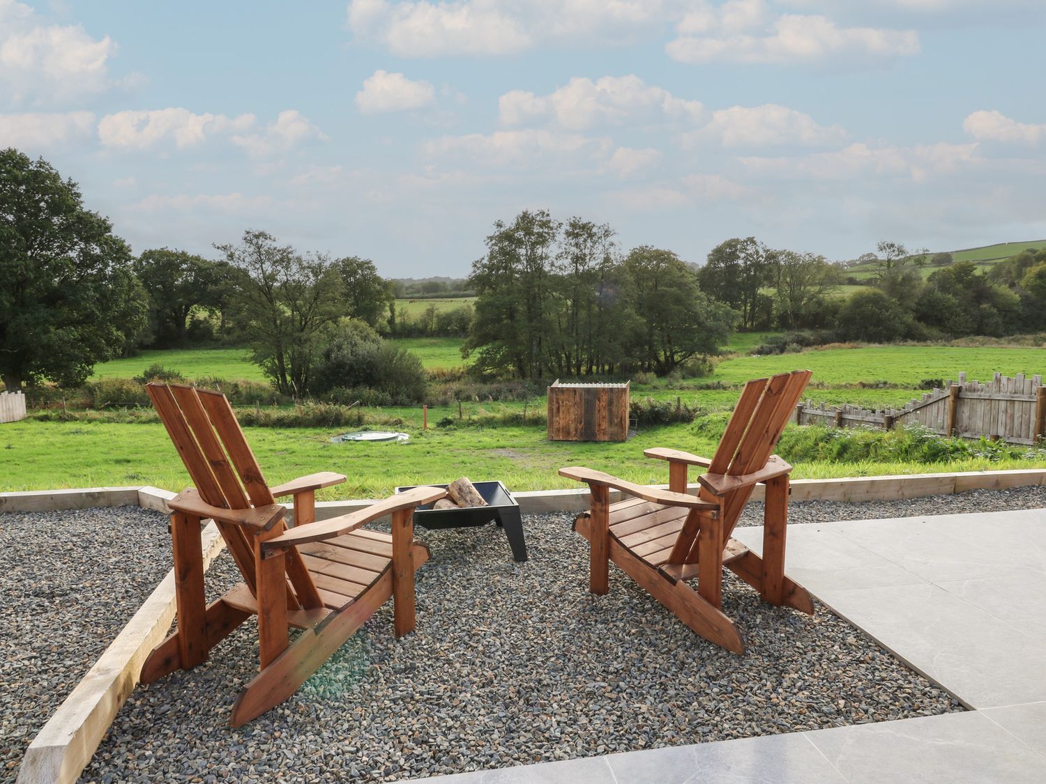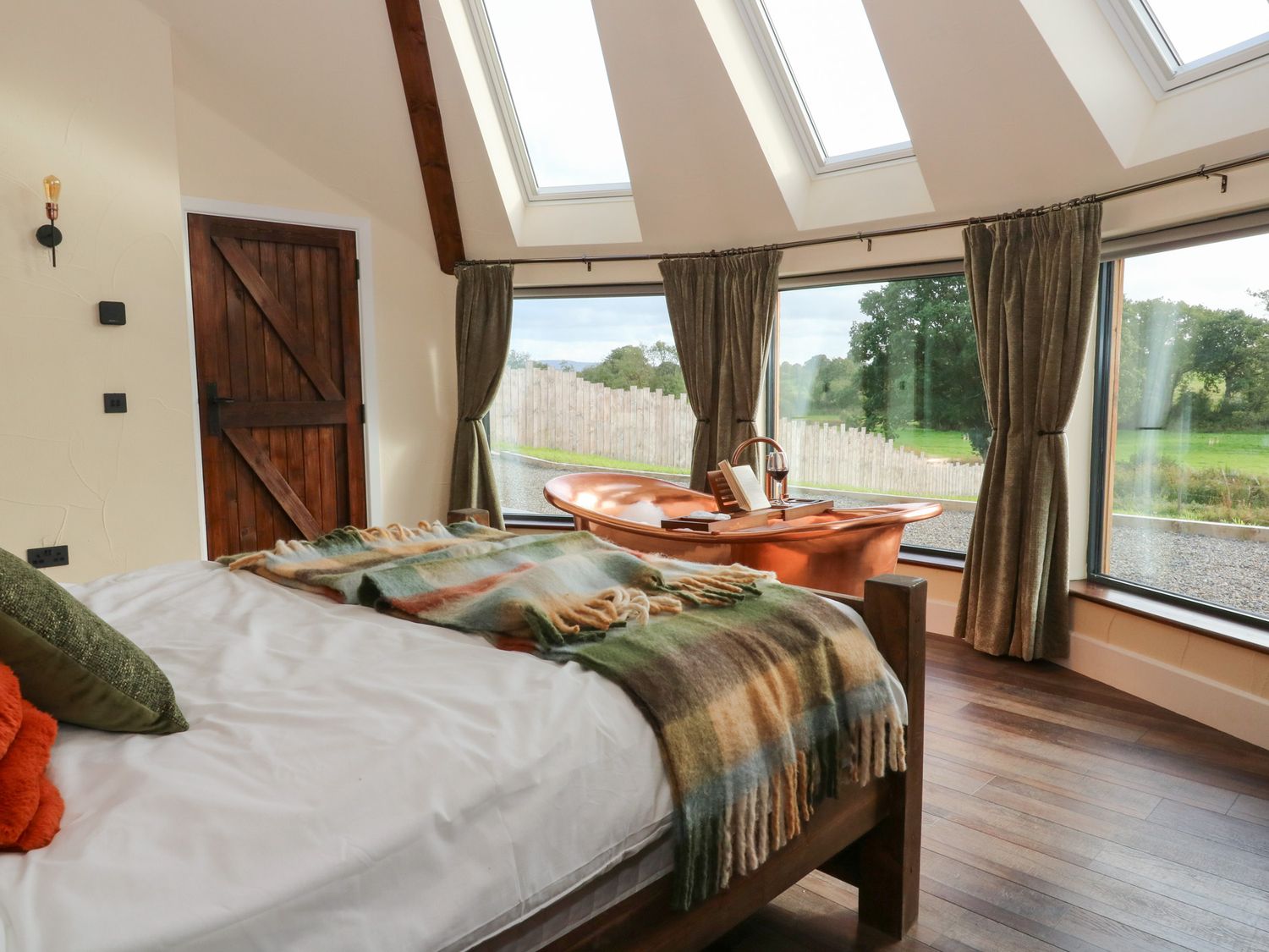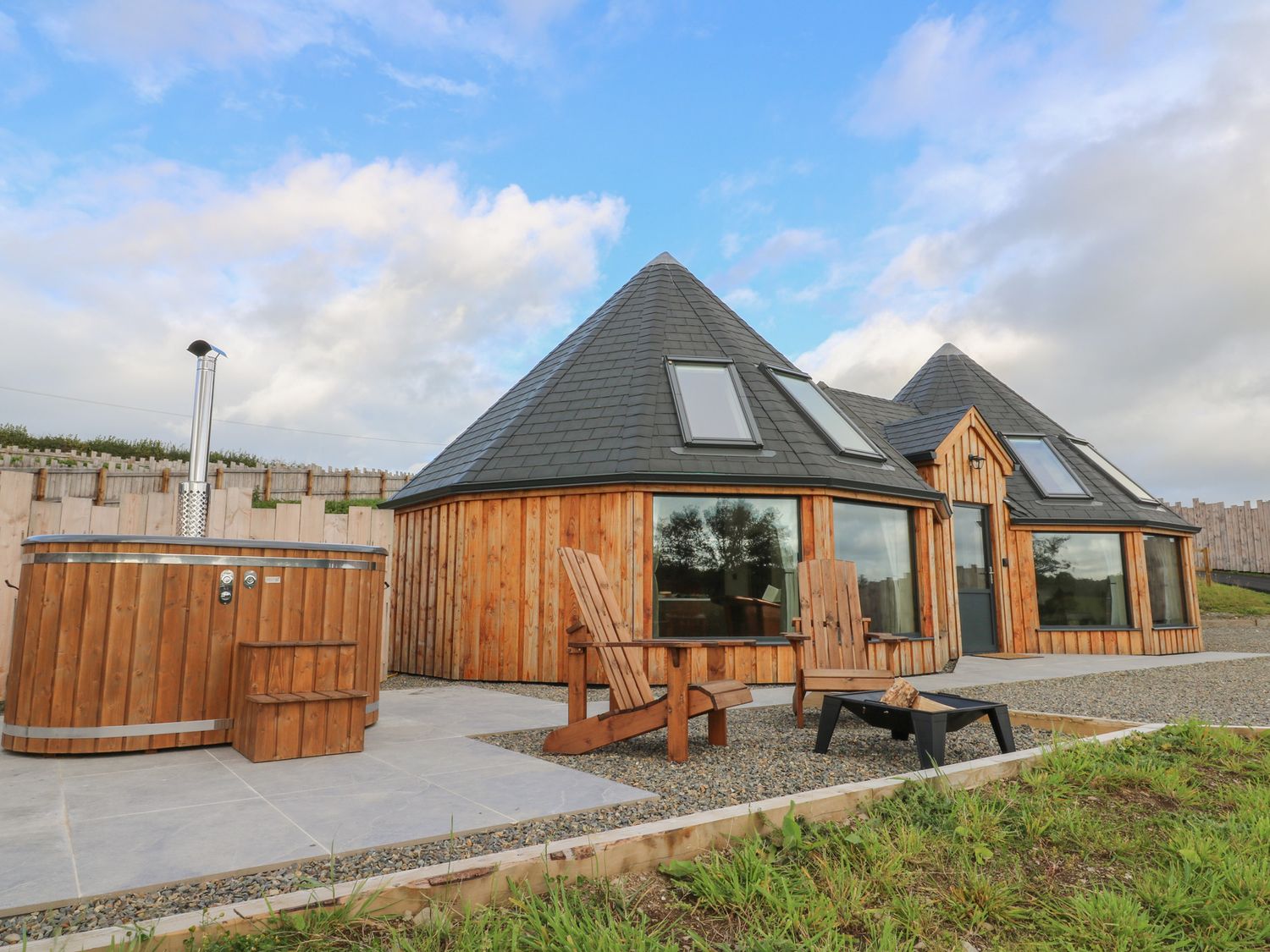 "T+À Crwn, a pair of luxurious linked roundhouses offers a kitchen with electric oven and hob, microwave, fridge with icebox, and dishwasher, a dining area with seating for two guests, and a sitting area with a Smart TV. The bedroom is king-size with air con, an amazing freestanding copper bath tub and an en-suite shower room. WiFi, fuel, power, bed linen, and towels are included in the rent. Outside, there is an enclosed garden with a lawn, private patio with furniture, fire pit, and wood-fired hot tub, and off-road parking for two cars. Two well-behaved dogs are welcome - -ú25 per pet per stay. Sorry, no smoking. Within 2.9 miles you will find a shop, a pub within 2.1 miles, and a river within 0.1 miles. Soak in the hot tub whilst soaking in the breath-taking views at Ty Crwn Note: Although the garden is enclosed, the gate is a bar, so please take care for small dogs. Note: Outside hose is available for washing down dogs. This property has Good House Keeping Bond of 250 GBP"