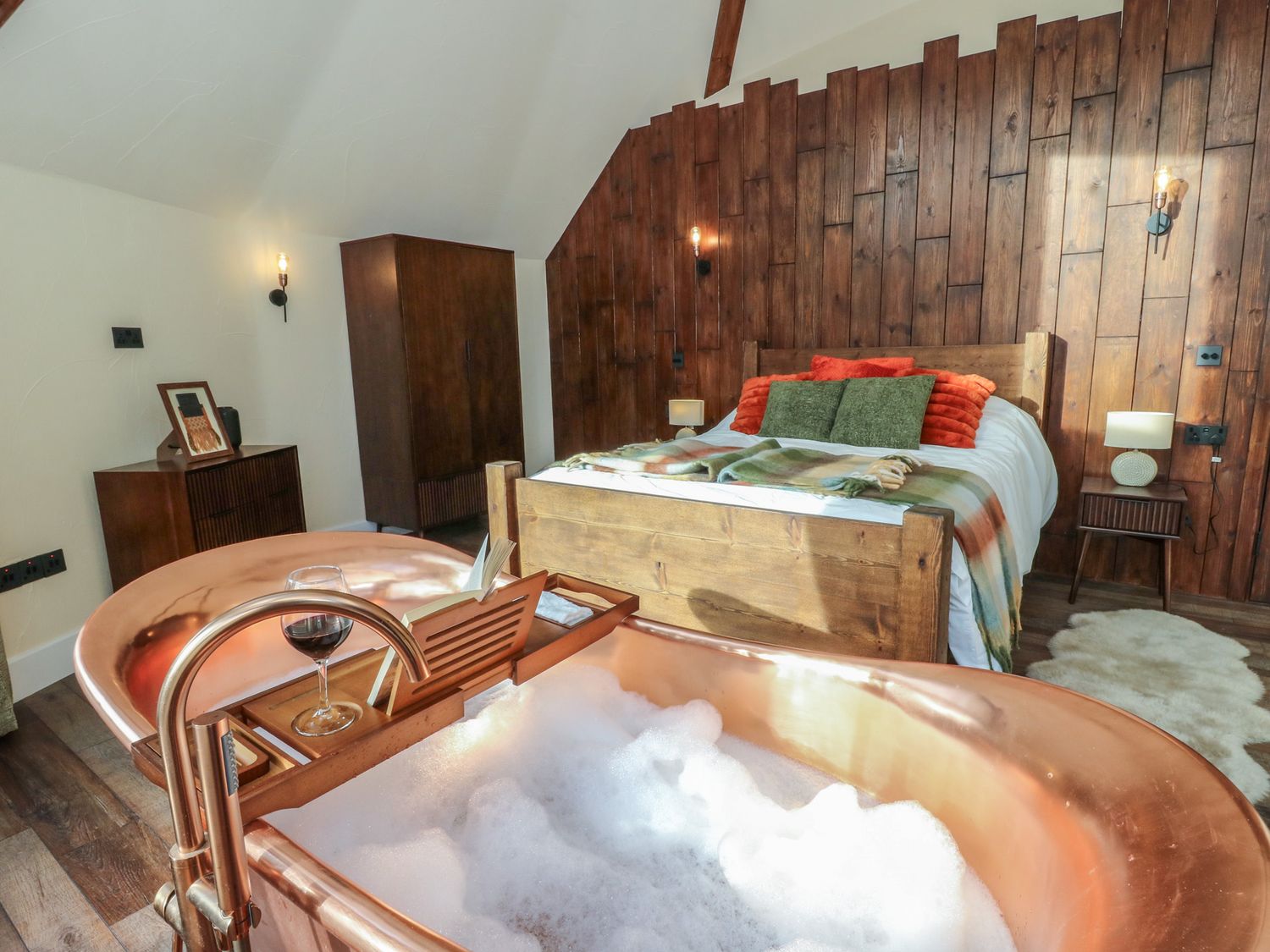 "Ground Floor accommodation. One king-size with air con, freestanding copper bath and en-suite with walk-in shower, basin, heated towel rail and WC. Open-plan living space with kitchen, dining area and sitting area"