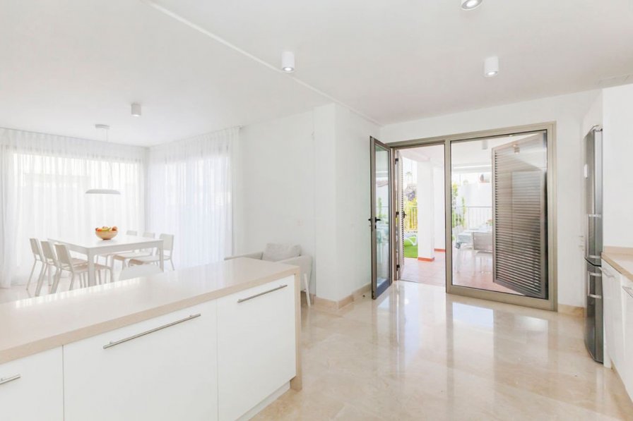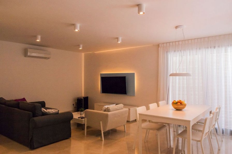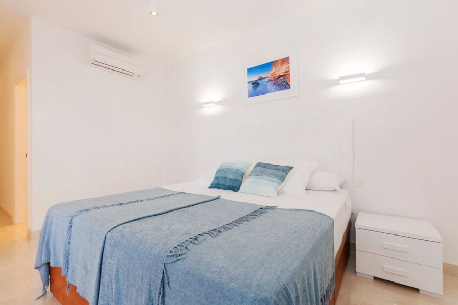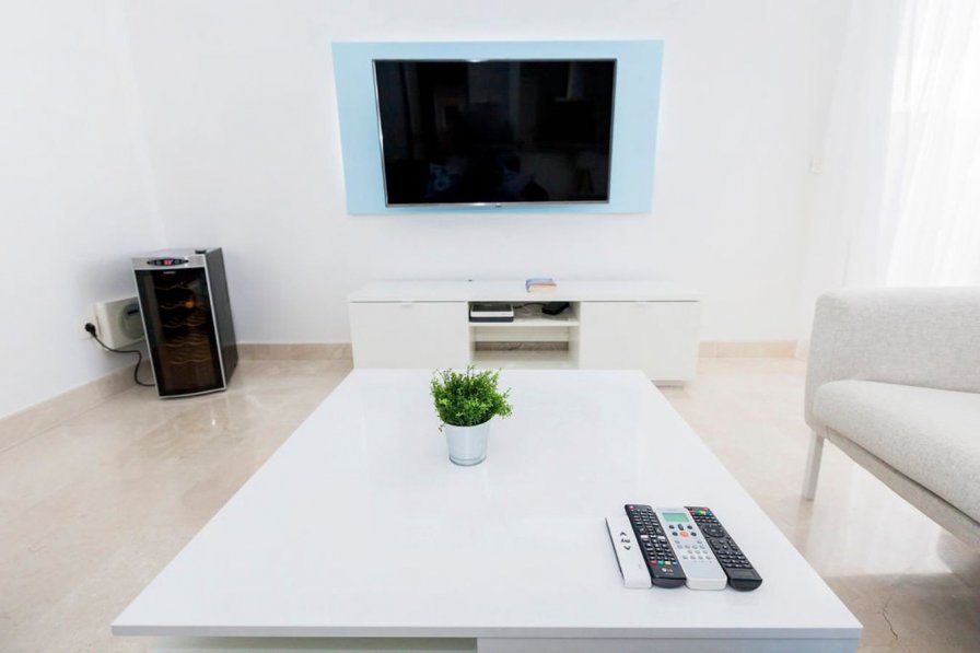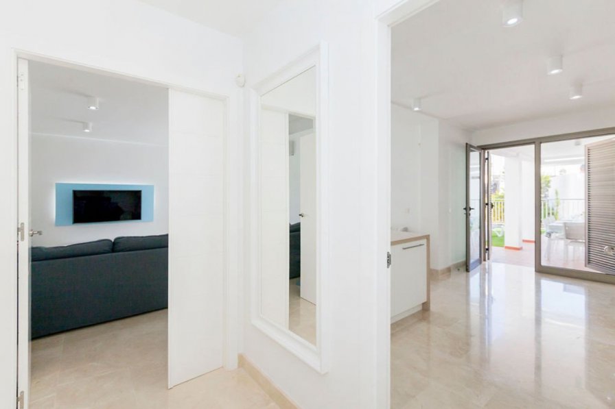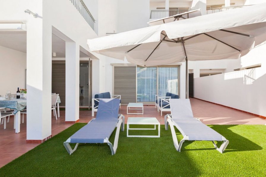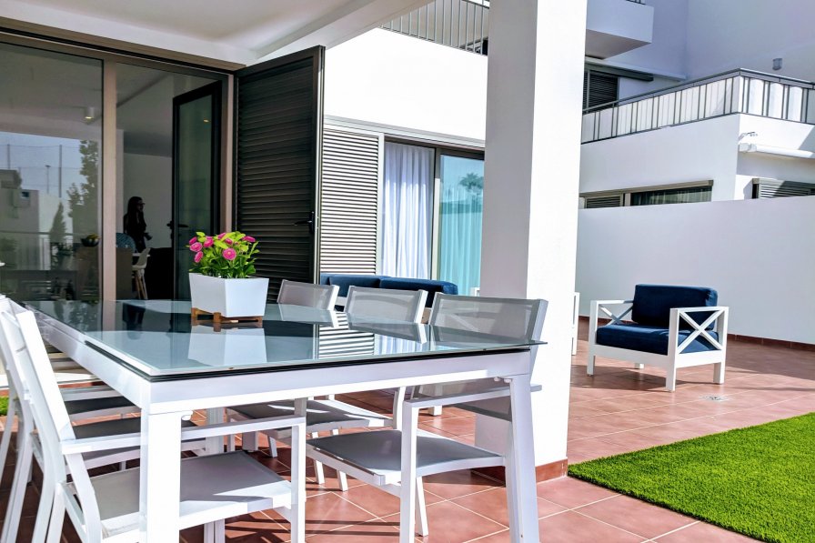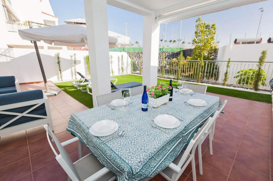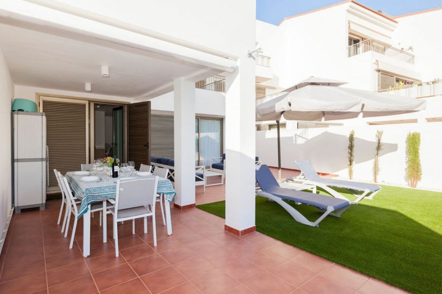 Ground floor apartment recently decorated with 2 bedrooms (100 m2) and a large private terrace (90 m2), right in front of the mini golf, and a few steps from the giant pool, within an excellent complex "Magnolia Golf Resort", in La Caleta de Adeje. Only 10 minutes walk from the fishing village of La Caleta and the beach. More details. -Internet wifi high speed free. -Pool, Gym and Sauna. -Great green areas and gardens. This Apartment is not suitable for groups of singles. Applications will not be accepted.