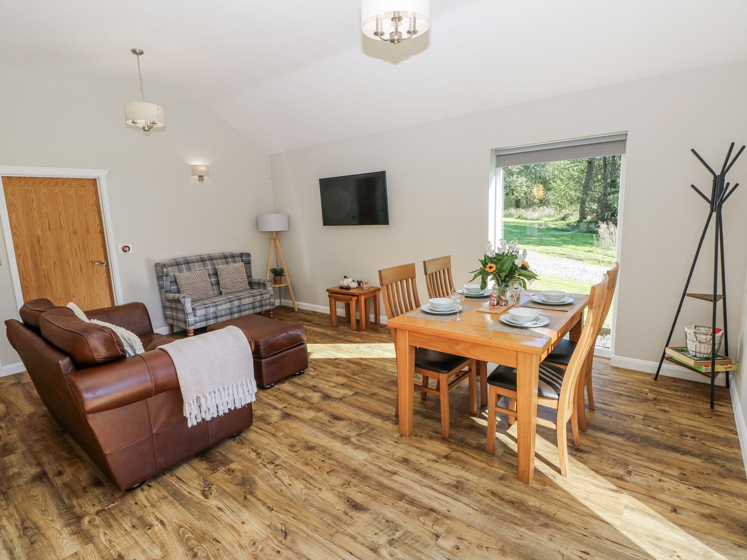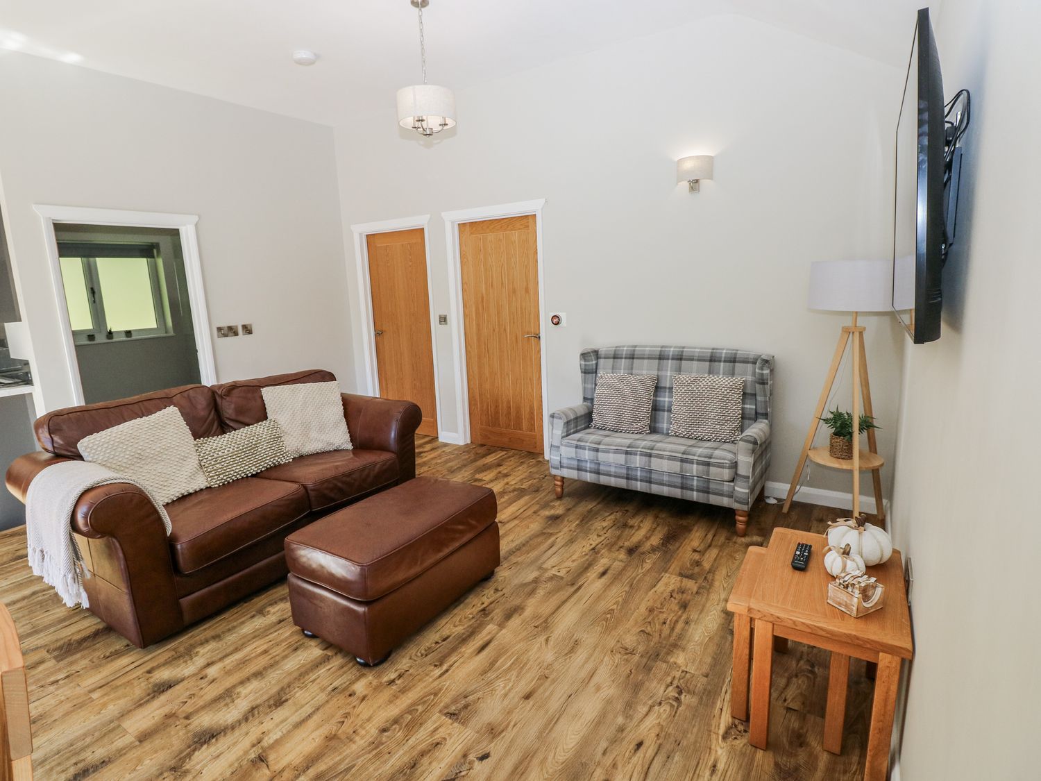 "Two bedrooms: 1 x king-size with TV, 1 x twin (zip/link, can be super-king-size on request). Shower room with walk-in shower, basin and WC. Open-plan living space with kitchen, dining area and sitting area"