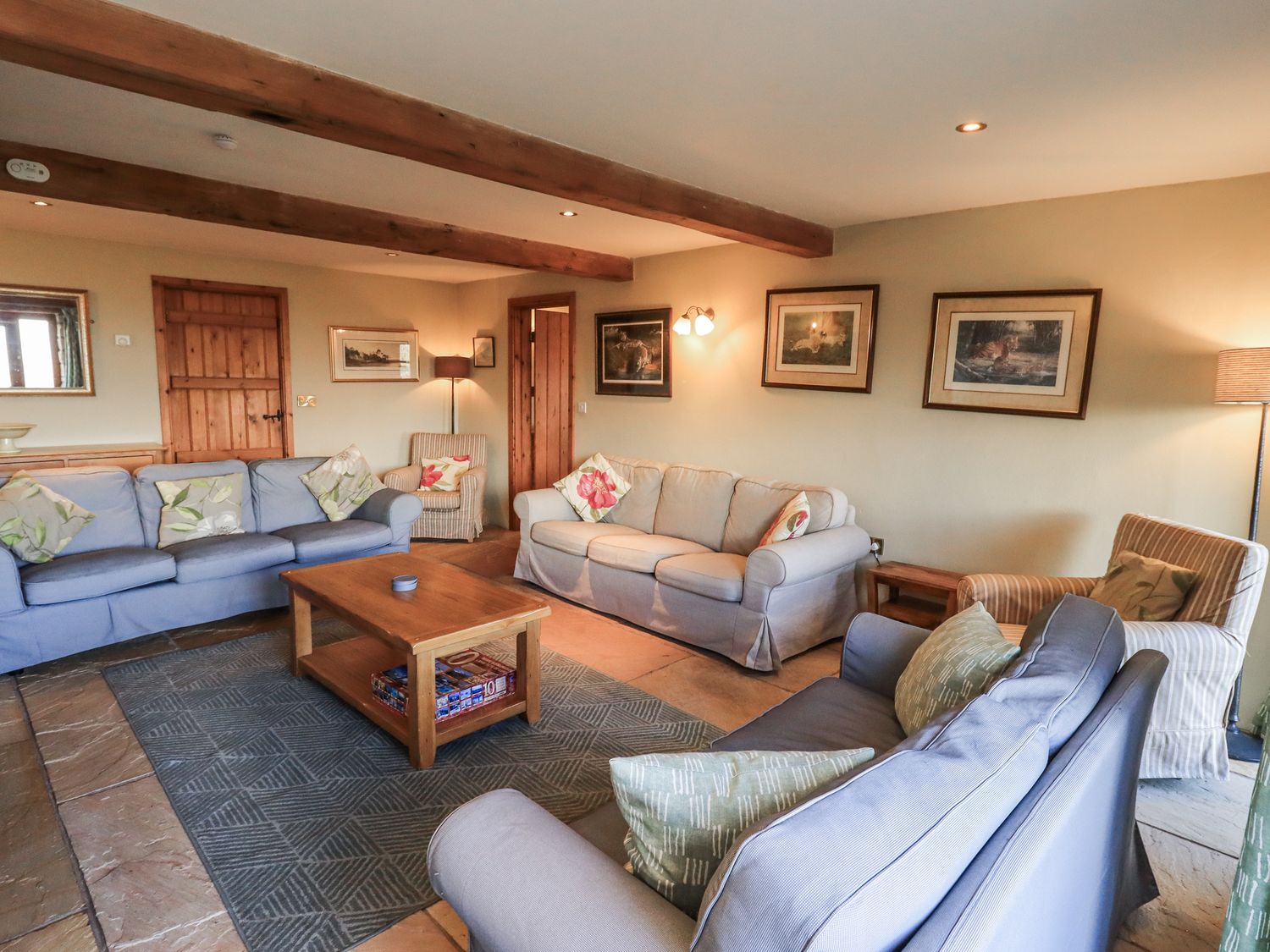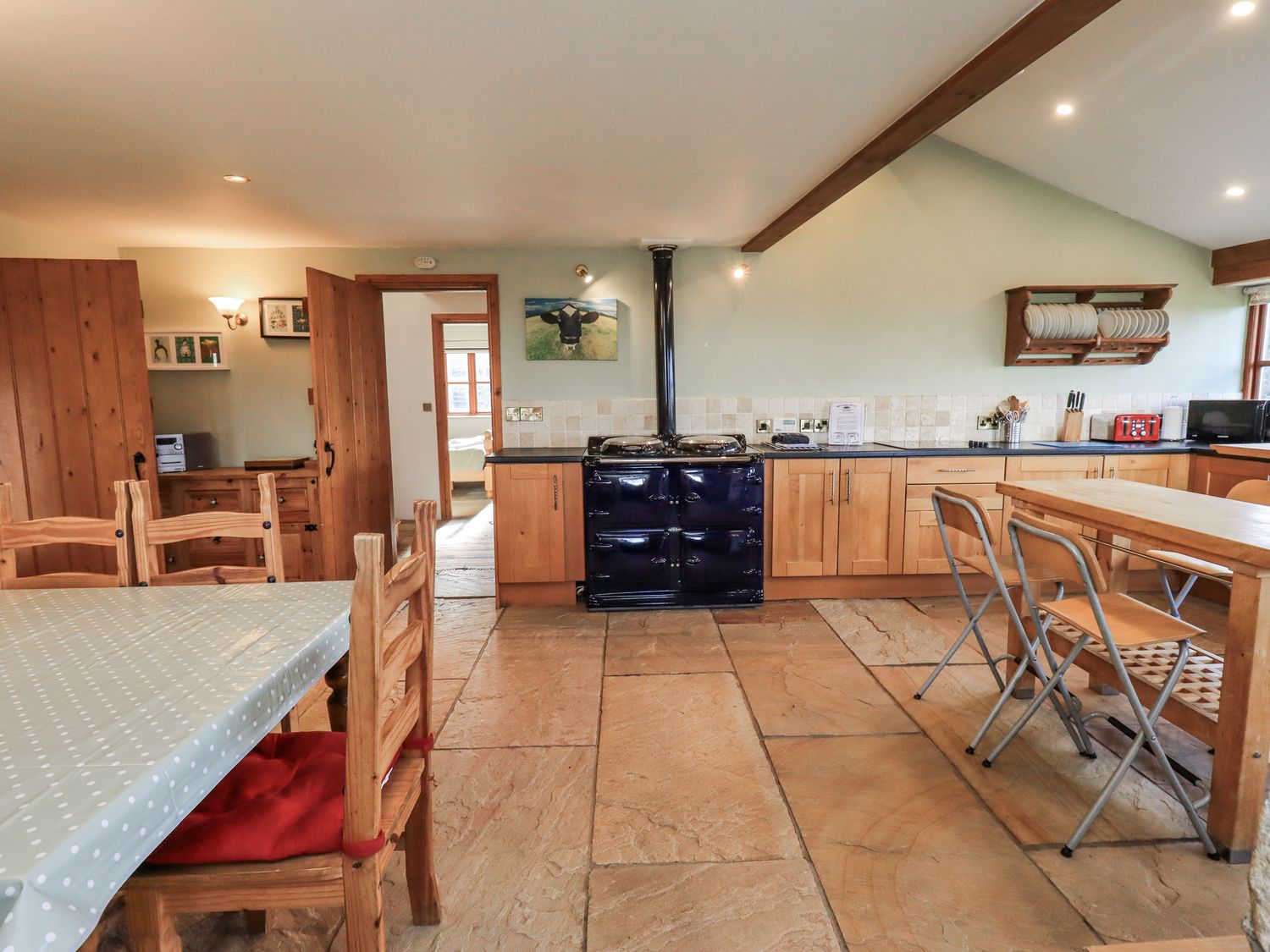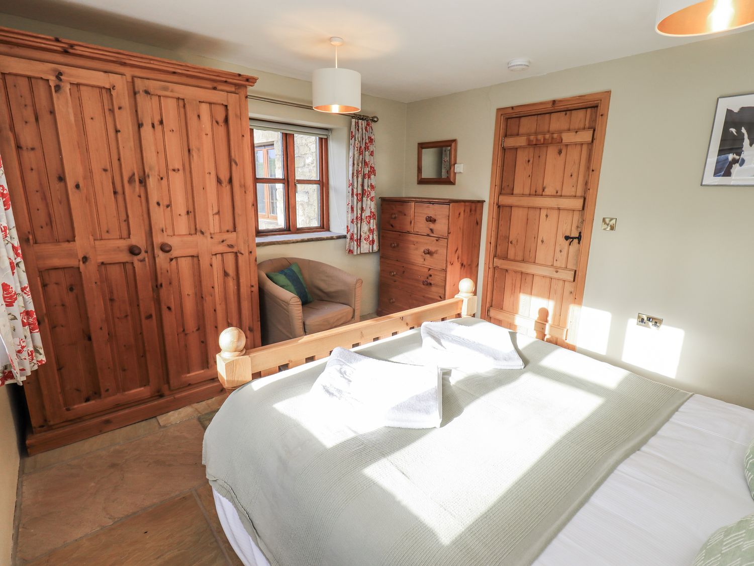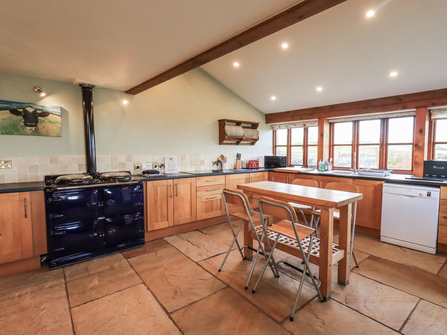 "Five bedrooms: 1 x ground-floor super-king-size, 1 x king-size with en-suite wet room with walk-in shower, basin & WC, 1 x double, 2 x singles. Bathroom with bath, walk-in shower, basin and WC. Ground-floor shower room with walk-in shower, basin and WC. Kitchen/diner. Utility. Sitting room with woodburning stove"