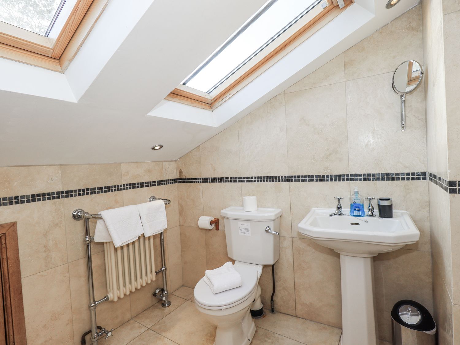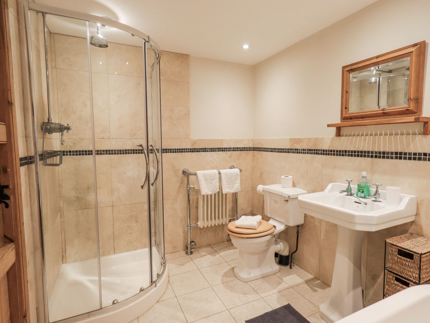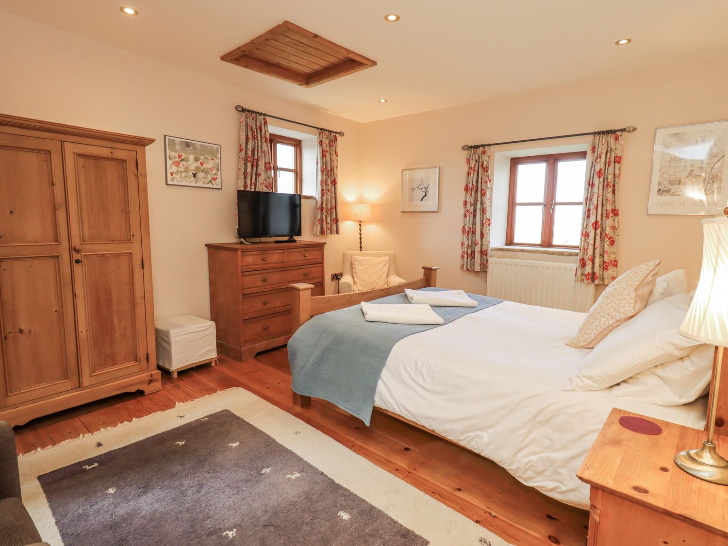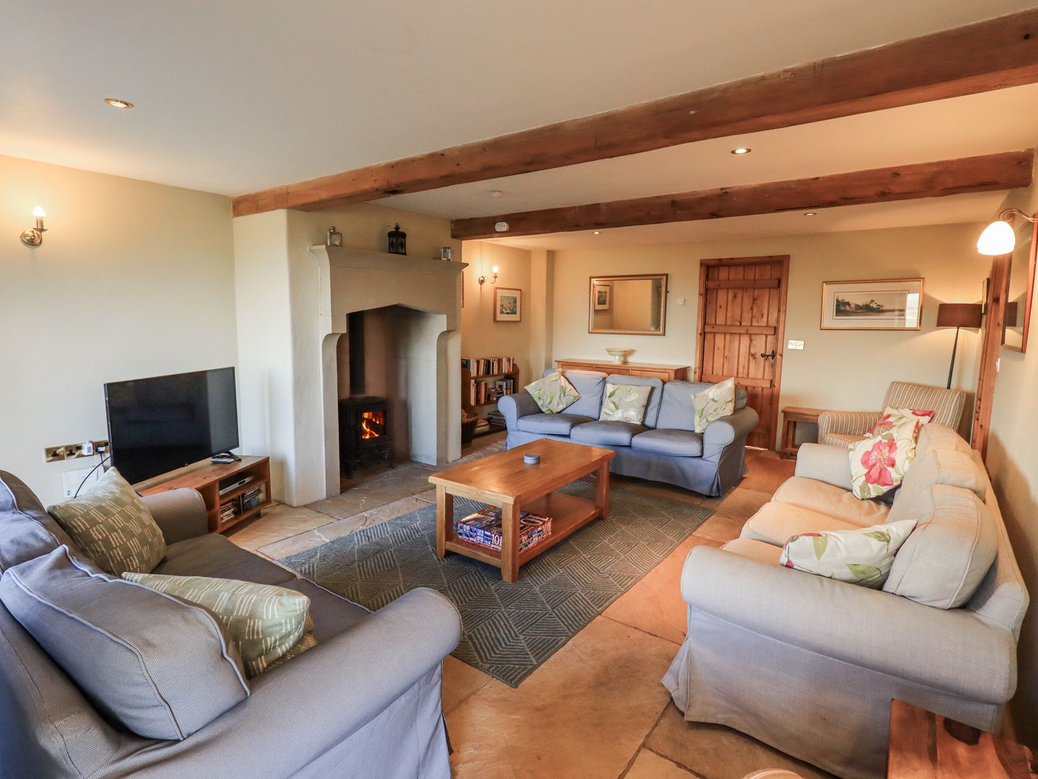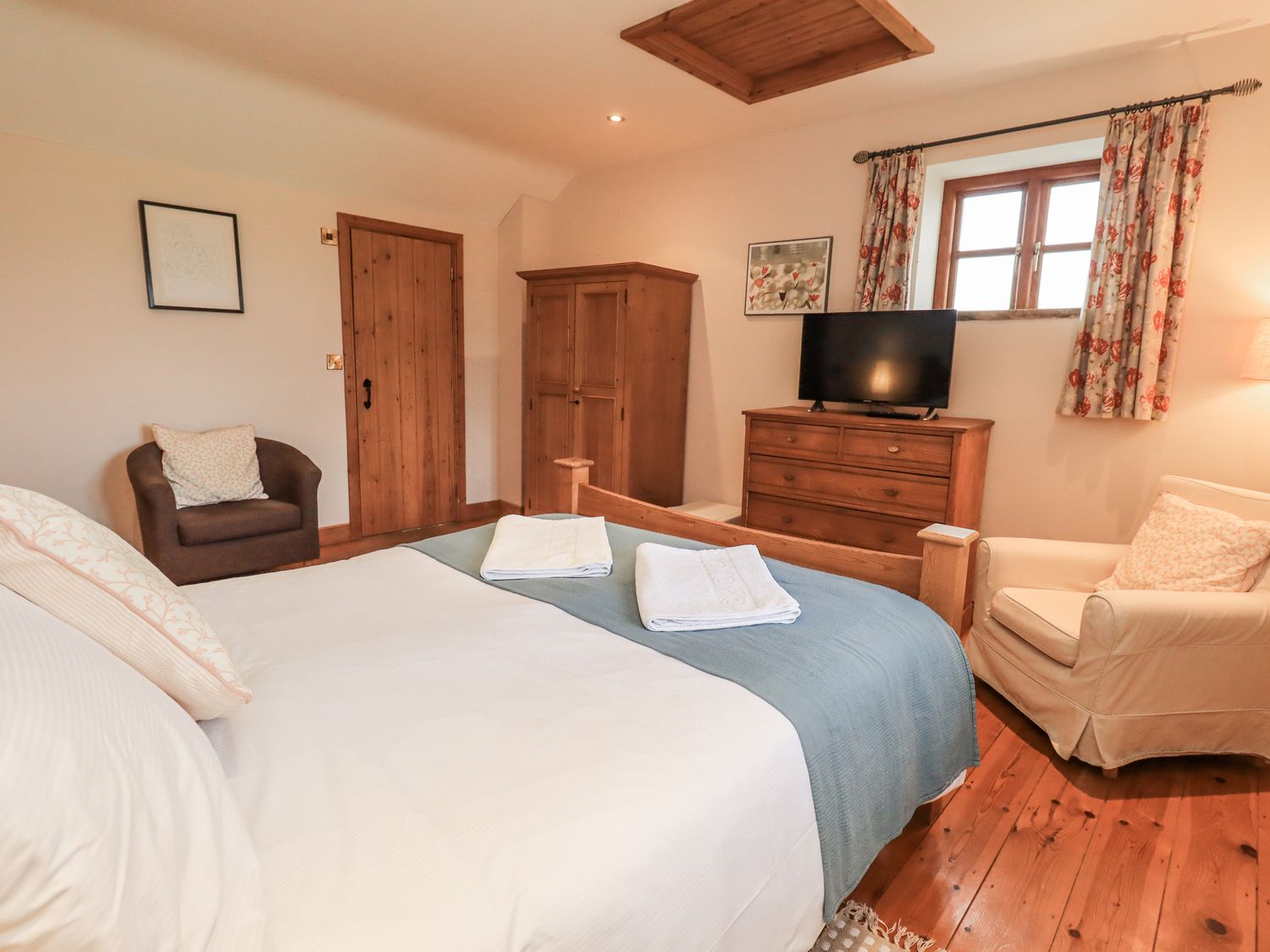 "Five bedrooms: 1 x ground-floor super-king-size, 1 x king-size with en-suite wet room with walk-in shower, basin & WC, 1 x double, 2 x singles. Bathroom with bath, walk-in shower, basin and WC. Ground-floor shower room with walk-in shower, basin and WC. Kitchen/diner. Utility. Sitting room with woodburning stove"