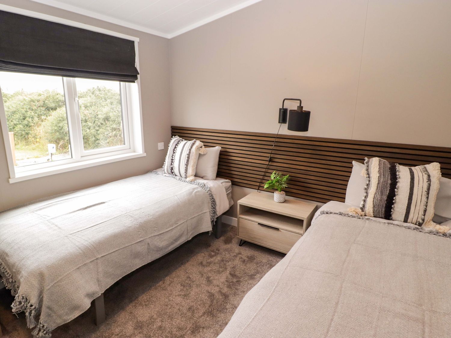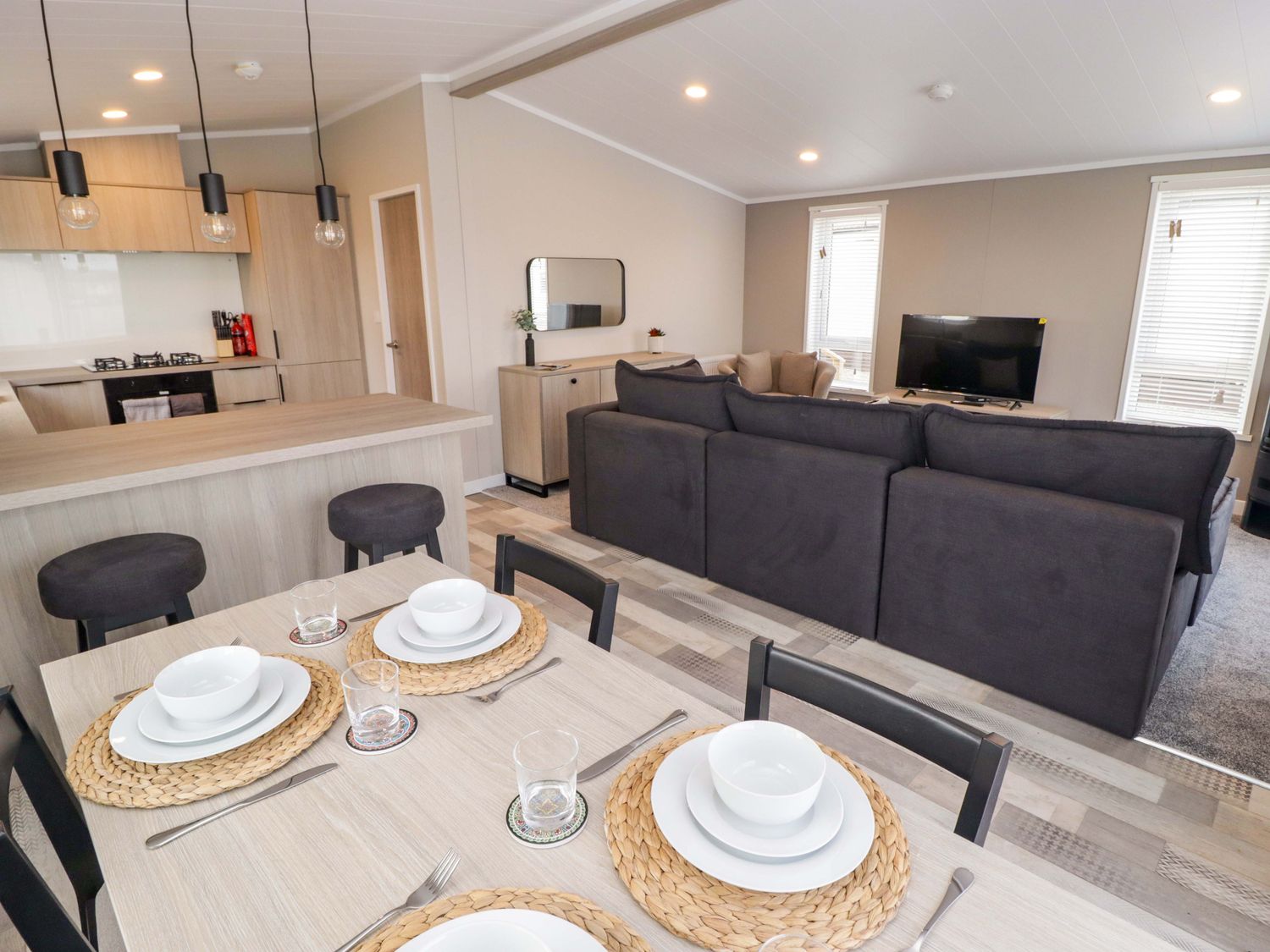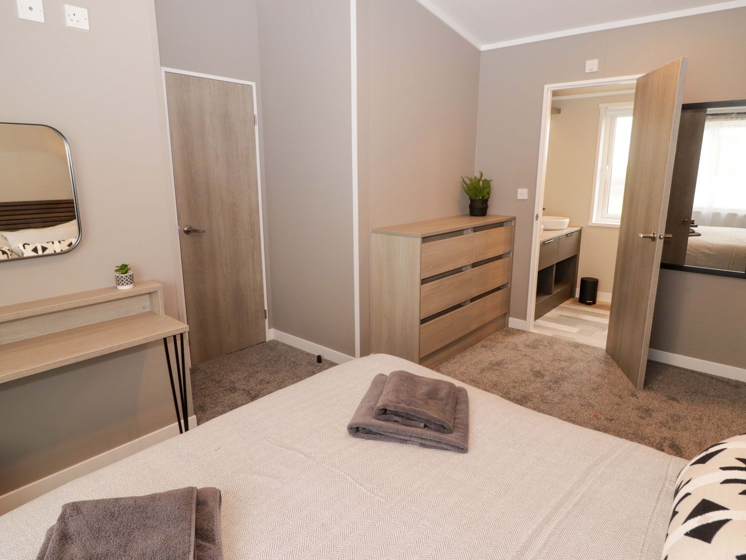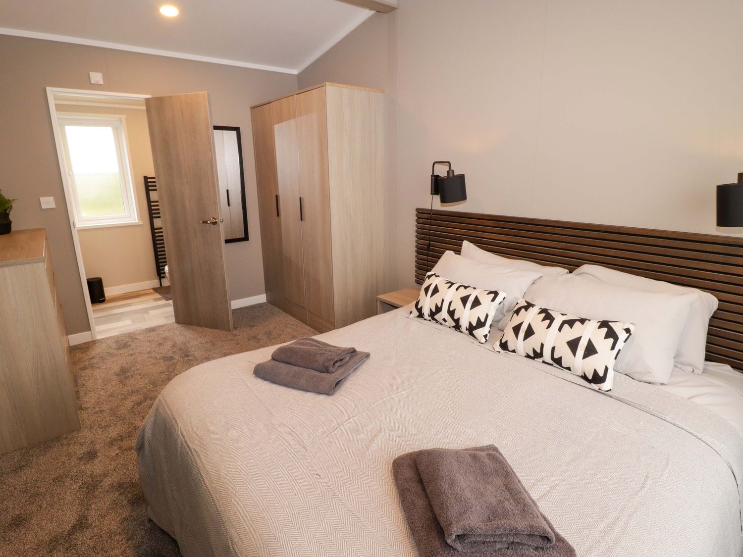 "Single-storey. Two bedrooms: 1 x king-size with en-suite with walk-in shower, double basin, and heated towel rail and WC, 1 x twin. Bathroom with bath, shower over, basin, heated towel rail, WC. Open-plan living space with kitchen, dining area and sitting area with electric fire"