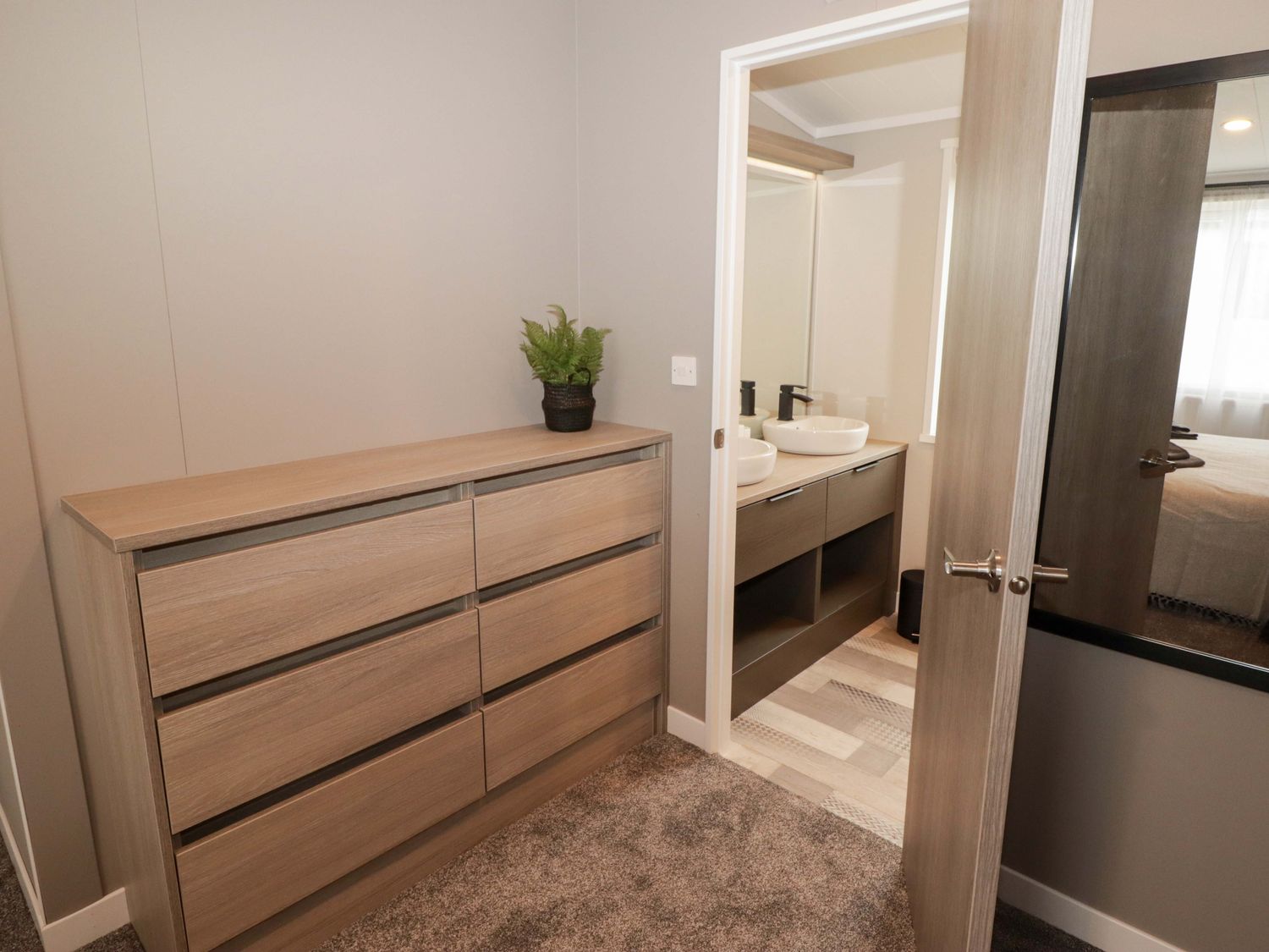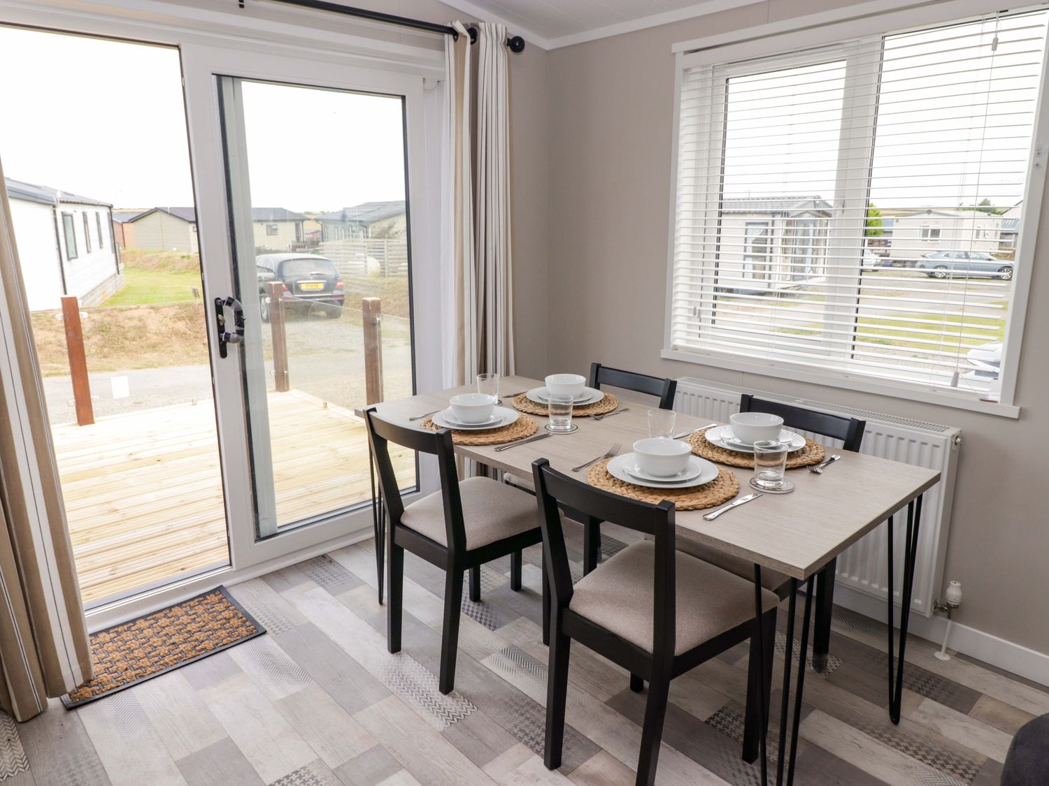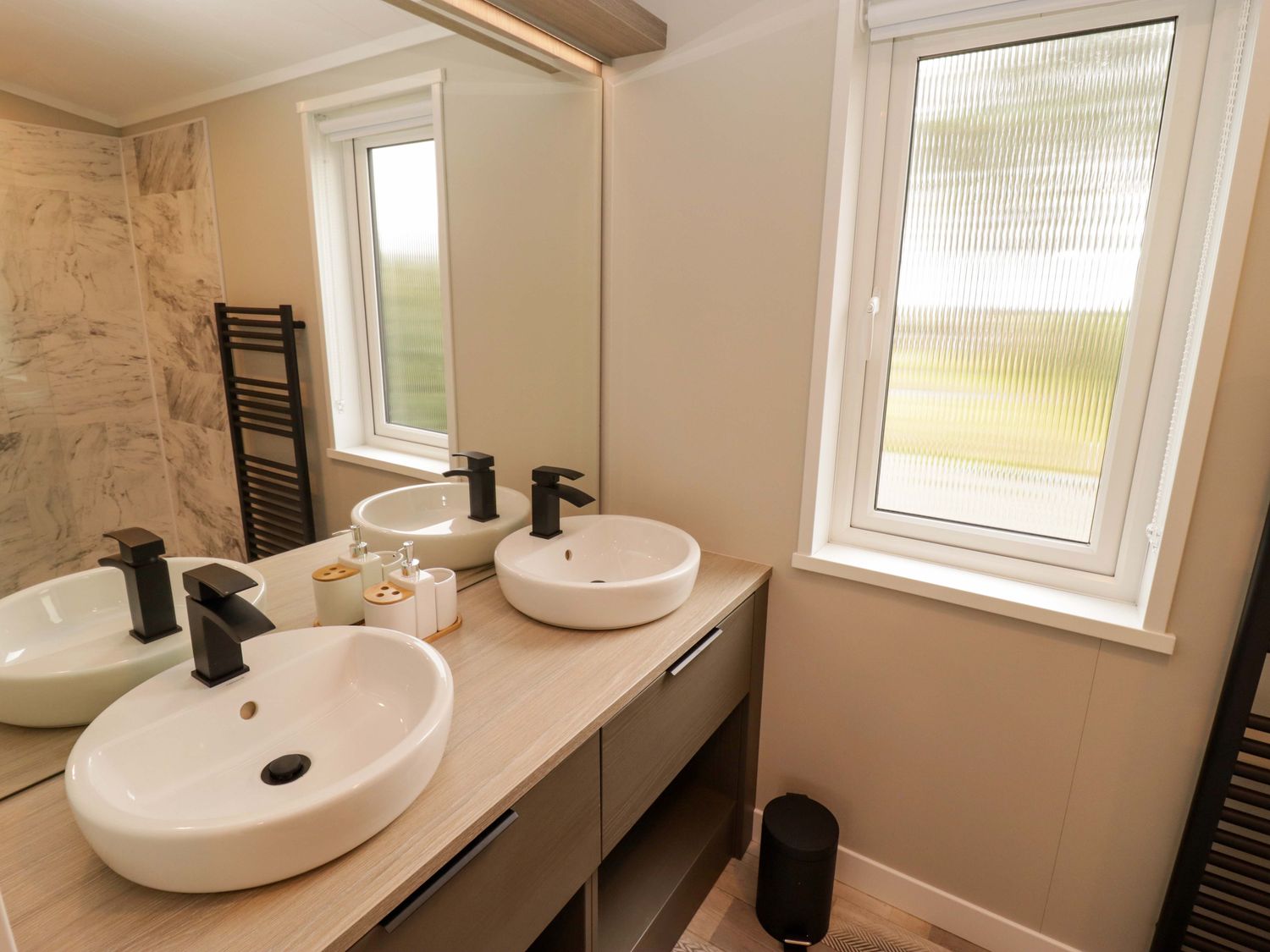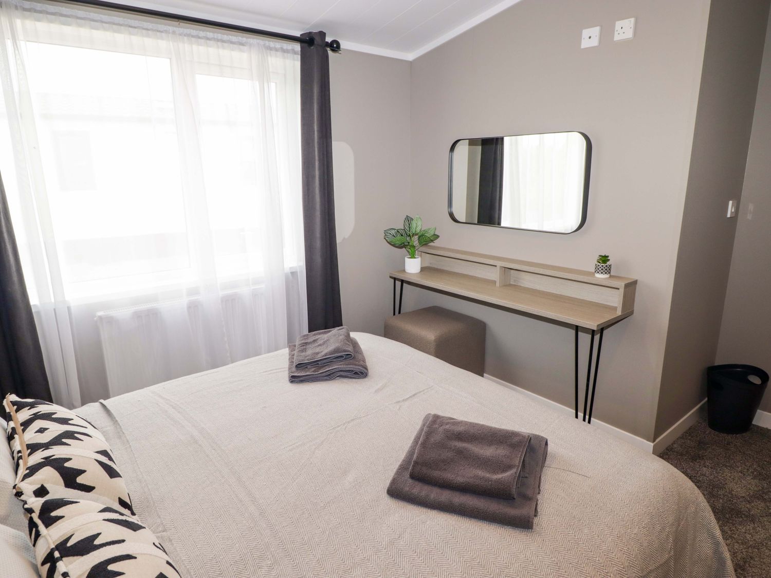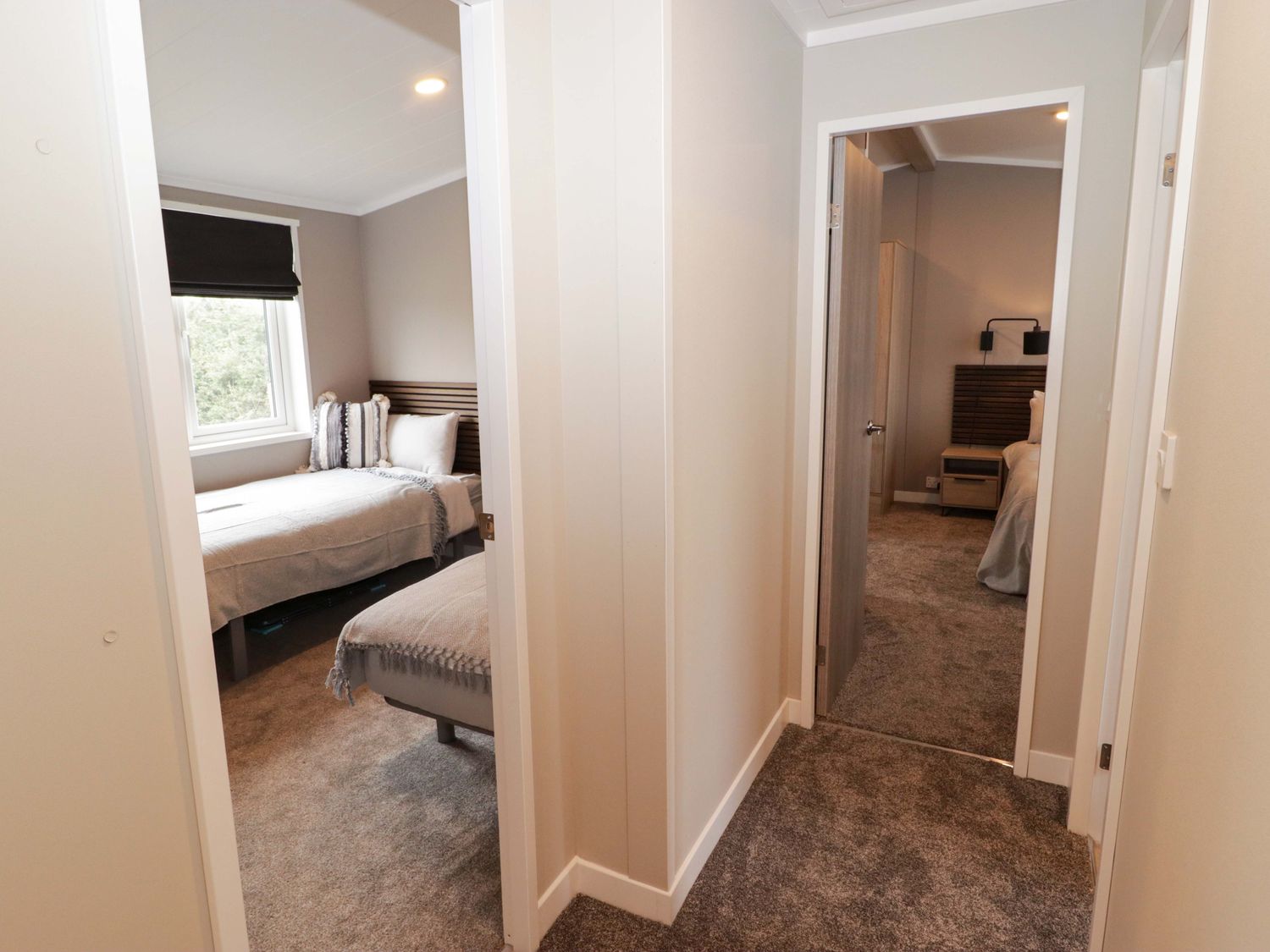 "Single-storey. Two bedrooms: 1 x king-size with en-suite with walk-in shower, double basin, and heated towel rail and WC, 1 x twin. Bathroom with bath, shower over, basin, heated towel rail, WC. Open-plan living space with kitchen, dining area and sitting area with electric fire"
