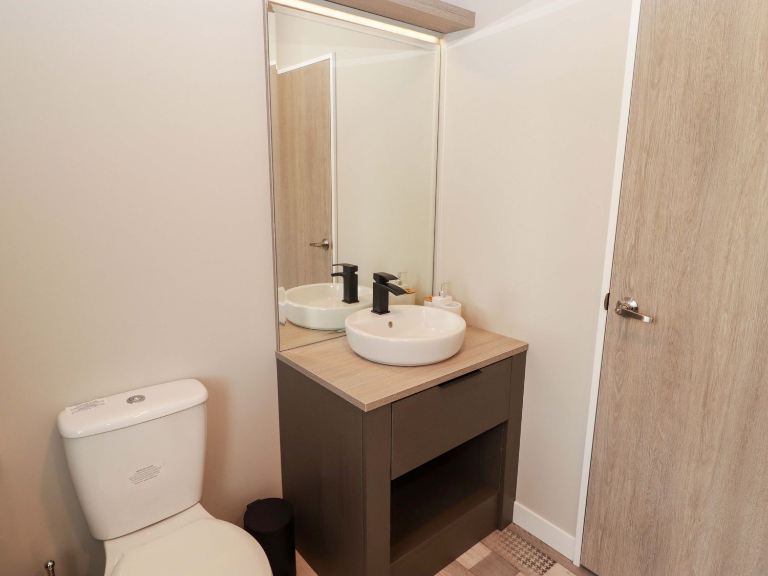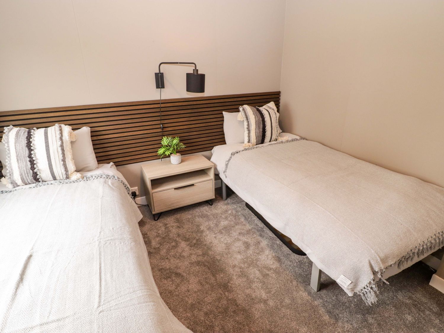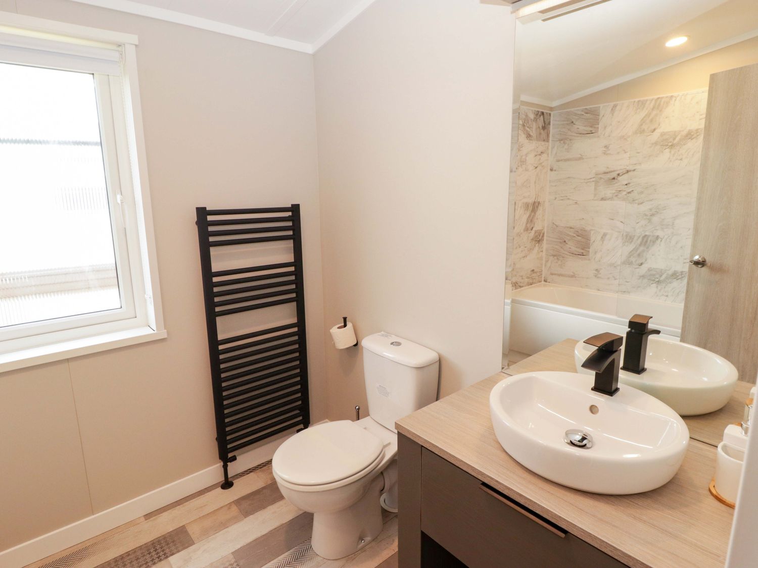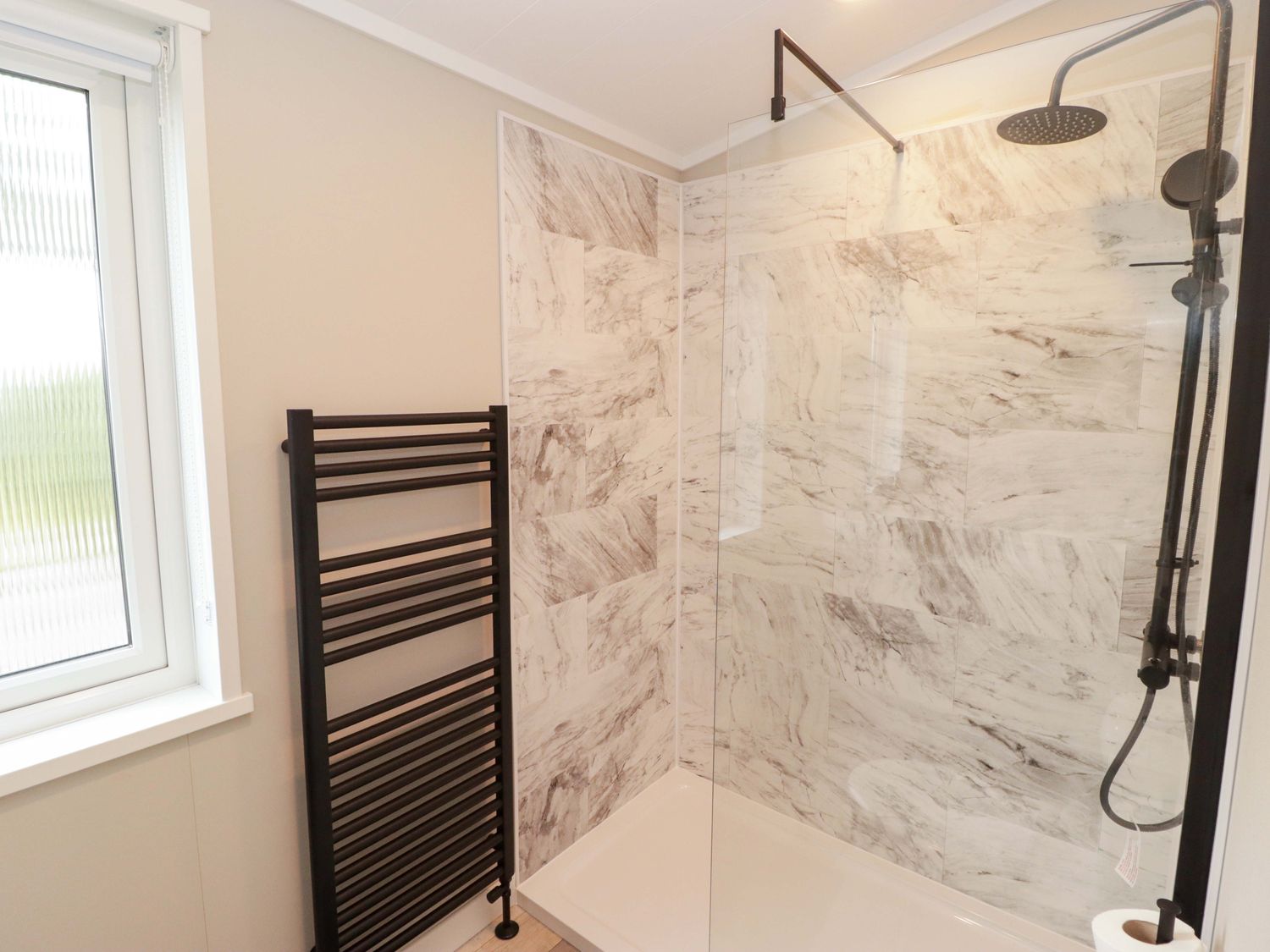 "Single-storey. Two bedrooms: 1 x king-size with en-suite with walk-in shower, double basin, and heated towel rail and WC, 1 x twin. Bathroom with bath, shower over, basin, heated towel rail, WC. Open-plan living space with kitchen, dining area and sitting area with electric fire"