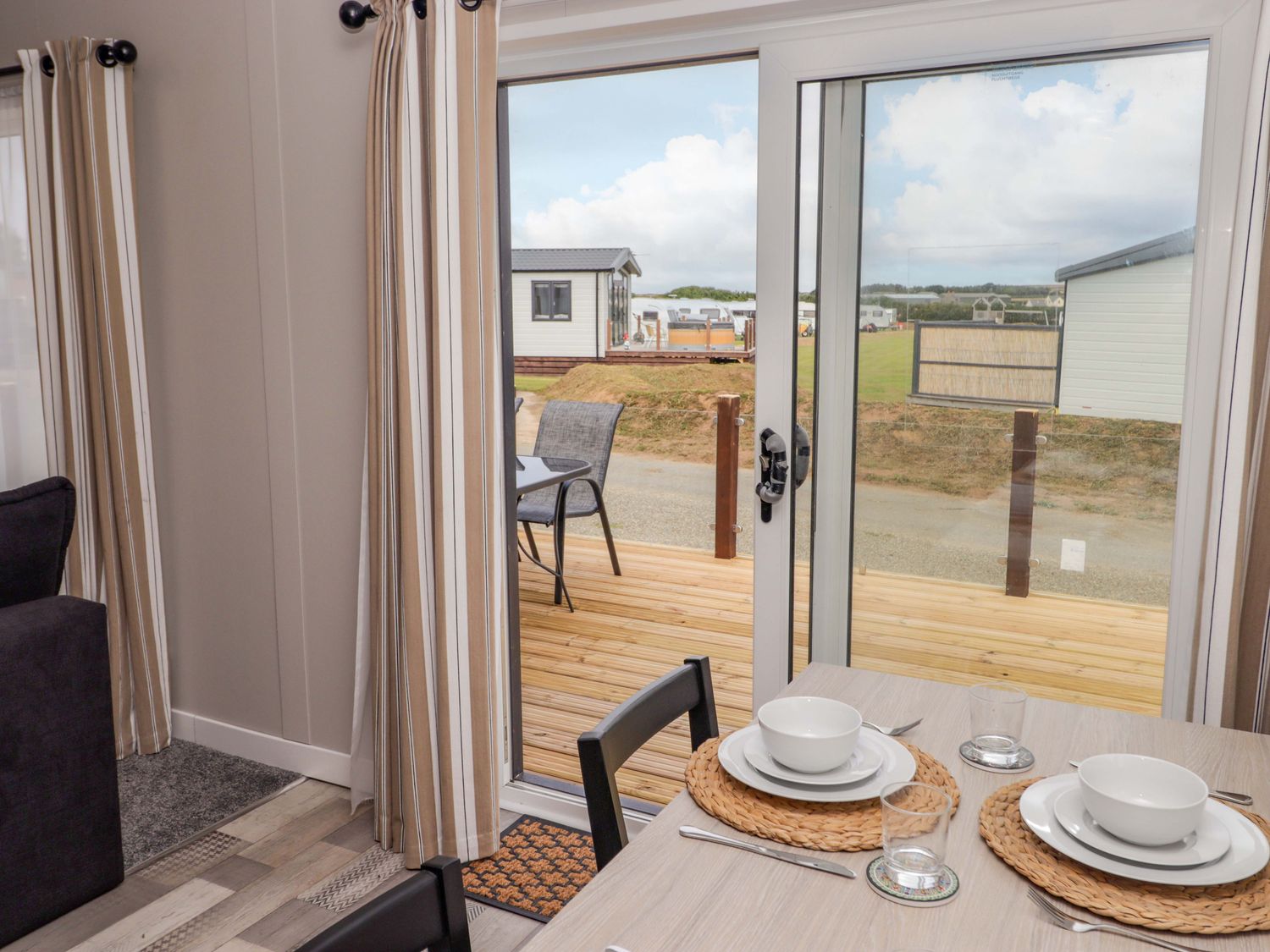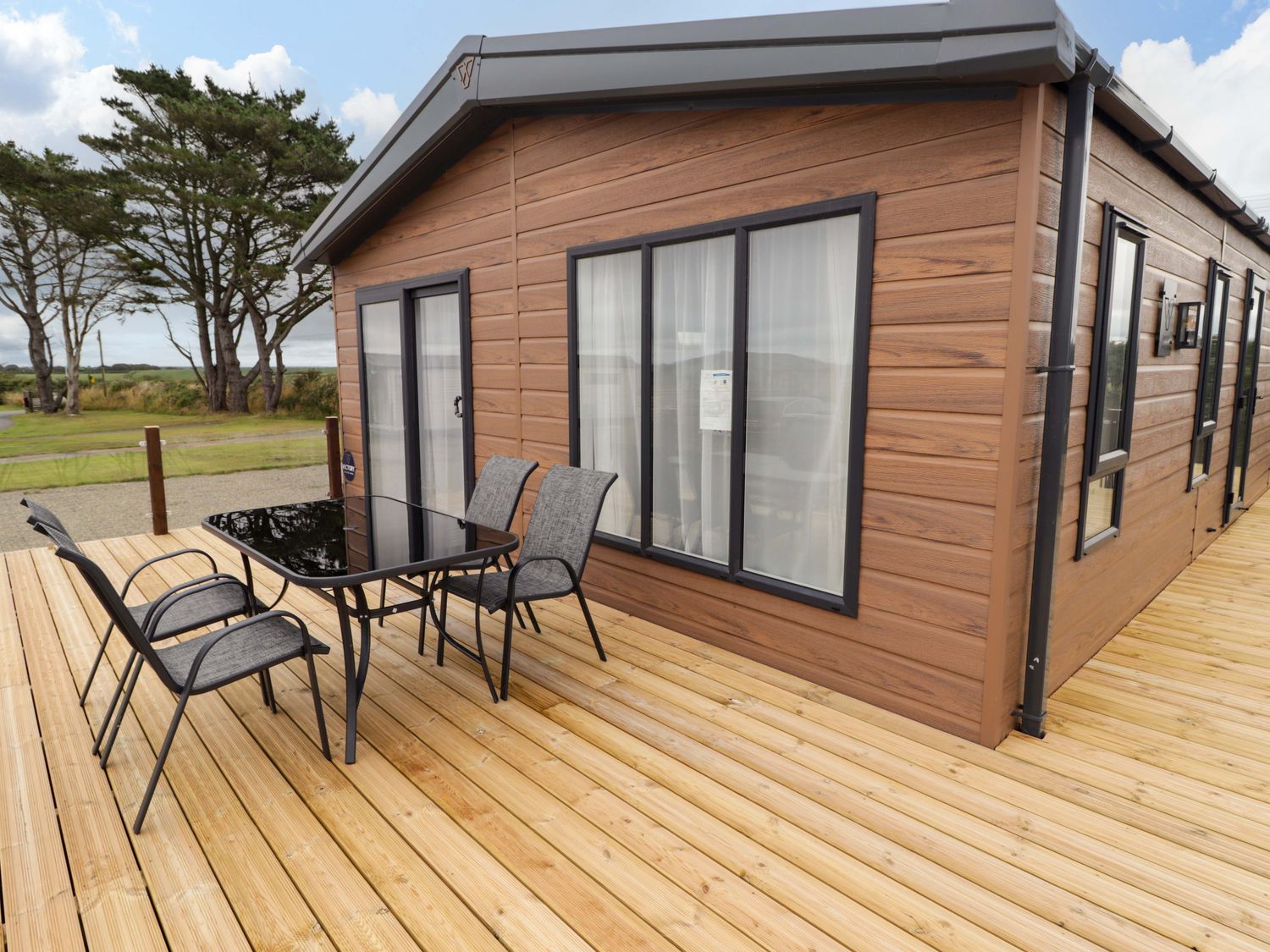 "Dolphin, a single-storey charming holiday lodge, consists of a kitchen with microwave, toaster, kettle, dishwasher, fridge/freezer, oven, and gas hob, a dining room with dining seating and breakfast bar, and a sitting room with Smart TV and electric fire. The bedrooms consist of a king-size with en-suite and twin. There is a bathroom with bath, shower over, basin, and heated towel rail and WC. WiFi, fuel, power, bed linen, and towels are included in the rent. Outside, there is an enclosed front decking with furniture and off-road parking for two cars. Sorry, no pets and no smoking. Dolphin is a wonderful escape to Pembrokeshire, whatever time of year."