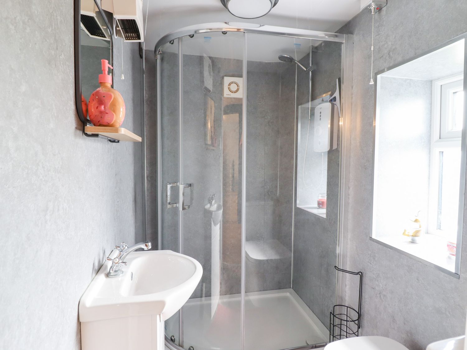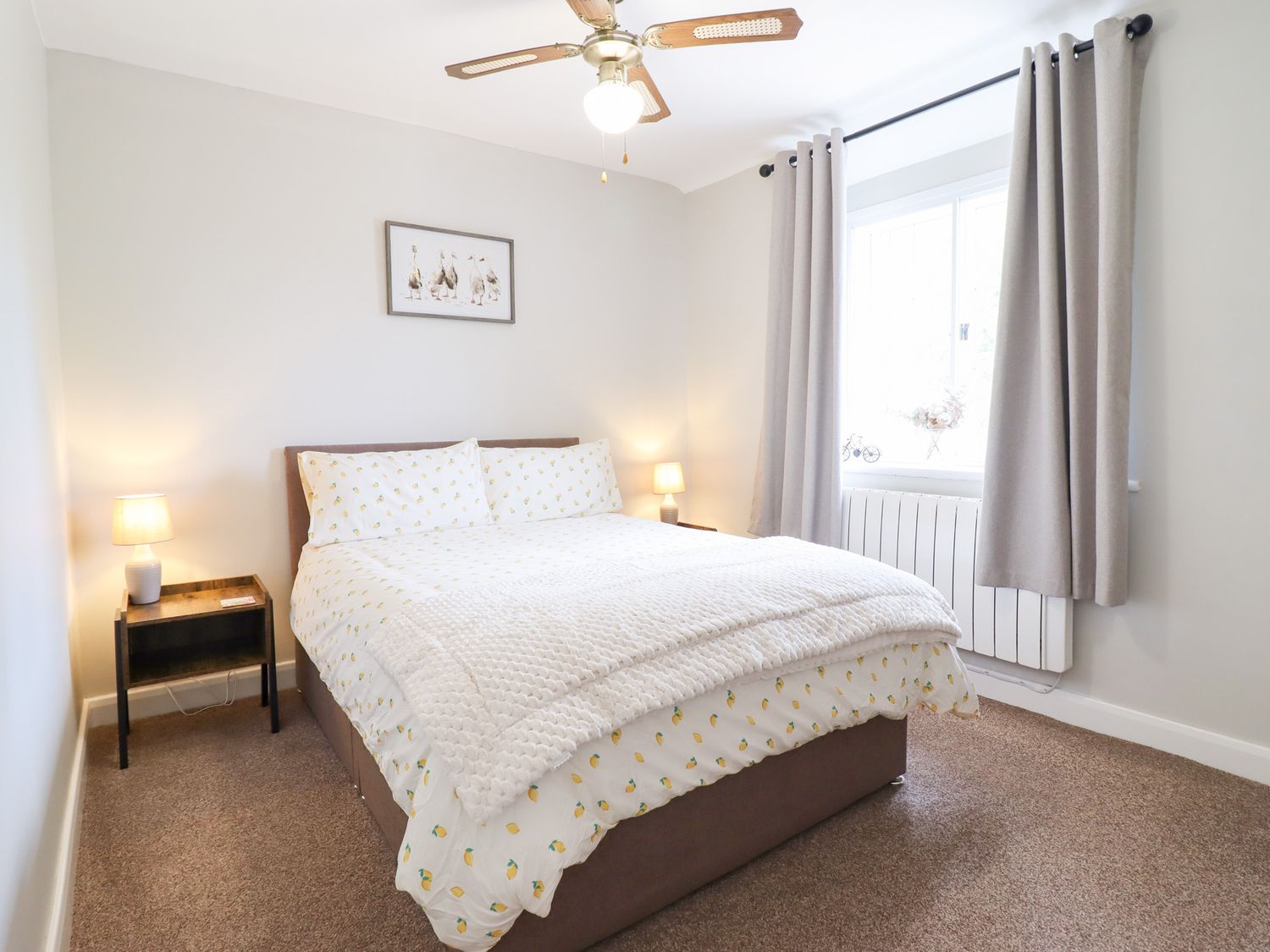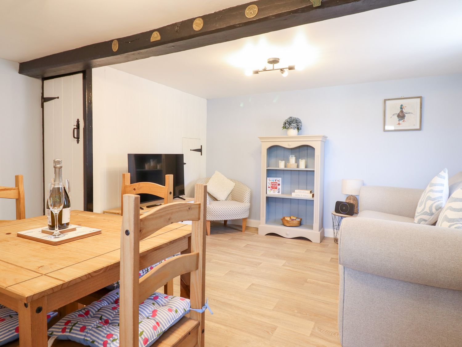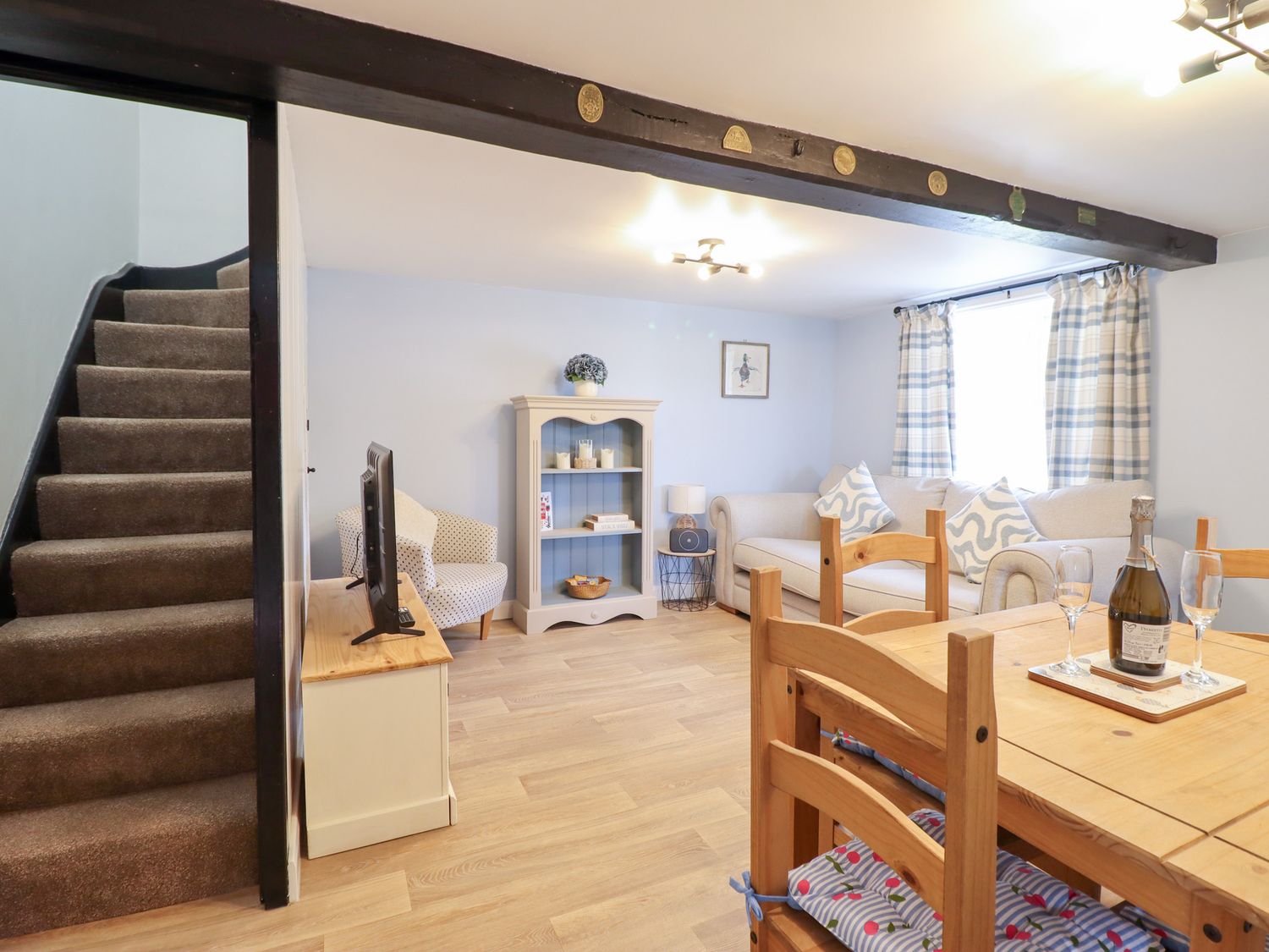"Two bedrooms: 1 x king-size, 1 x twin. Ground-floor shower room with walk-in shower, basin, and WC. Open-plan living space with kitchen, dining area and sitting area "
