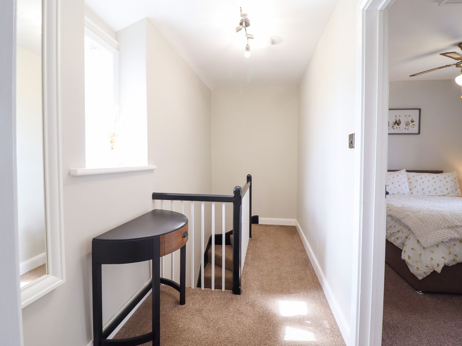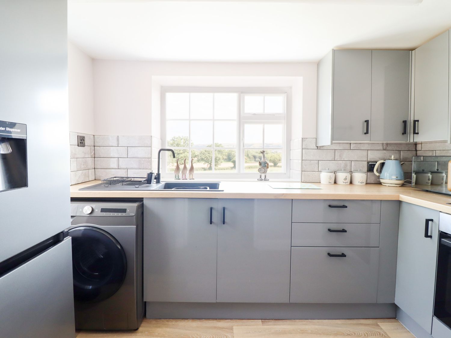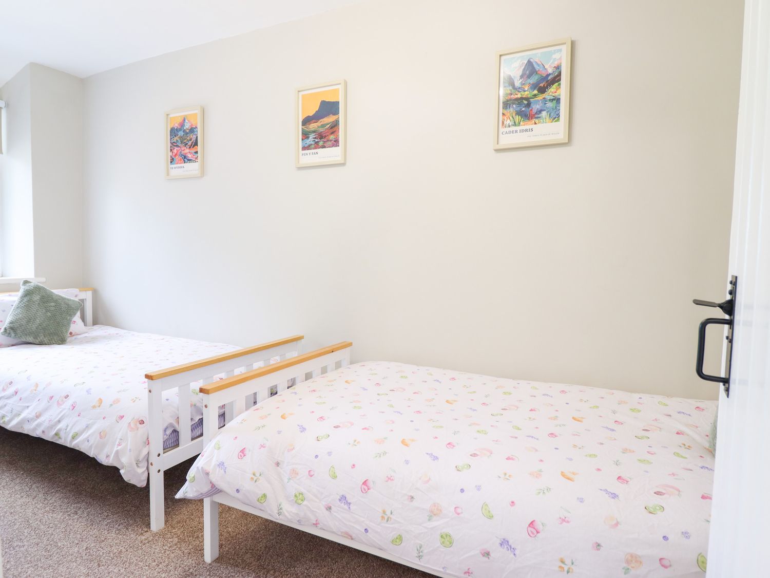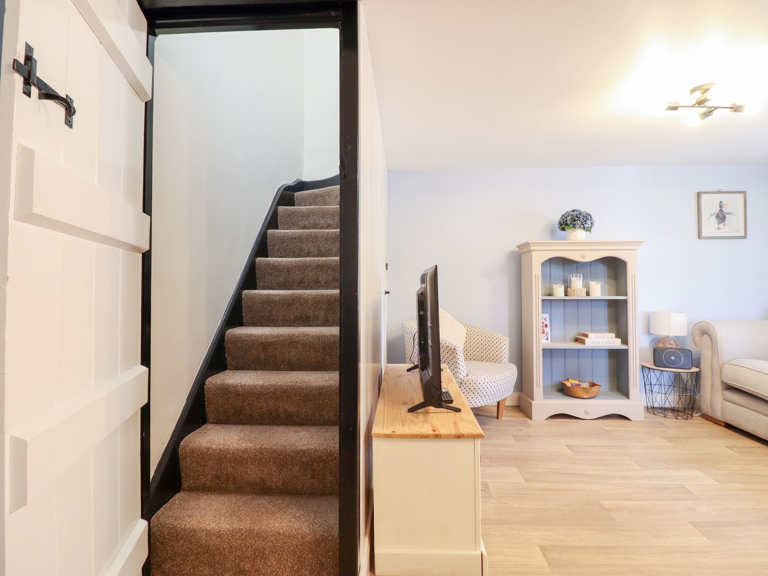"Two bedrooms: 1 x king-size, 1 x twin. Ground-floor shower room with walk-in shower, basin, and WC. Open-plan living space with kitchen, dining area and sitting area "