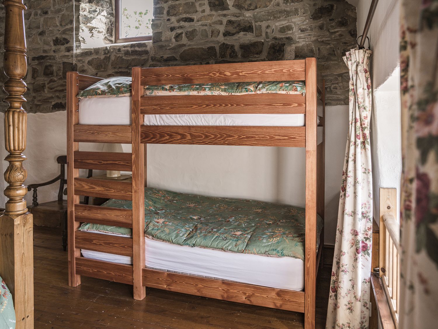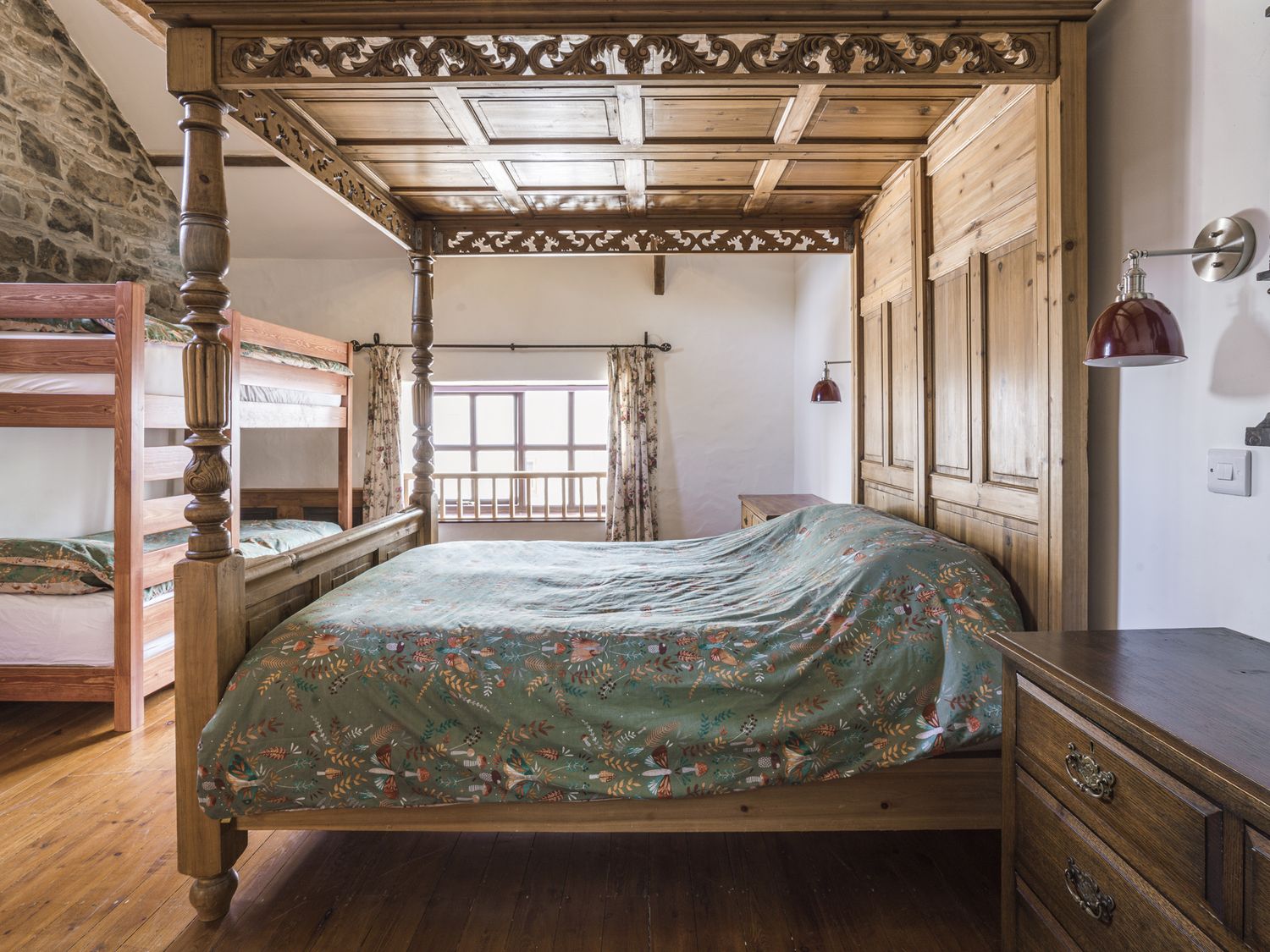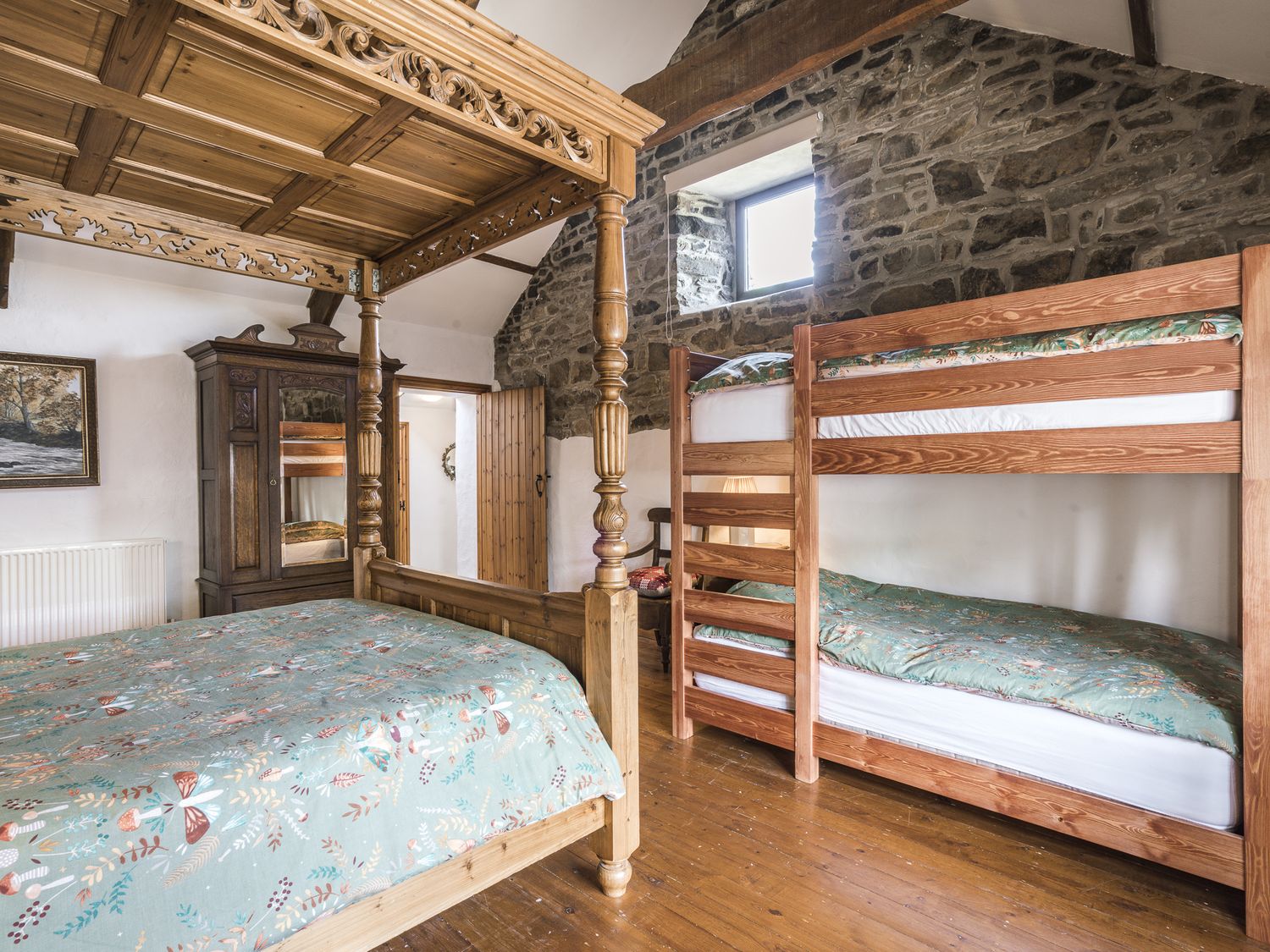"Three bedrooms: 1 x ground-floor double, 1 x double, 1 x family room with king size 4 poster bed and bunk beds with double/super single sized mattresses (3ÔÇÿ6ÔÇ£). Bathroom with bath, basin, WC. Ground-floor wet room with walk-in shower, basin, WC. Kitchen/diner. Sitting room with woodburning stove"