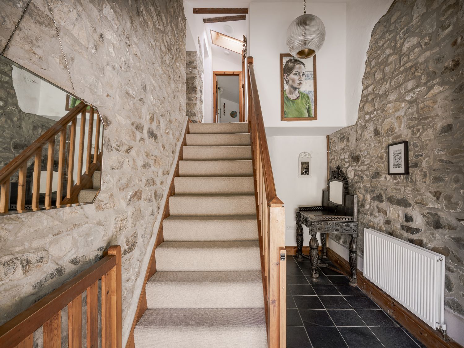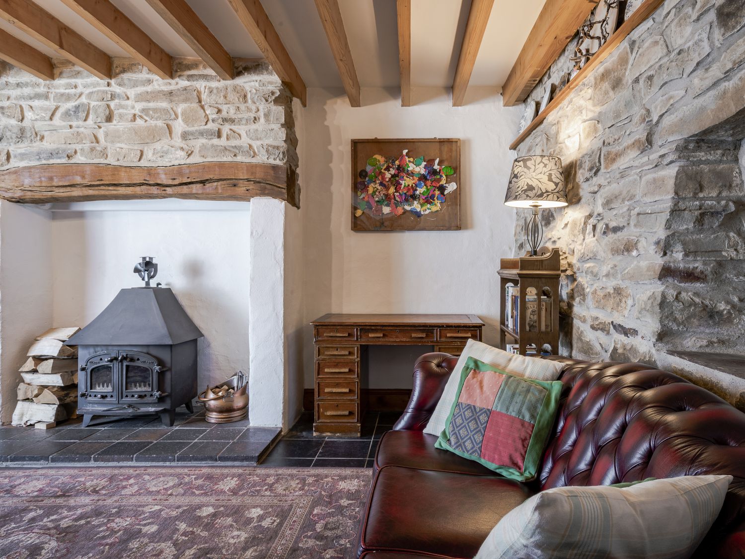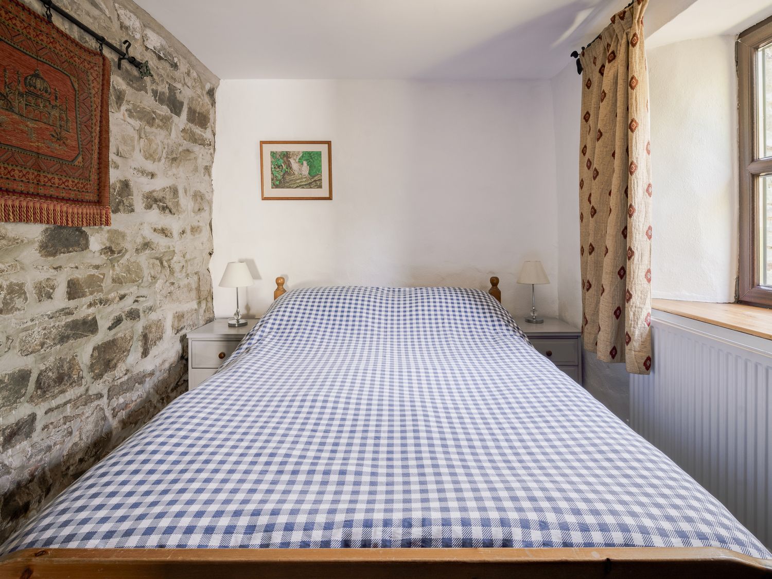 "Three bedrooms: 1 x ground-floor double, 1 x double, 1 x family room with king size 4 poster bed and bunk beds with double/super single sized mattresses (3ÔÇÿ6ÔÇ£). Bathroom with bath, basin, WC. Ground-floor wet room with walk-in shower, basin, WC. Kitchen/diner. Sitting room with woodburning stove"