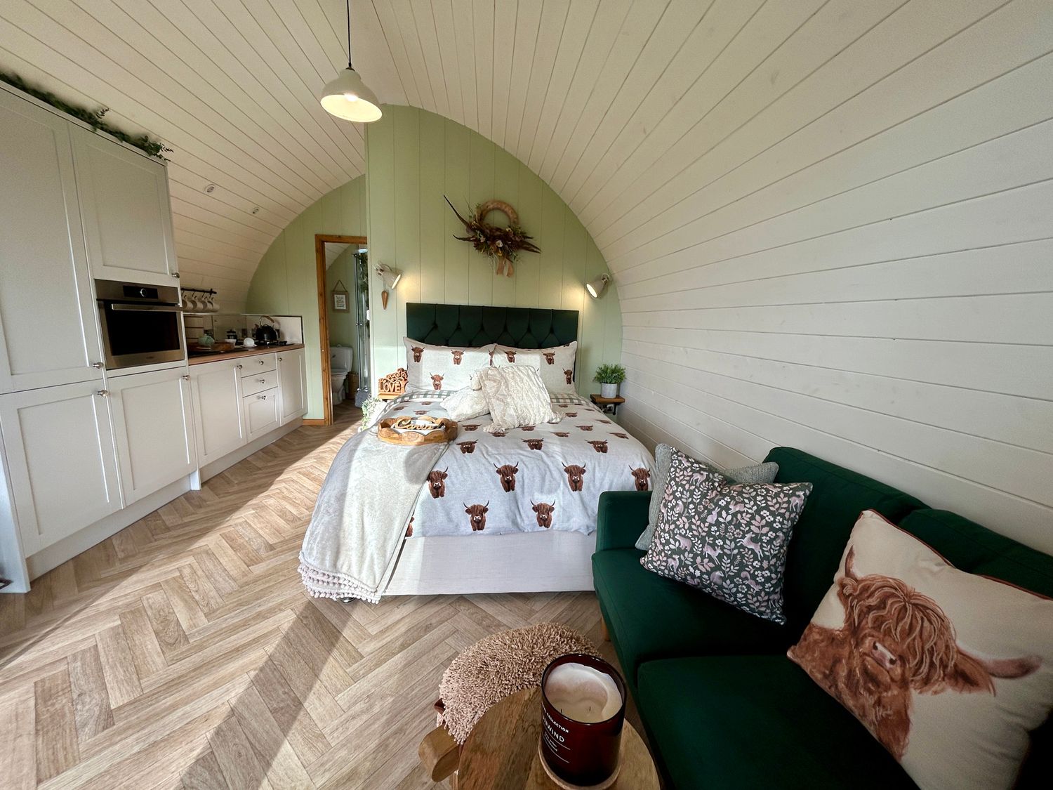 "Willow consists of a family bedroom with bunk and single, plus a studio-style layout with double bed, kitchen with gas hob, combi microwave/oven, fridge with ice box, a dining space, and sitting area with Smart TV, serviced by a shower room. Outside there us a non-enclosed gravelled area with hot tub and furniture, plus off-road parking for two cars. Within 1.2 miles or less you will find a shop and a pub, and please note this is a smoke-free and pet-free property. Highchair and travel cot available. WiFi, fuel, power, bed linen, and towels included in the rent. Explore Powys with a stay at Willow. Please note: this property only accepts week long Christmas stays. Note: Two steps up to the property. Note: This property has a Good Housekeeping bond of -ú250."
