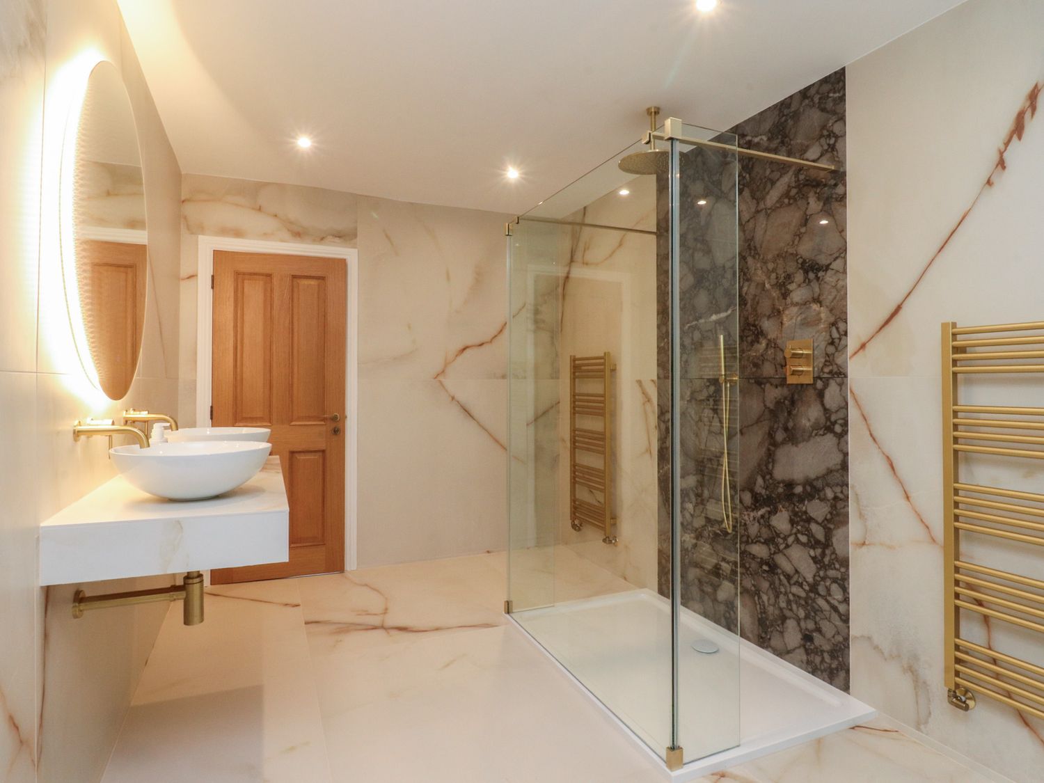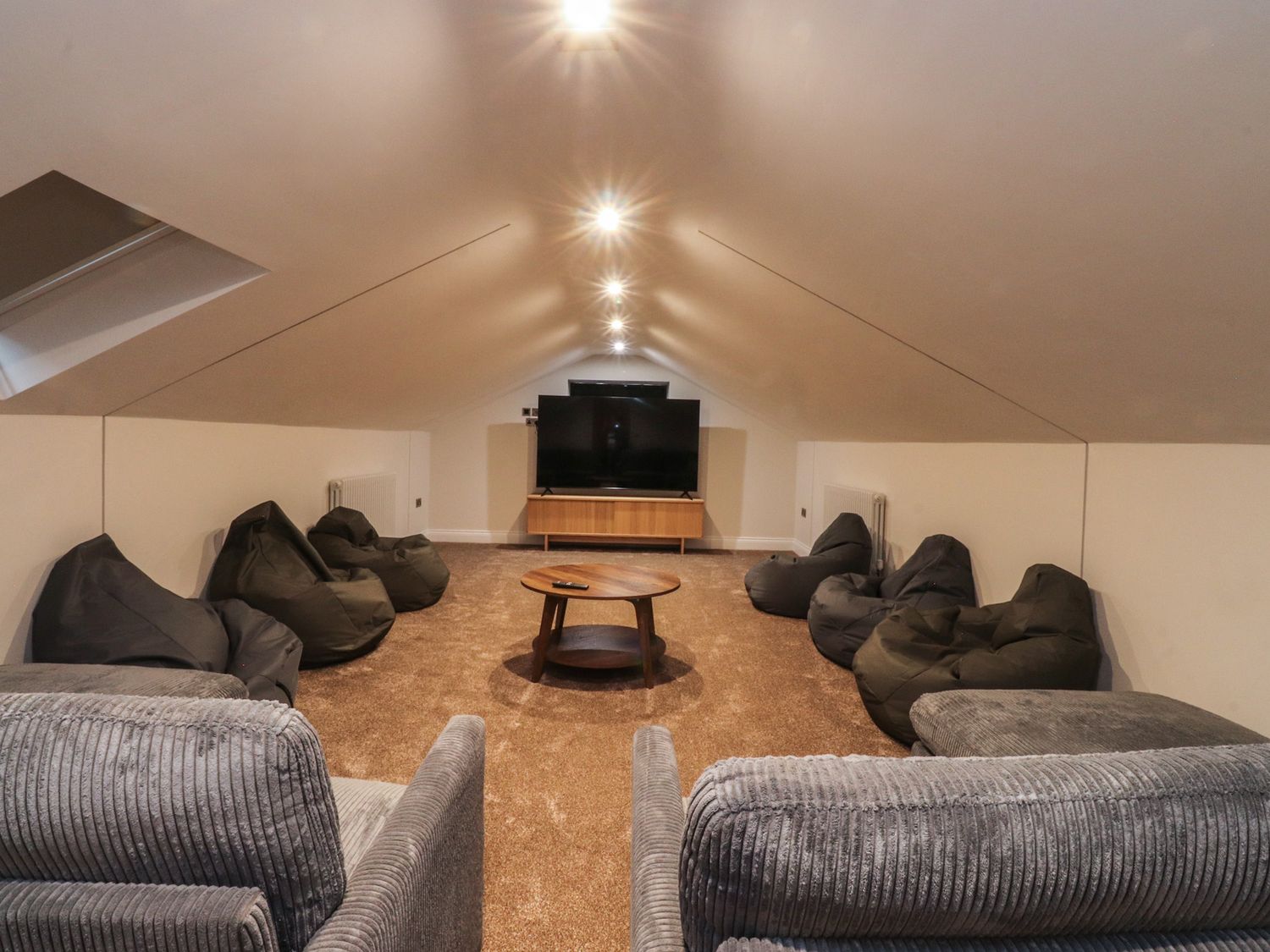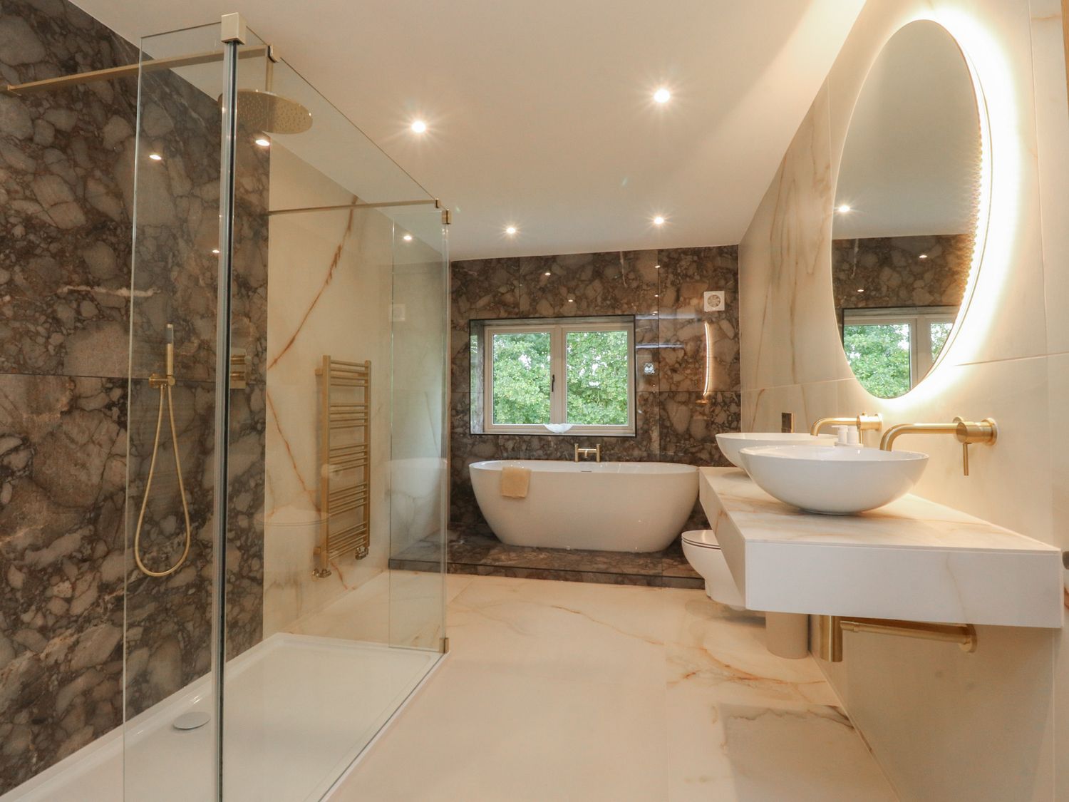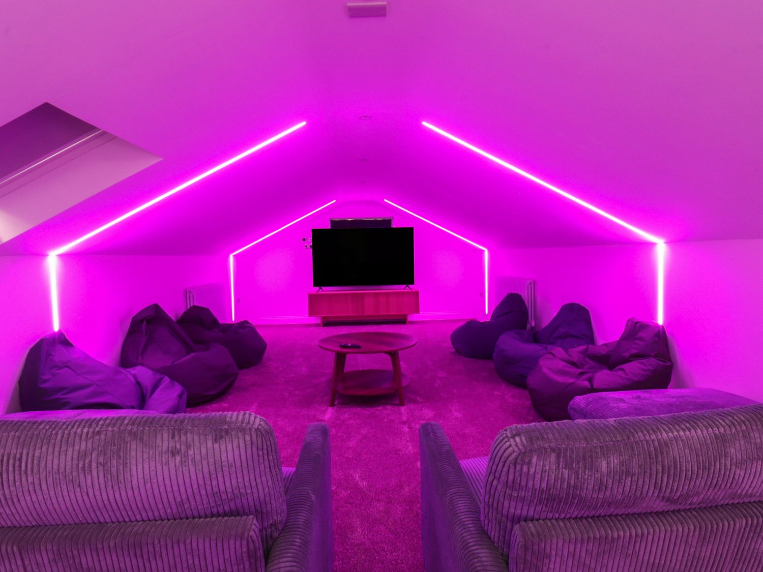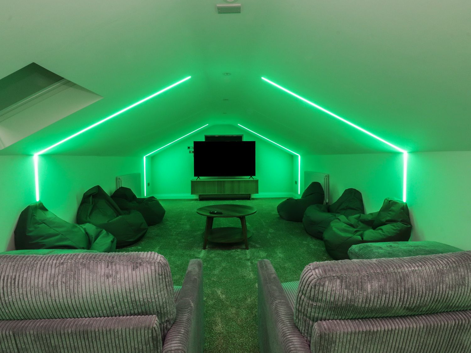 "Five bedrooms: 1 x king-size, 2 x king-size with en-suite with walk-in shower, basin, and heated towel rail and WC, 1 x twin, 1 x family room. Bathroom with freestanding bath, walk-in shower, double basin, heated towel rail. Shower room with walk-in shower, basin, heated towel rail, WC. Kitchen/diner. Utility. Dining room. Sitting room. Snug. Game room with Smart TV. Cloakroom with Basin and WC. Cinema room with Smart TV"