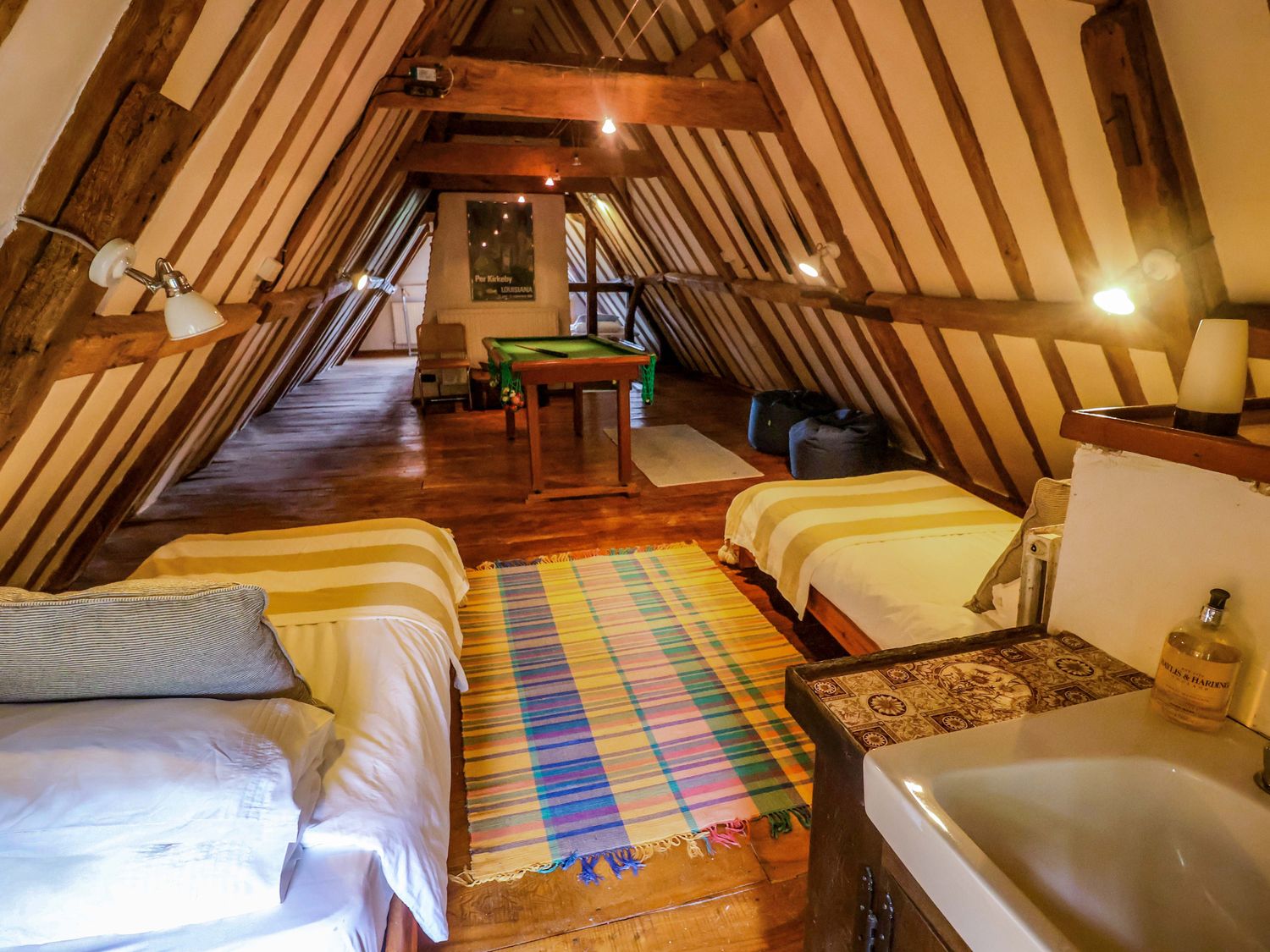 "Over three floors. Three bedrooms: 1 x double, 1 x double with en-suite with bath, shower over, basin, and WC, 1 x second-floor family room with four single beds and a pool table. Ground-floor bathroom with bath, basin, WC. Kitchen. Utility. Dining room with woodburning inglenook fireplace. Sitting room with woodburning iglenook fireplace"