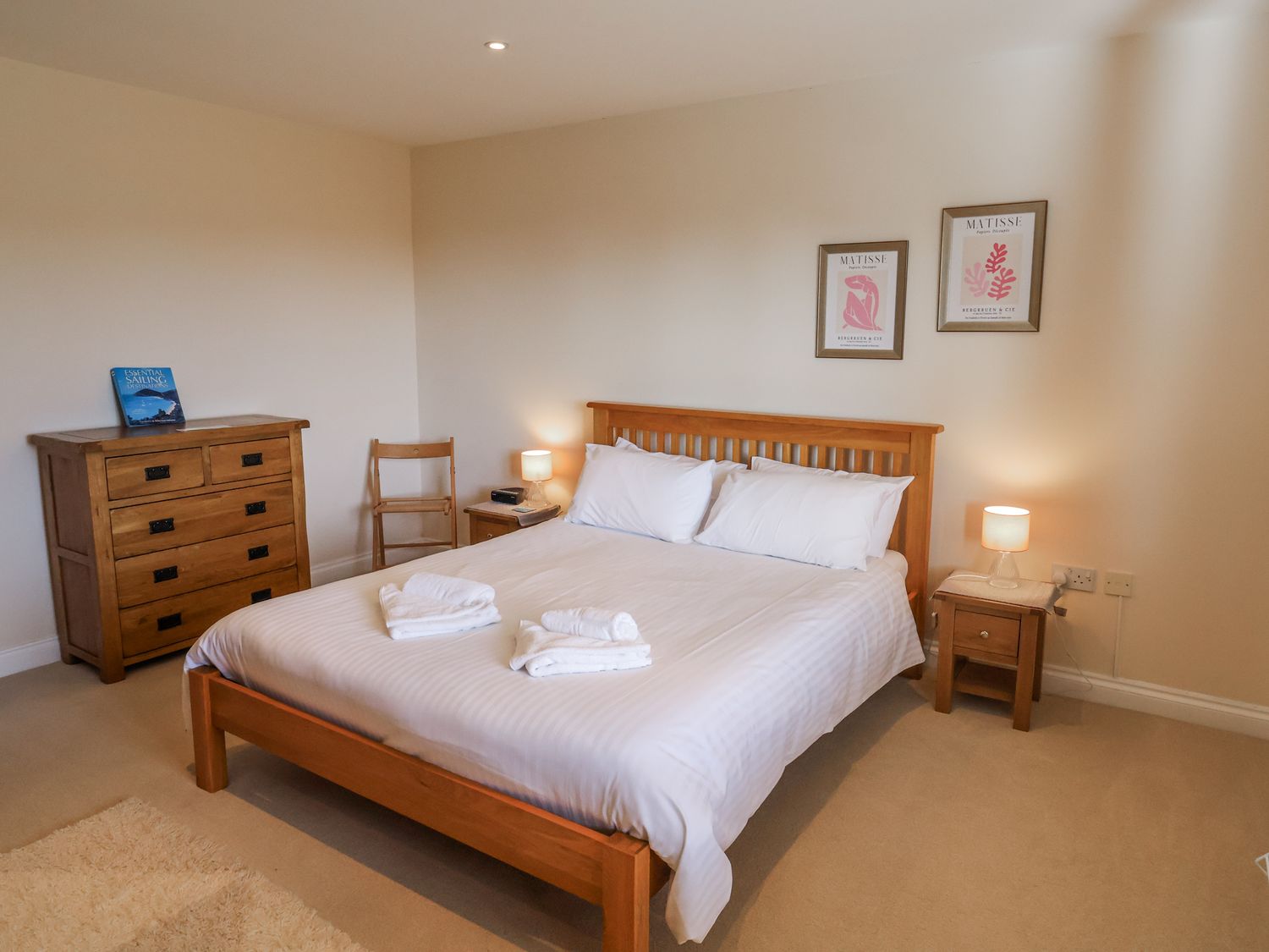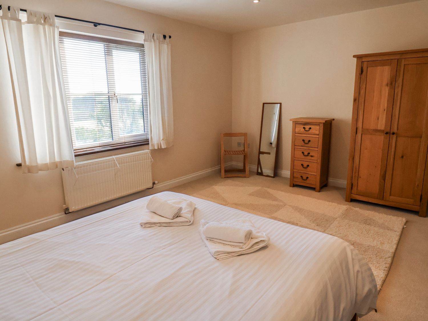 "Five bedrooms: 1 x king-size with en-suite walk-in shower, basin, heated towel rail, and WC, 1 x king size, 1 x twin, 1 x single, 1 x ground-floor double. Bathroom with bath, shower over, basin, and WC. Cloakroom with basin and WC. Kitchen. Utility. Living/dining room with woodburning stove. Travel cot but no bedding provided."