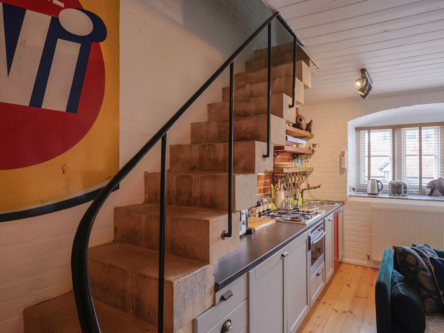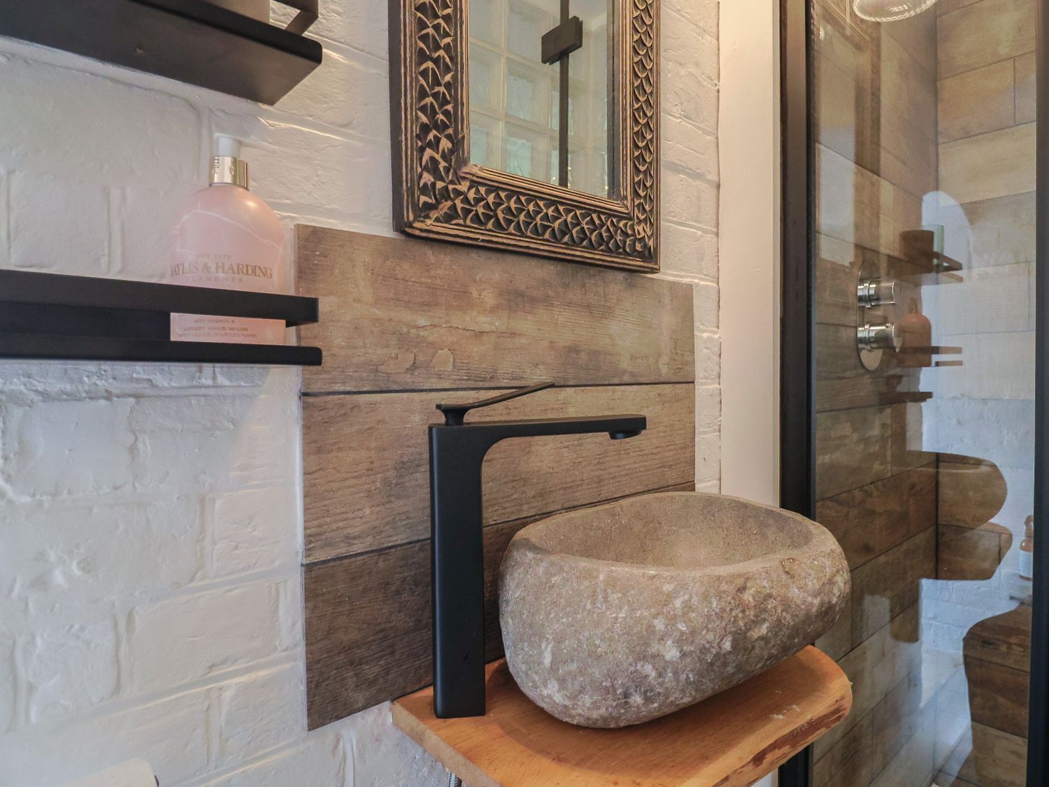 "Accommodation arranged over four floors. Second-floor king-size bedroom with en-suite walk-in rainfall shower, stone wash basin and WC. First-floor open-plan living space with kitchen, dining and living area. Ground floor cloakroom with basin and WC."