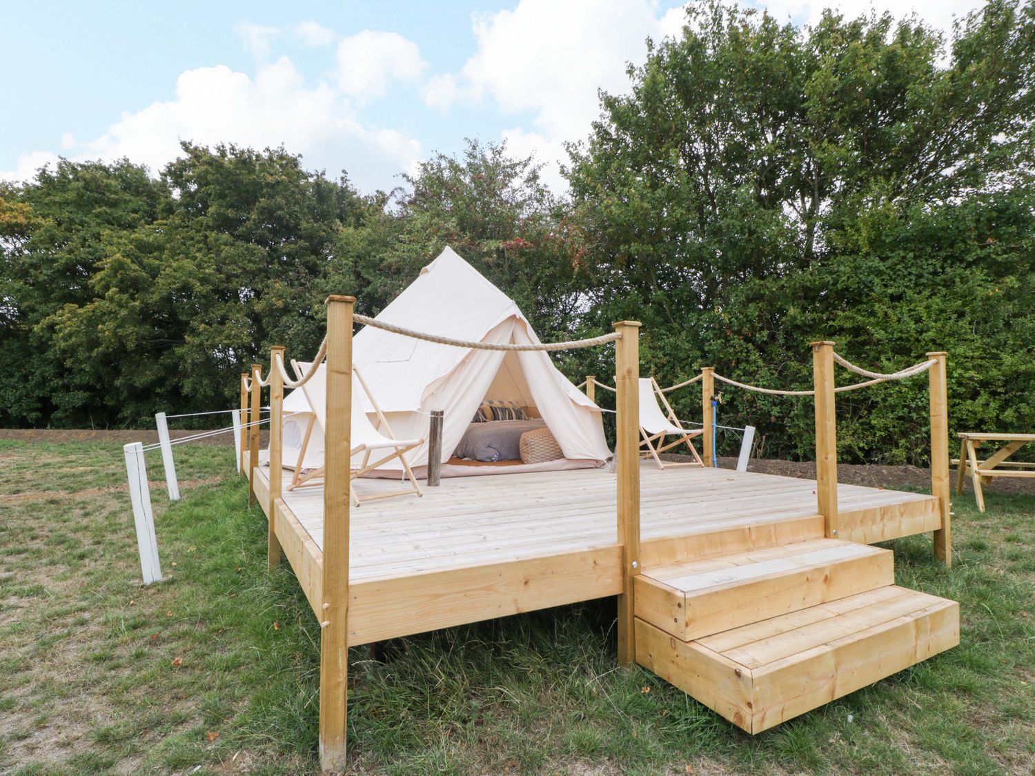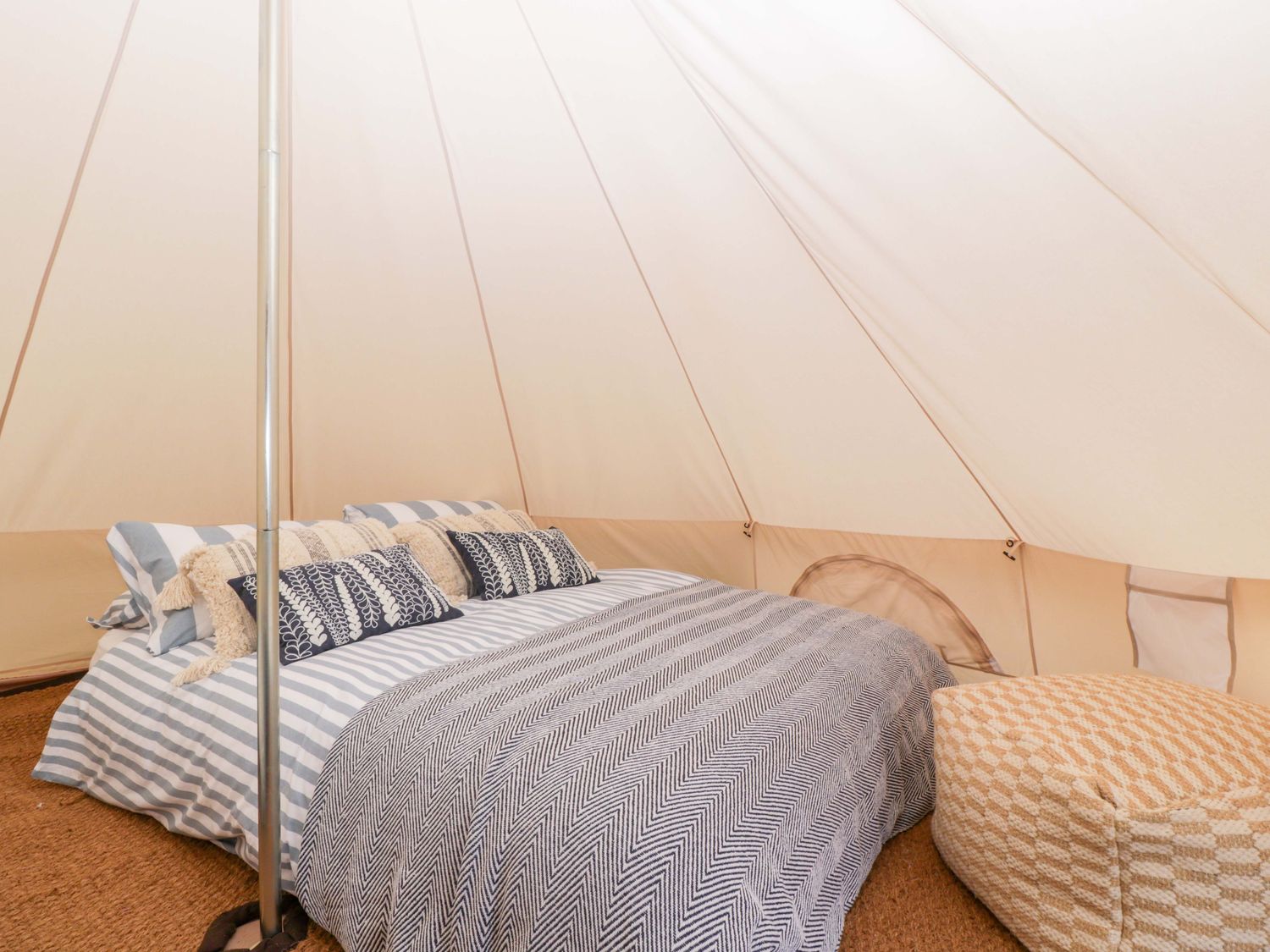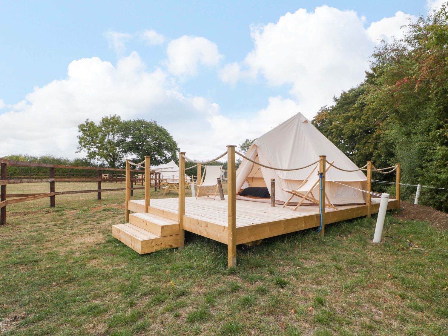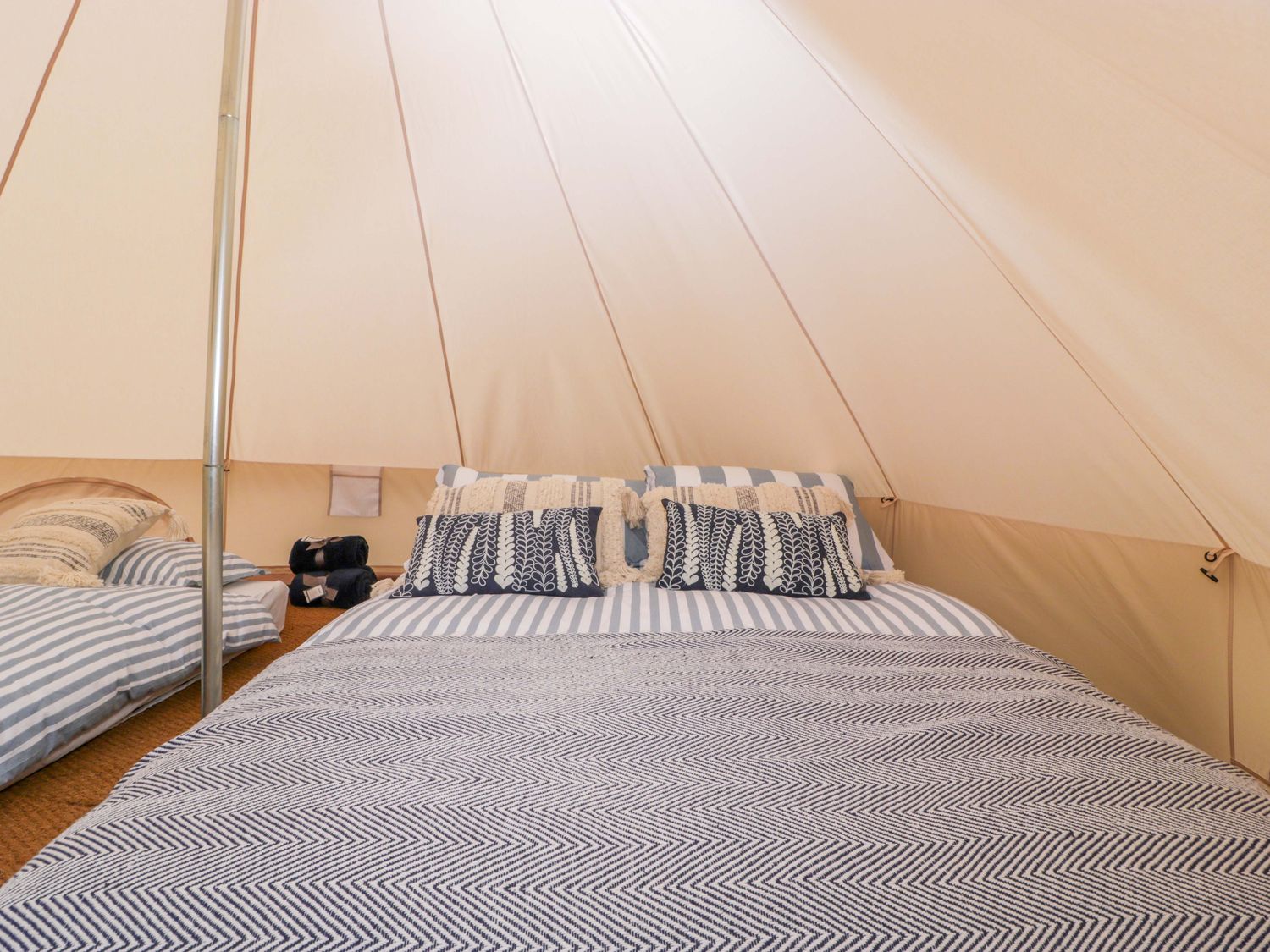 "Bell 2, a bell tent, consists of a studio-style living space with a double bed, twin bed (and can accommodate any configuration sleeping up to six on request), fridge, kettle, and living area, along with a communal kitchen and communal shower/toilet block. You'll find a shop in 1.1 miles and a pub in 1.6 miles. WiFi, fuel, power, bed linen, and towels are included in the rent. Outside, there is an open decking with a communal fire pit and off-road parking for three cars. Travel cot, highchair, and stairgate available on request. Two well-behaved pets are welcome. Sorry, no smoking. Whatever the weather, a wonderful stay awaits at Bell 2. Note: Good housekeeping bond of 100 GBP. Note: Disposable barbecues available on request. Note: Please respect the Countryside Code as there are horses on-site and sheep nearby. Note: Please take care with children, as there is a stream nearby. Note: Pod can sleep any configuration up to six people. Note: Property has stables and can offer livery."