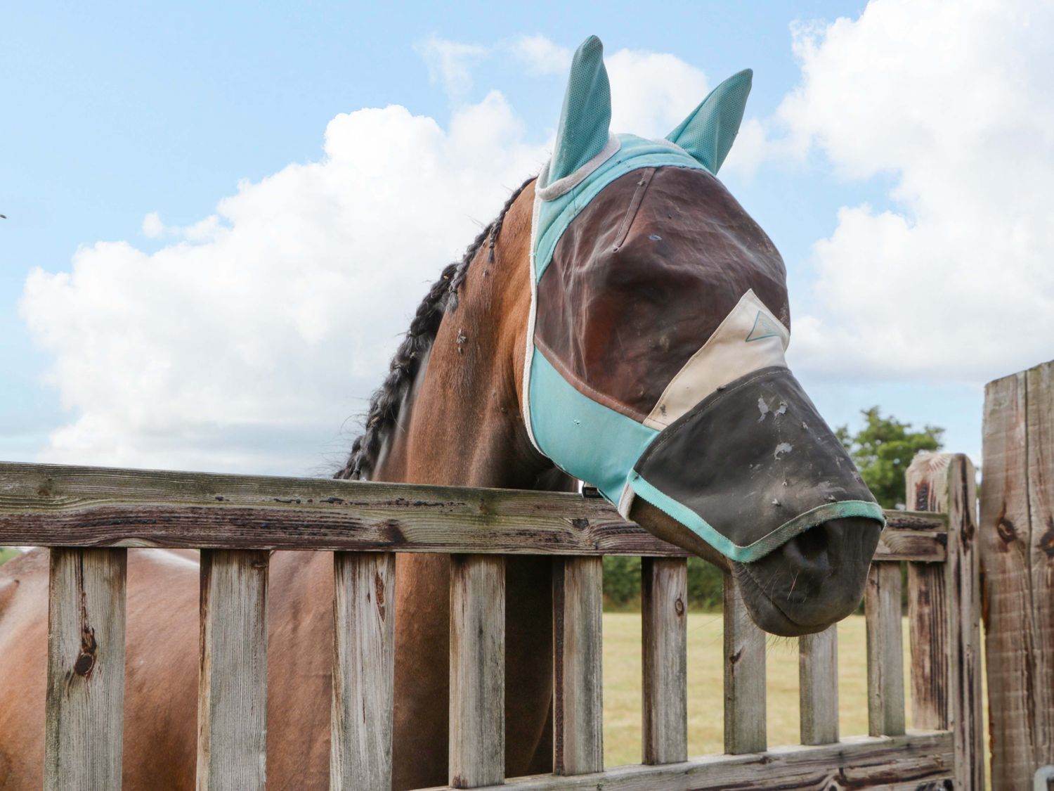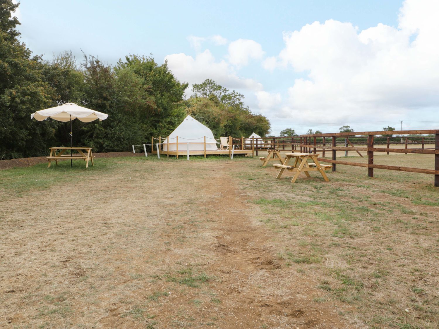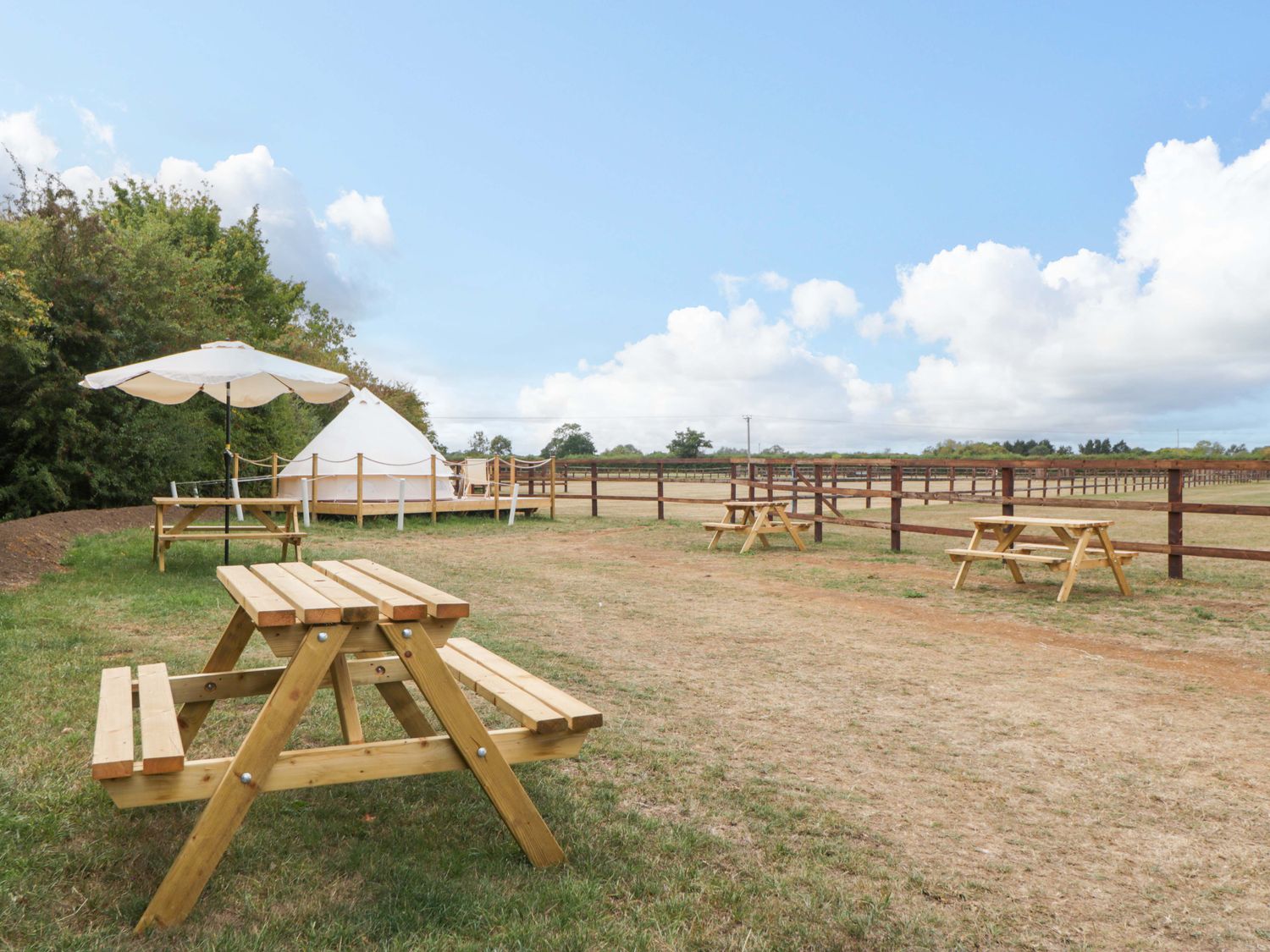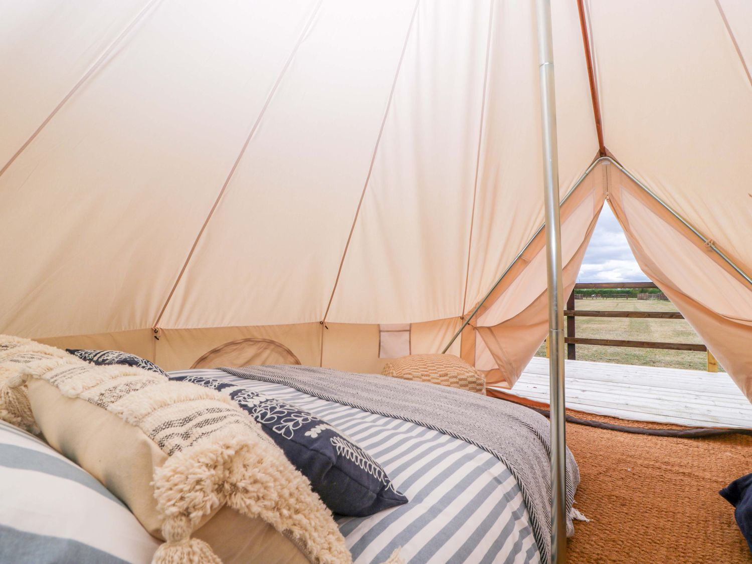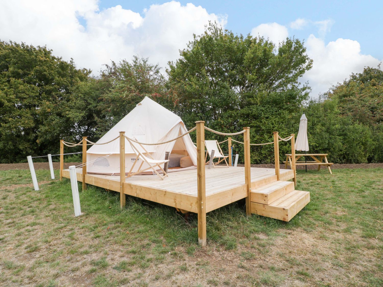 "Bell 2, a bell tent, consists of a studio-style living space with a double bed, twin bed (and can accommodate any configuration sleeping up to six on request), fridge, kettle, and living area, along with a communal kitchen and communal shower/toilet block. You'll find a shop in 1.1 miles and a pub in 1.6 miles. WiFi, fuel, power, bed linen, and towels are included in the rent. Outside, there is an open decking with a communal fire pit and off-road parking for three cars. Travel cot, highchair, and stairgate available on request. Two well-behaved pets are welcome. Sorry, no smoking. Whatever the weather, a wonderful stay awaits at Bell 2. Note: Good housekeeping bond of 100 GBP. Note: Disposable barbecues available on request. Note: Please respect the Countryside Code as there are horses on-site and sheep nearby. Note: Please take care with children, as there is a stream nearby. Note: Pod can sleep any configuration up to six people. Note: Property has stables and can offer livery."