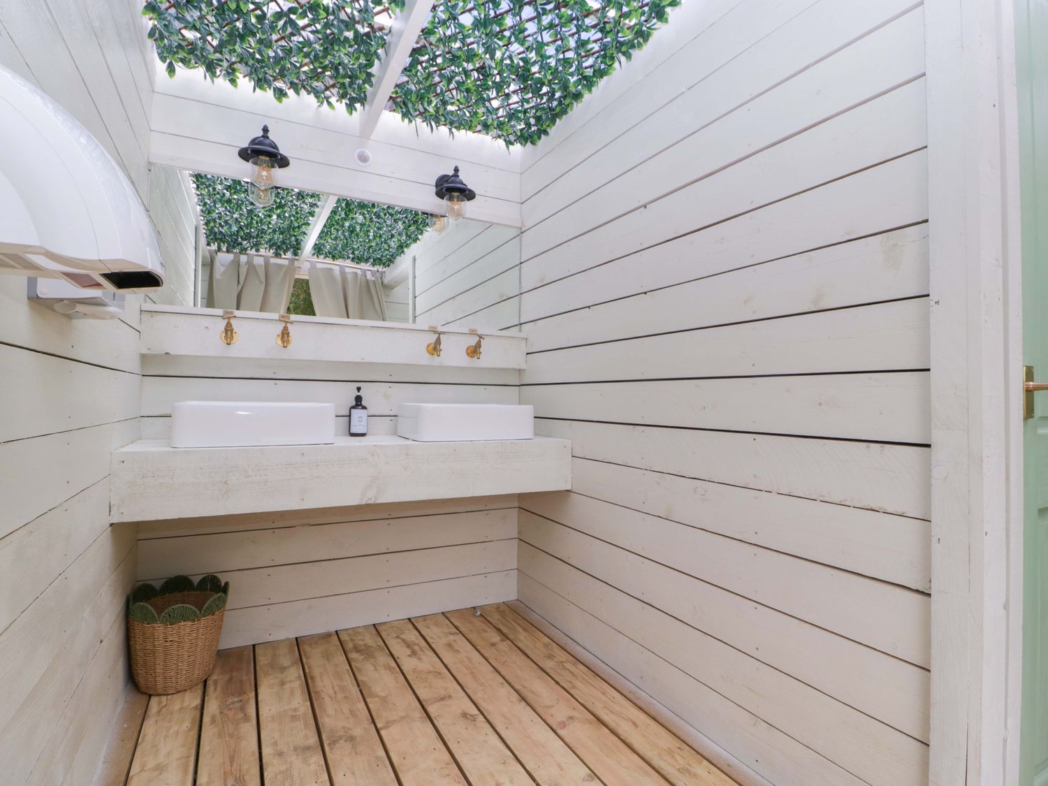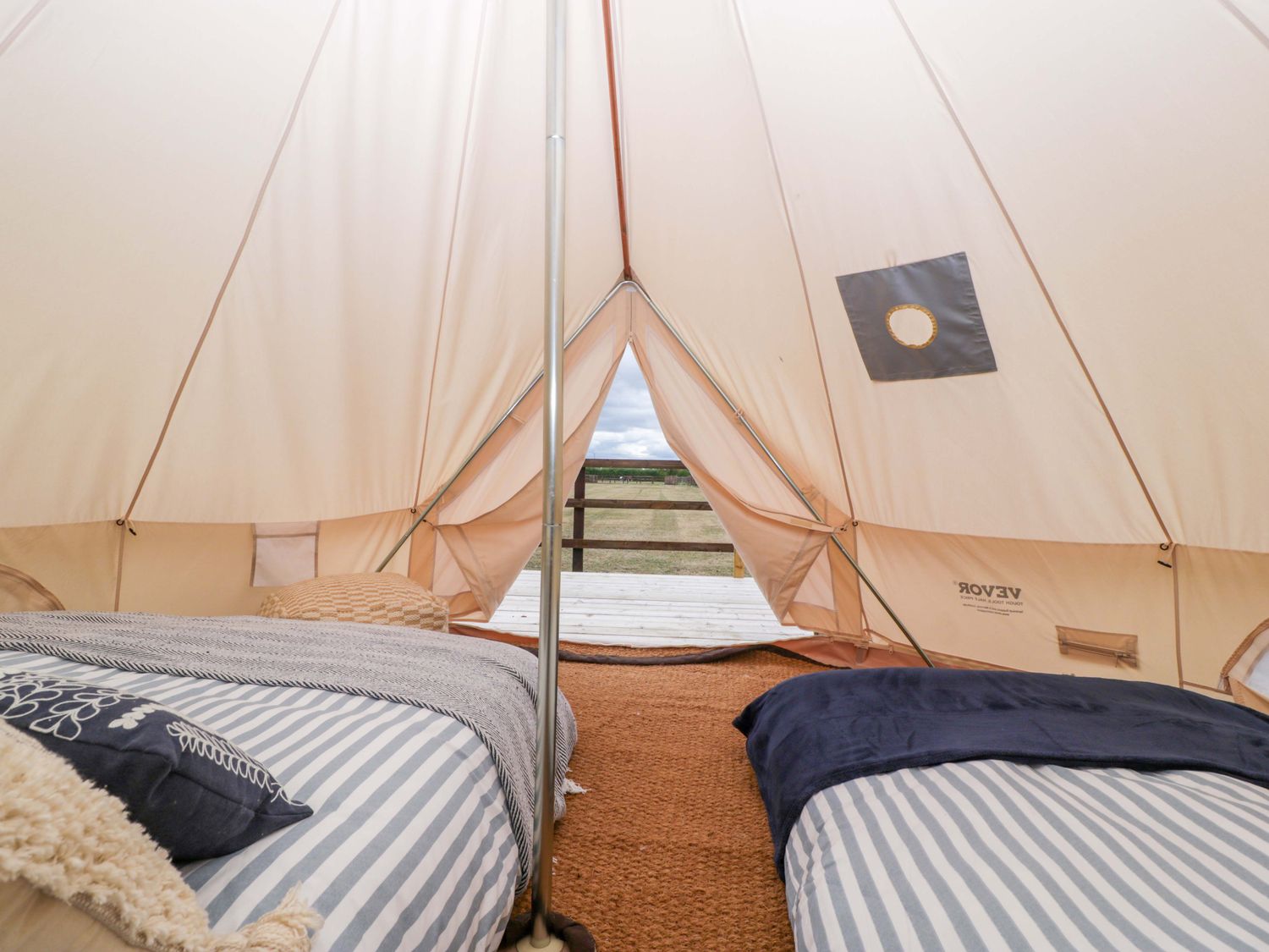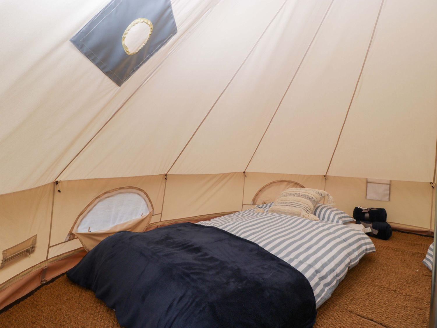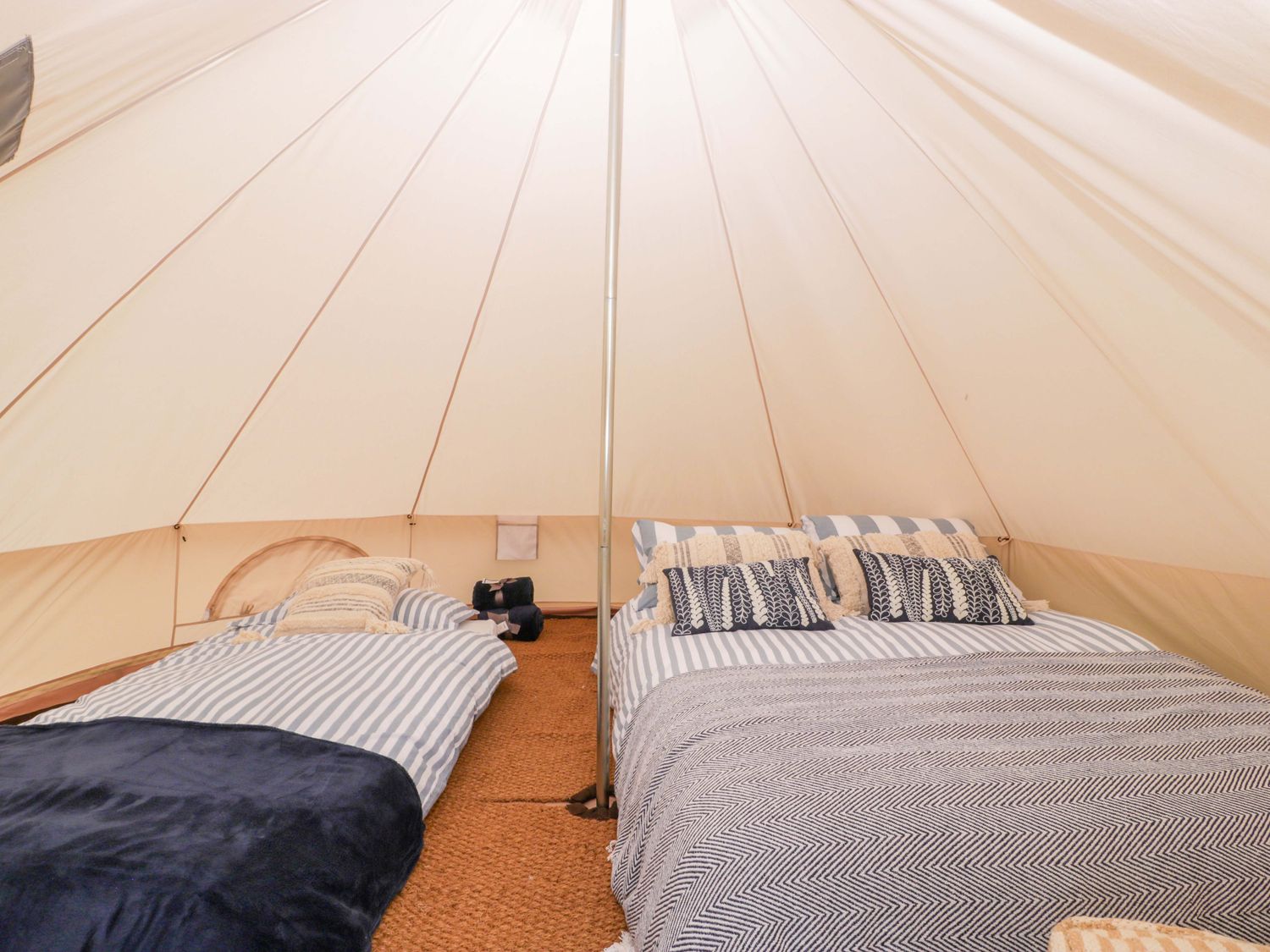 Single-storey Bell Tent. Studio-style living space with a double bed and twin beds and living area. Communal kitchen with microwave. Communal shower/toilet block