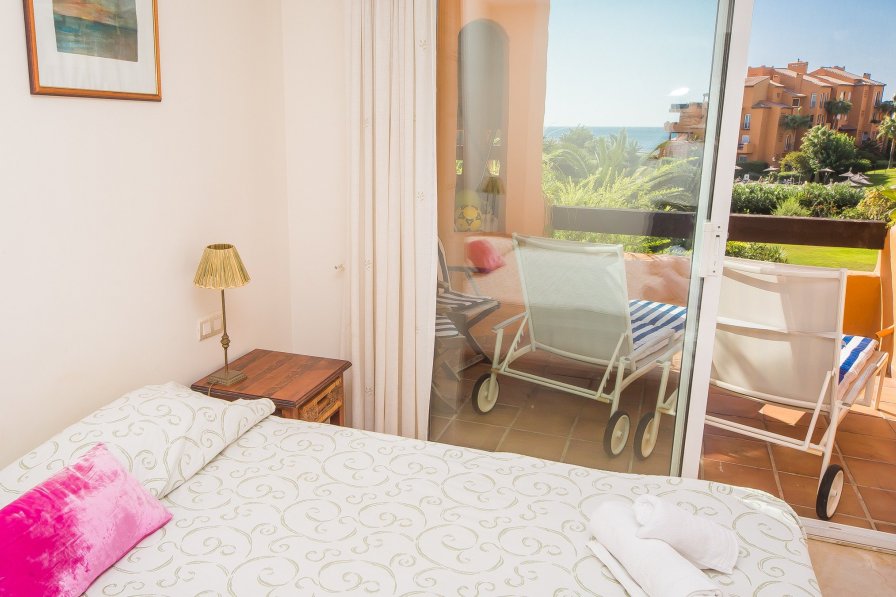 South west facing first floor three bedroom apartment with air conditioning and wifi. The apartment also has a fully fitted recently refurbished kitchen, 2 full bathrooms and a large lounge with patio doors leading to the balcony. The balcony has views of the well kept gardens and sea. The complex is located on the beachfront and has a large lagoon style swimming pool, underground parking, 24 hour security and is just a short walk to either Castillo de la Duquesa or Puerto de la Duquesa.