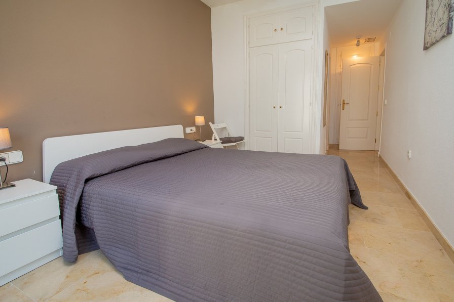 A very well presented and furnished two bedroom, second floor apartment. The apartment has air conditioning, two bathrooms, fully fitted kitchen and lounge/diner with patio doors leading on to the terrace. The terrace is a nice size and has pool and sea views. Located in a beachfront complex with four swimming pools, a small gym, padel tennis courts, underground parking, 24 hr security and is just a short stroll to the marina.