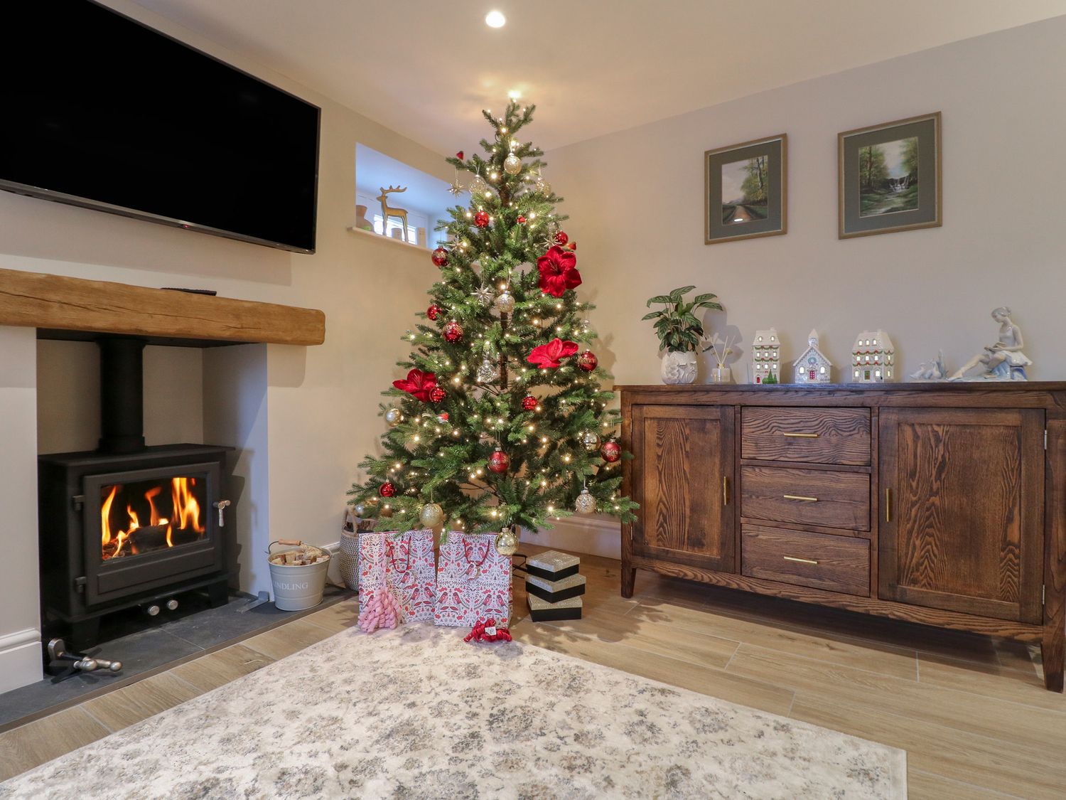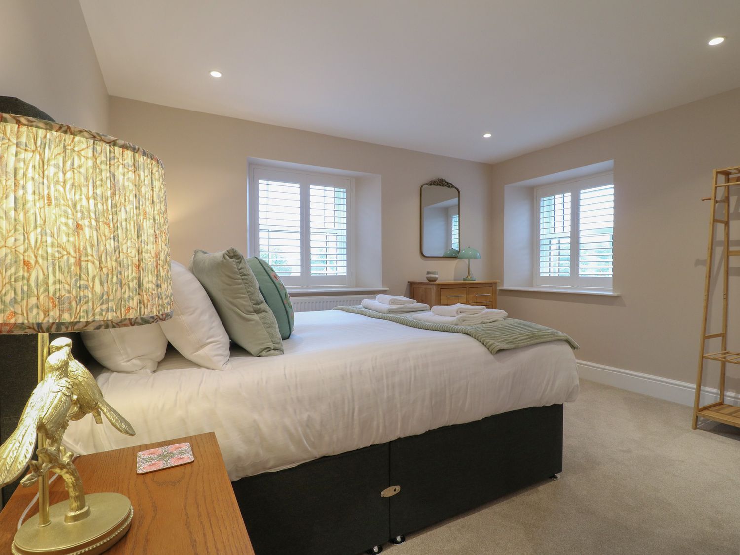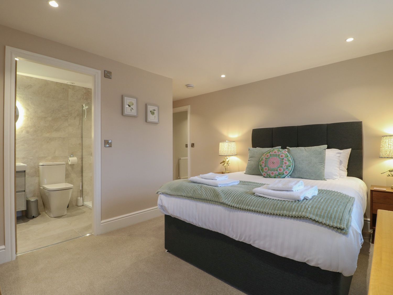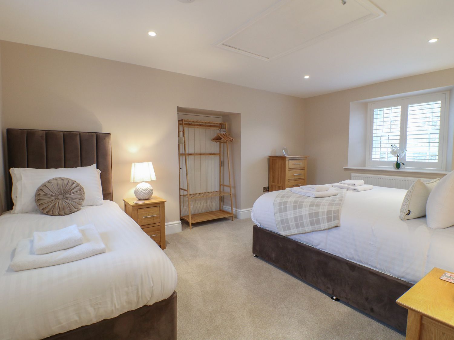 "Three bedrooms. Two bedrooms with king-size bed and en-suite with walk-in shower, basin, and WC. One family room with 1 single bed and 1 super-king bed (this is a zip/link which can be twin on request). En-suite bathroom with walk-in shower, bath with a handheld shower attachment, basin, and WC. Cloakroom with basin and WC. Kitchen/diner with TV. Utility. Sitting room with woodburning stove"